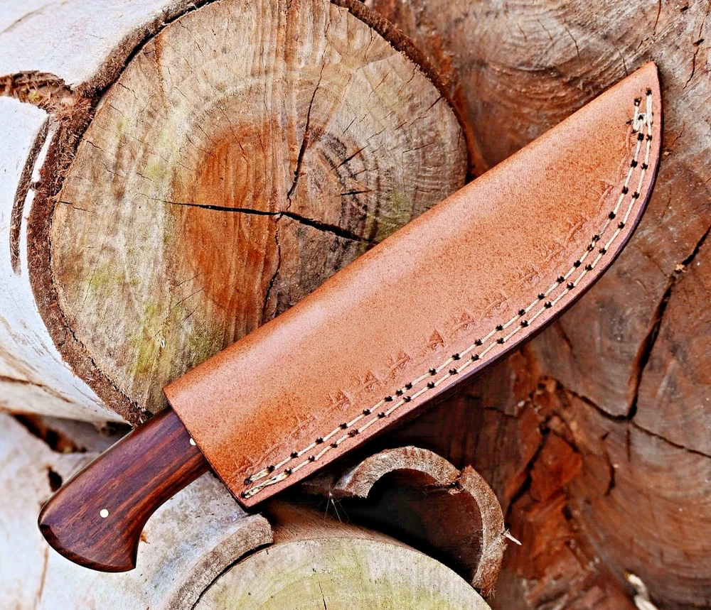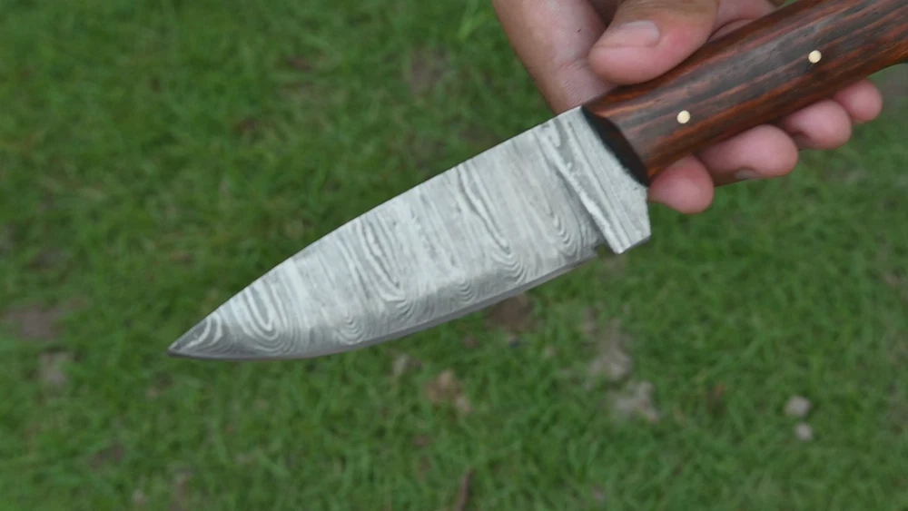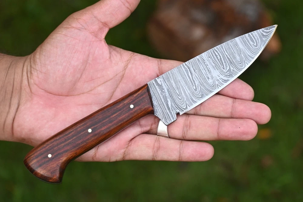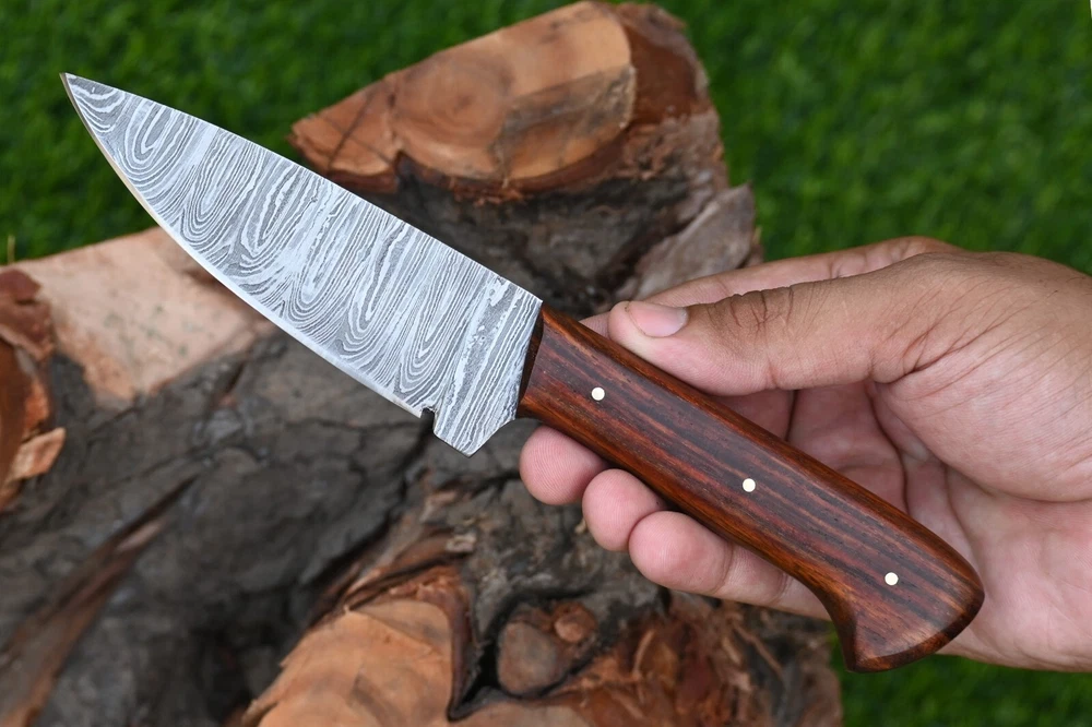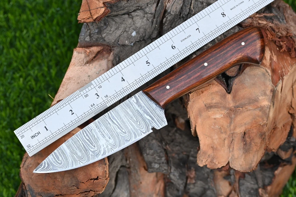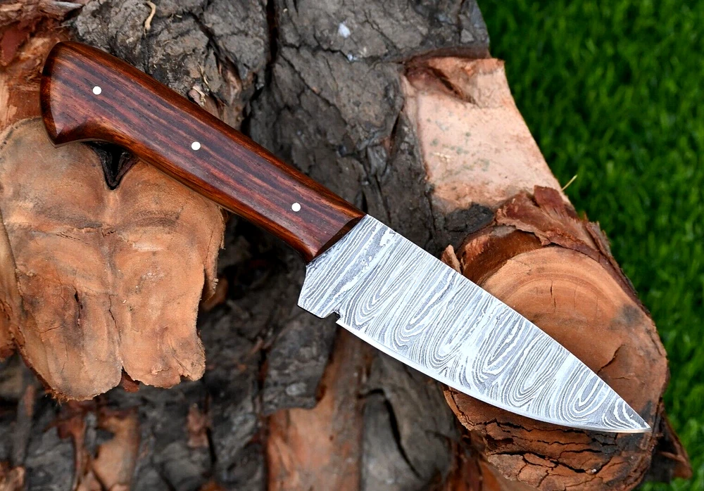 CUSTOM MADE HAND FORGED DAMASCUS STEEL SKINNER KNIFE HUNTING CAMPIN SURVIVAL HIKING KNIFE Wood Handle This superb design knife is hand forged. Blade of this knife has a nice file work and is made of 512 layers of 4340 stainless steel and 1075 high carbon steel and hardness 55-58 HRC . This robust knife is lab tested under intense conditions, the balance and shape of this knife ensures perfect grip. Overall Length: 9" Inches Blade Length: 5" Inches Handle Length: 4" Inches Damascus Design: Rain Drop Pattern Layers: 512 Hardness: 55-58 HRC Package Includes: with Leather Sheath Warning: Keep fingers clear of blades. Store away from children.