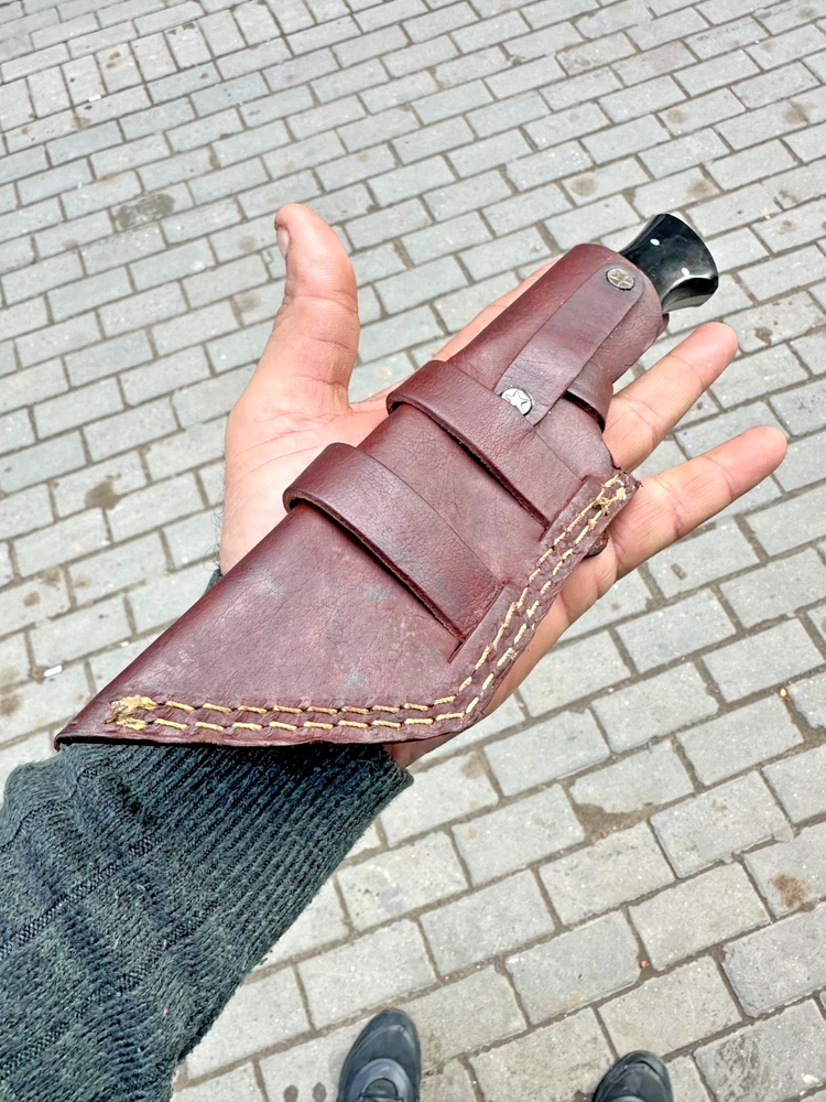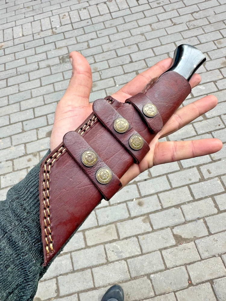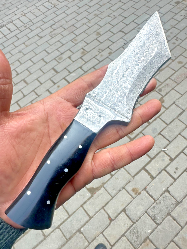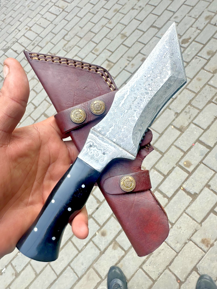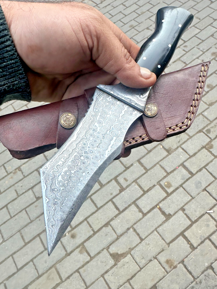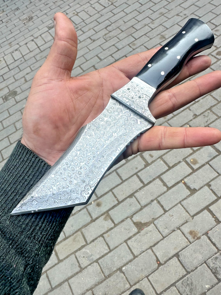 CUSTOM MADE HAND FORGED DAMASCUS STEEL TRACKER KNIFE HUNTING CAMPING BUSHCRAFT KNIFE Bull Horn Handle This superb design knife is hand forged. Blade of this knife has a nice file work and is made of 512 layers of 4340 stainless steel and 1075 high carbon steel and hardness 55-58 HRC . This robust knife is lab tested under intense conditions, the balance and shape of this knife ensures perfect grip. Overall Length: 10.5" Inches Blade Length: 5.5" Inches Handle Length: 5" Inches Damascus Design: Rain Drop Pattern Layers: 512 With Leather Sheath
