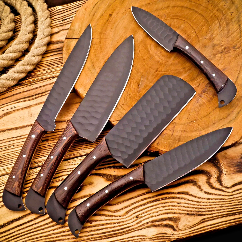 Making Method: HAND MADE Set Includes: Chef's Knife, Cleaver, Fillet & Larding Knives, Steak Knife, PARING KNIFE Handle Material: WOOD HANDLE Number of Items in Set: 5 Blade Edge: VERY SHARP Type: Chef's Knife Features: With Handles Brand: M DAMASCUS Material: Carbon Steel Blade Length: 3.5" TO 7.25" INCHES Food Compatibility: Candy, Cheese, Fruit, Meat, Salad, Universal, Vegetables Color: Black MPN: N/A Personalize: No