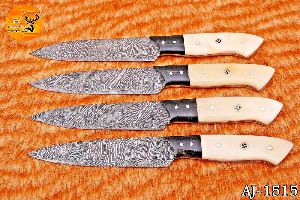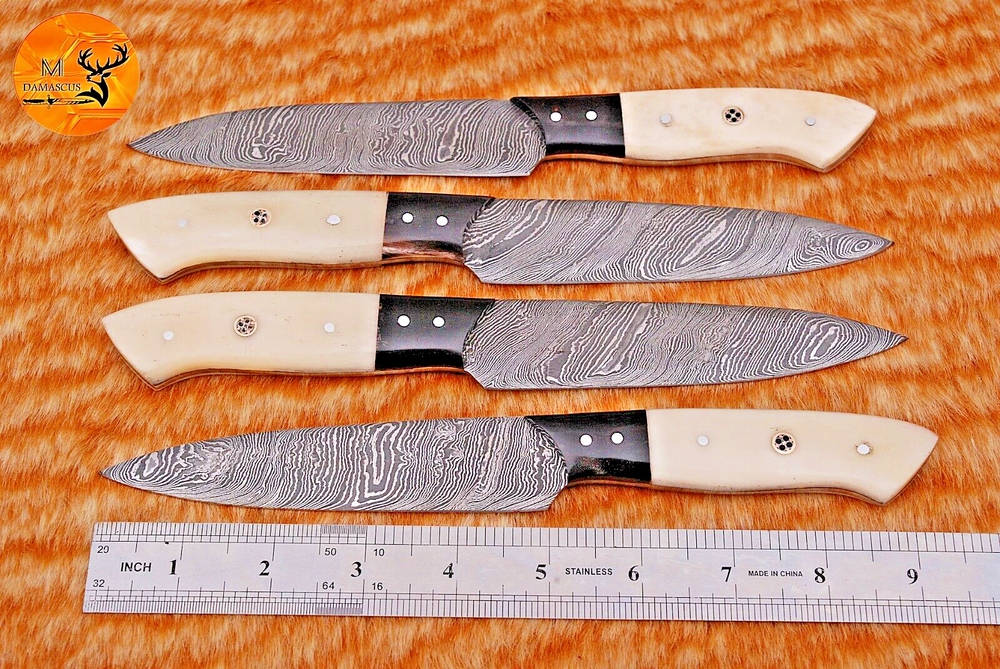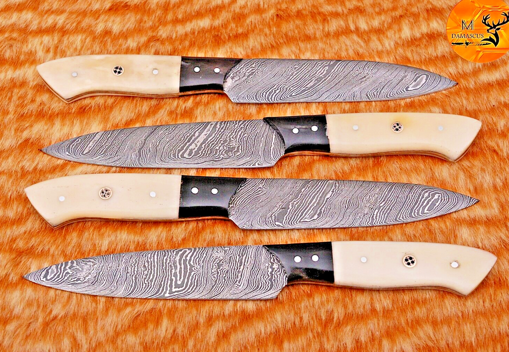 Blade Length: 4.5" INCH Number of Items in Set: 4 Blade Edge: Straight Food Compatibility: Fruit, Meat, Vegetables, Salad, Universal Custom Bundle: Yes Handle Material: Damascus Steel Color: Black Brand: Handmade Set Includes: Chef's Knife, Knife Set, Steak Knife MPN: N/A Features: With Handles Material: Damascus Steel Type: Chef's Knife Personalize: No