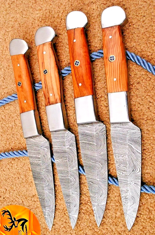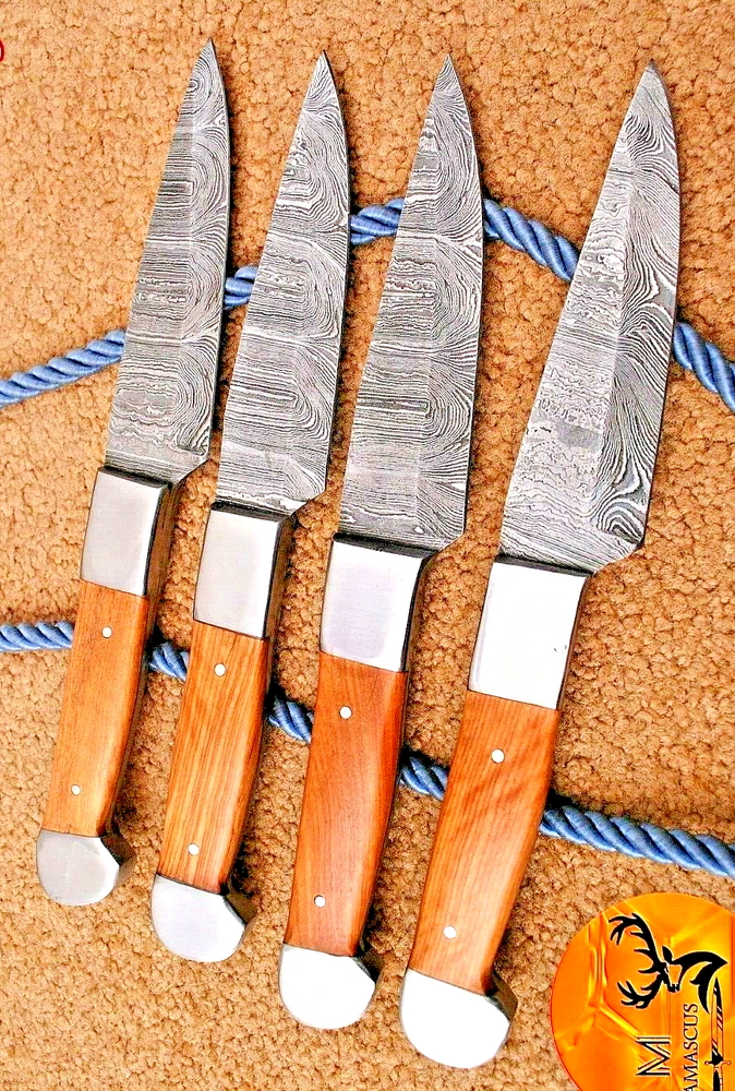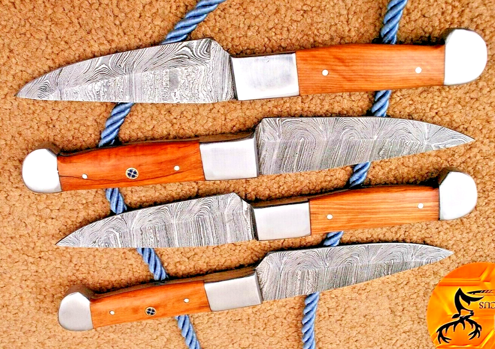Food Compatibility: Fruit, Salad, Universal, Vegetables Color: Brown Set Includes: Chef's Knife, Knife Set, Steak Knife Personalize: No Brand: Handmade Features: With Handles Blade Length: 4.25" INCHES Material: Damascus Steel Handle Material: WOOD & STEEL BOLSTER HANDLE Custom Bundle: Yes Type: Steak Knife MPN: N/A Making Method: Compressor Blade Edge: VERY SHARP Number of Items in Set: 4