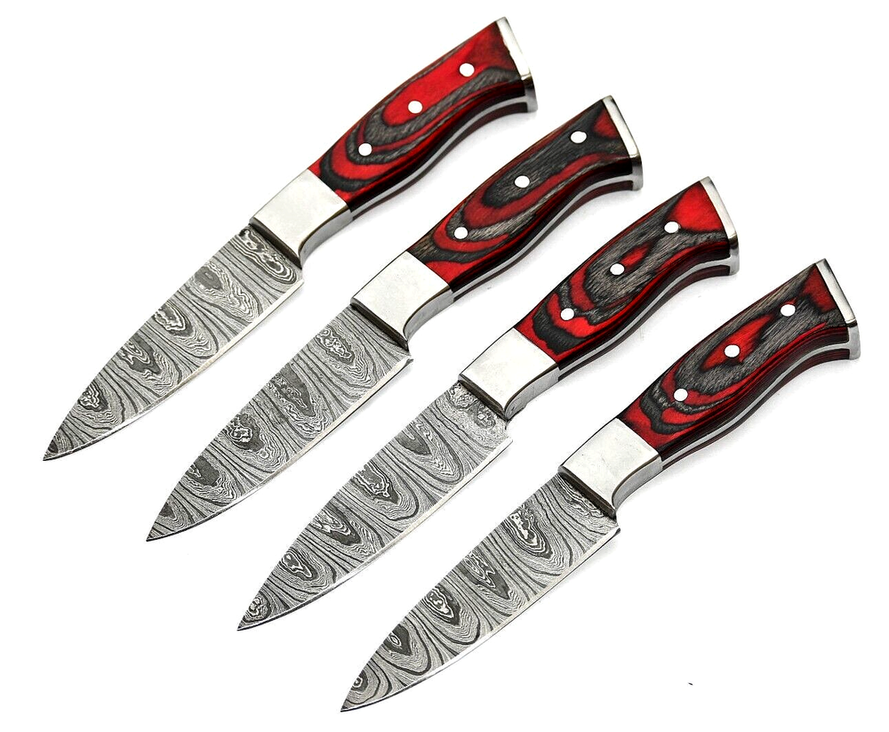 FOUR CUSTOM HAND MADE CHEF STEAK KNIFE SET HAND FORGED DAMASCUS STEEL BLADE WOOD Handle This superb design knife is hand forged. Blade of this knife has a nice file work and is made of 512 layers of 4340 stainless steel and 1075 high carbon steel and hardness 55-58 HRC . This robust knife is lab tested under intense conditions, the balance and shape of this knife ensures perfect grip. Overall Length: 9" Inches Blade Length: 5" Inches Handle Length: 4" Inches Damascus Design: Twist Pattern Layers: 512 Hardness: 55-58 HRC Warning: Keep fingers clear of blades. Store away from children.