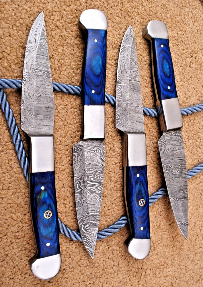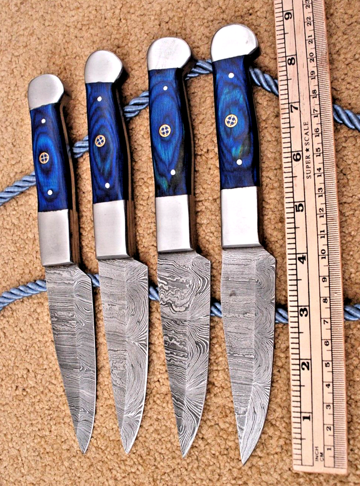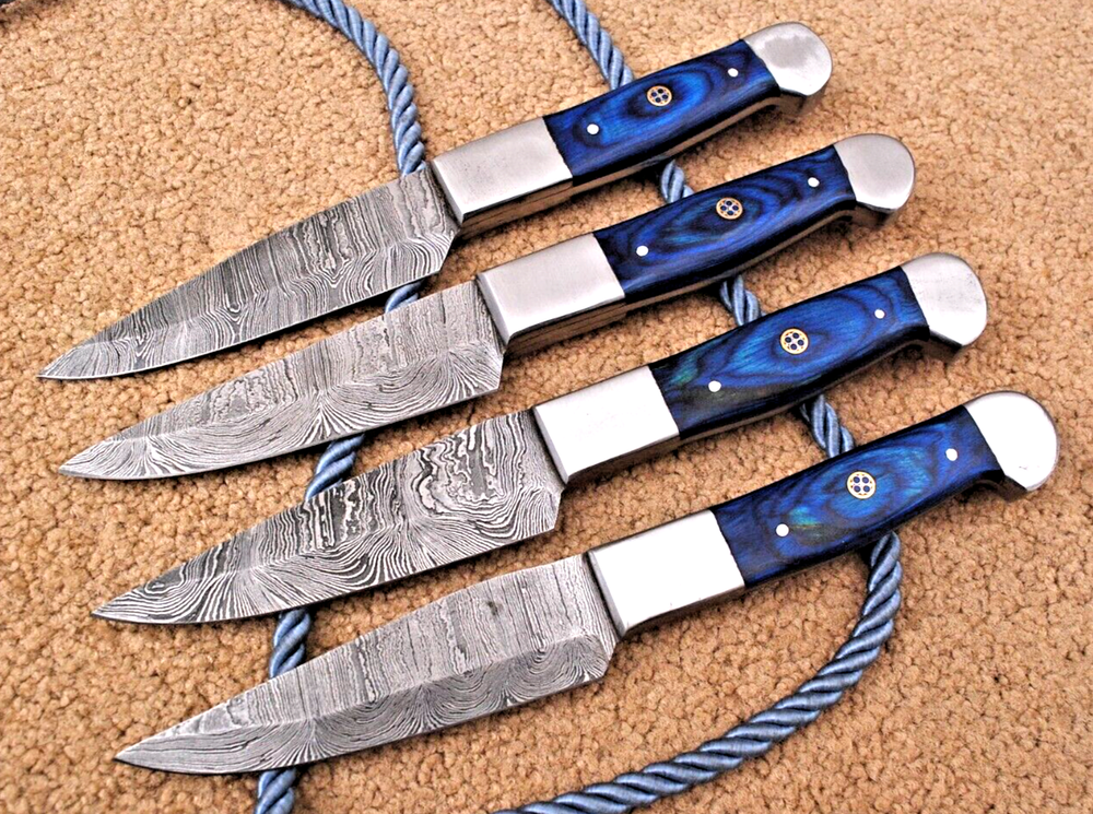 Blade Length: 5" INCH Brand: Handmade Type: Steak Knife Color: Blue Material: Damascus Steel Food Compatibility: Fruit, Universal, Vegetables Blade Edge: Straight Set Includes: Chef's Knife, Knife Set, Steak Knife Features: With Handles Custom Bundle: Yes MPN: N/A Handle Material: Damascus Steel Number of Items in Set: 4 Making Method: Compressor Personalize: No