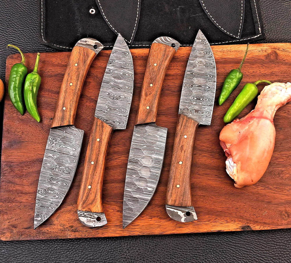 FOUR CUSTOM MADE HAND FORGED DAMASCUS STEEL CHEF STEAK KNIVES SET Wood Handle This superb design knife is hand forged. Blade of this knife has a nice file work and is made of 512 layers of 4340 stainless steel and 1075 high carbon steel and hardness 55-58 HRC . This robust knife is lab tested under intense conditions, the balance and shape of this knife ensures perfect grip. Overall Length: 9" Inches Blade Length: 5" Inches Handle Length: 4" Inches Damascus Design: Twist Pattern