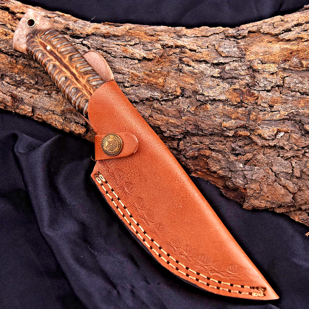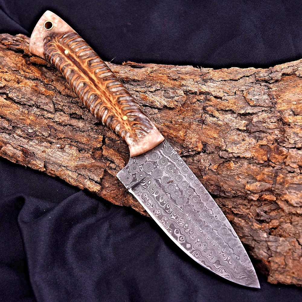 Features: Sheath Included Brand: M DAMASCUS Blade Color: Gray Tang: Hidden Blade Material: Damascus Steel Blade Edge: VERY SHARP Type: Hunting, Survival, SKINNER KNIFE, Damascus Knife, Skinning, Gift Handmade: Yes Blade Type: Drop Point Original/Reproduction: Original Blade Length: 4.6" Vintage: No Dexterity: Ambidextrous Handle Material: Pinecone Resin