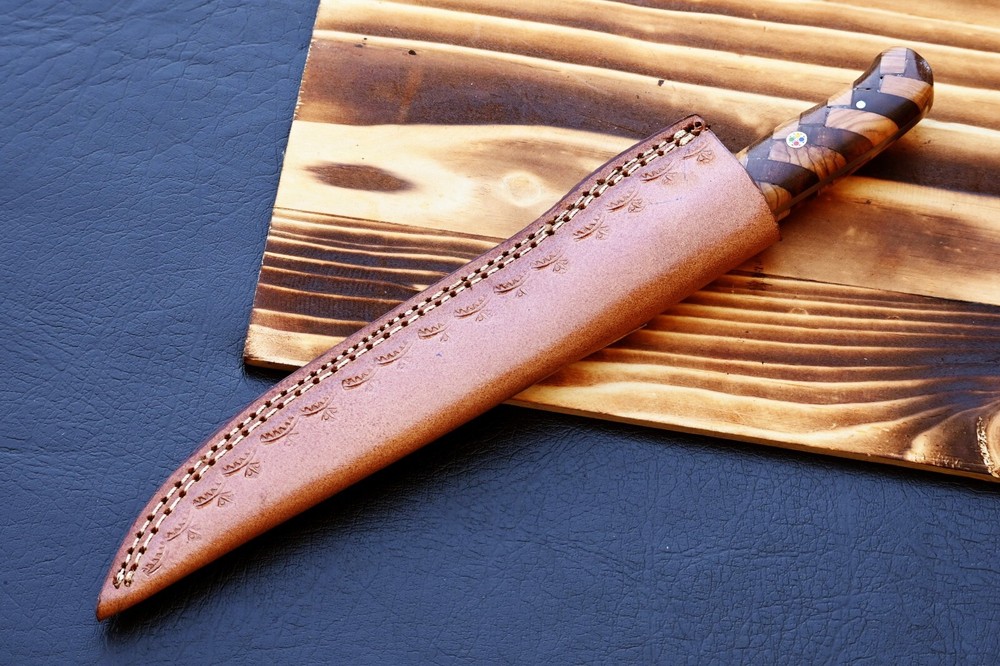 CUSTOM HAND MADE FORGED DAMASCUS STEEL BLADE FILLET FISHING KNIFE KITCHEN CHEF KNIFE Wood Handle This superb design knife is hand forged. Blade of this knife has a nice file work and is made of 512 layers of 4340 stainless steel and 1075 high carbon steel and hardness 55-58 HRC . This robust knife is lab tested under intense conditions, the balance and shape of this knife ensures perfect grip. Overall Length: 12” Inches Blade Length: 8" Inches Handle Length: 4" Inches Damascus Design: Ladder Pattern Layers: 512 Package Includes: with Leather Sheath Warning: Keep fingers clear of blades. Store away from children