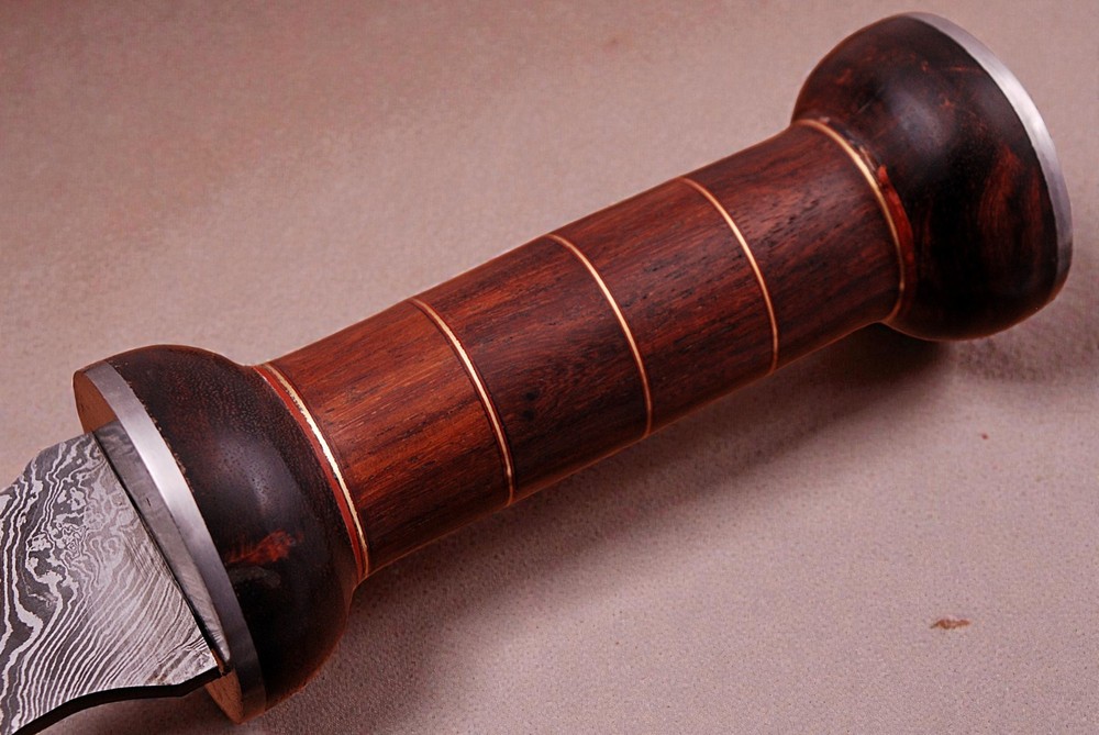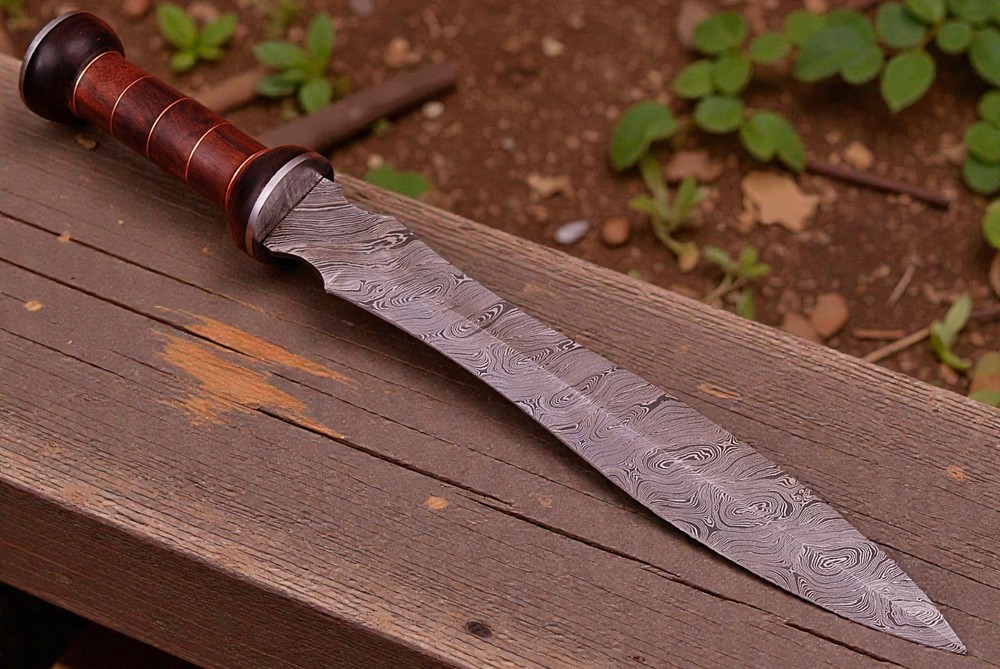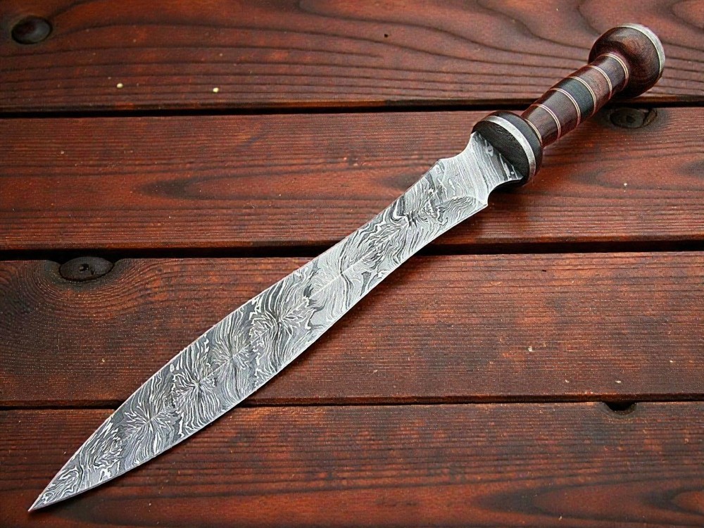 Brand: Damascus Country of Origin: Pakistan Tang: Full Blade Length: 13.5" INCHES Blade Type: Needle Point Vintage: No Dexterity: Ambidextrous Features: Sheath Included Handmade: Yes Original/Reproduction: Original Blade Edge: Plain Type: Hunting, Survival, Throwing, SWORD Handle Material: wood & damascus steel bolster handle Blade Color: Gray Blade Material: Damascus Steel
