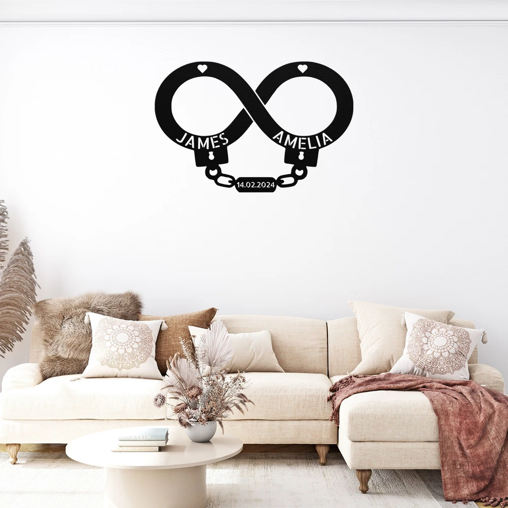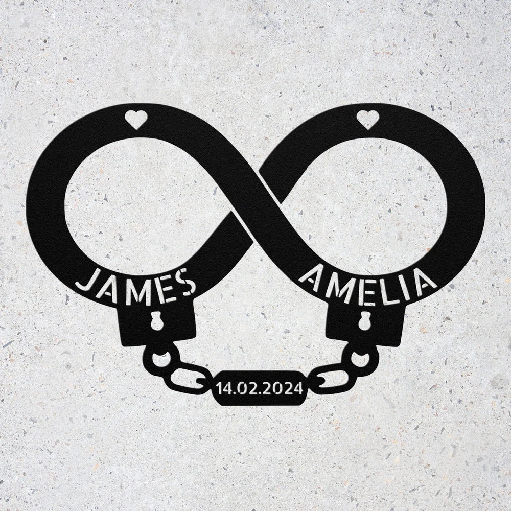 Product Description Custom Handcuff Infinity Metal Sign Birthday or Valentines Day Gift for Couples Celebrate your love with our Personalized Handcuff Infinity Metal Sign ! This custom wall art is perfect for couples, adding a meaningful and stylish touch to your home or office. Made from high-quality 16-gauge metal, this sign features a durable powder coating that protects it from dust, weather, and water, ensuring it looks great both indoors and outdoors. Looking for a special gift? This personalized metal sign is an excellent choice for Christmas, birthdays, anniversaries, or any special occasion. It’s a unique way to express your commitment and make any space feel more romantic. Key Features: Customizable Design : Personalize the sign with your names or a special date. Durable Material : Crafted from 16-gauge high-quality metal for lasting beauty. Weather-Resistant : Powder-coated finish protects against dust, rain, and rust. Versatile Decor : Suitable for both indoor and outdoor display. Great Gift Idea : A heartfelt present for any couple celebrating their love. Show off your unique bond or surprise a loved one with this charming metal sign. Order yours today and add a personal touch to your decor! Service and Color Choice Our metal signs are designed to be personalized just for you, making them the perfect addition to any space! The default color for our signs is Black , but we also offer a variety of beautiful options including Copper, Gold, White, and Silver . After placing your order, simply contact us with your preferred color choice, and we'll ensure your sign is exactly how you envision it. Let’s create something special together!