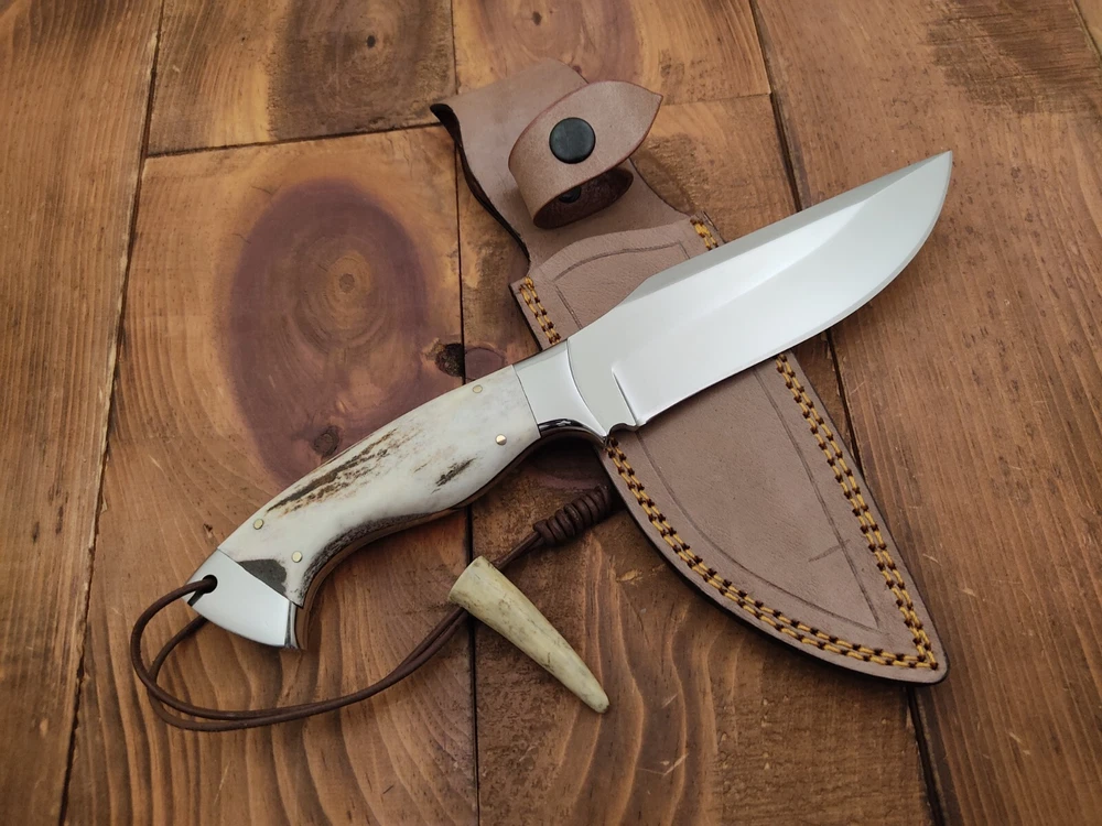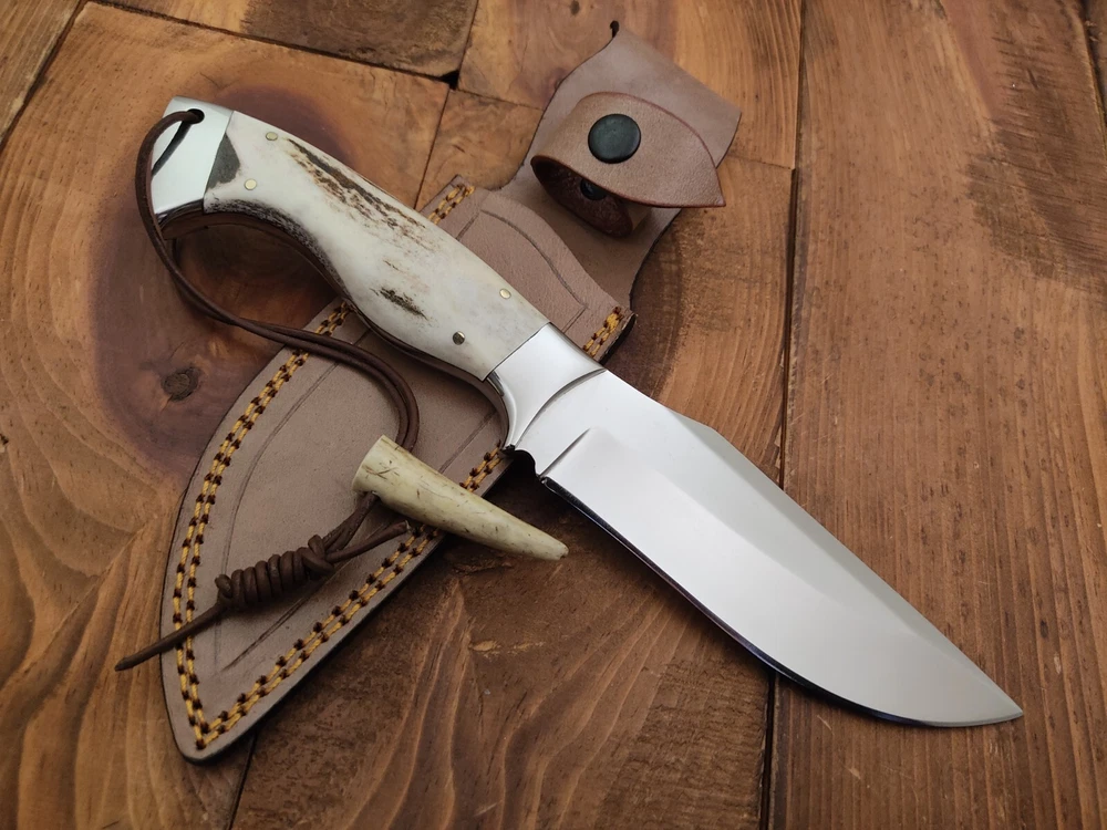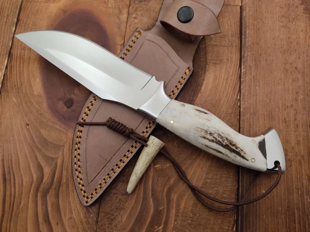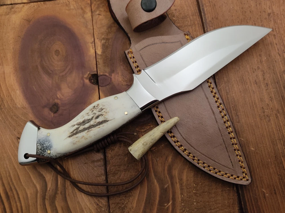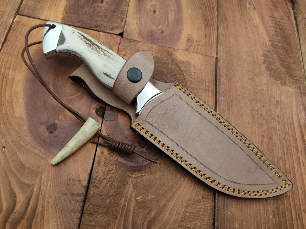 ITEM # HM-163 Fabulous Unique THUNDER STORKE Custom MADE KNIFE Custom Handmade Forged 12c27 Stainless Steel Camping Survival Outdoor Vintage Pocket Hunting Fixed Blade Bowie Knife Best Gift 12c27 High Carbon Stainless Steel holds an edge very well and is optimum for hunting and skinning use as well as tactical and military tasks. The steel is very corrosive and will tarnish and turn the blade black when blood and acidic liquids or chemicals get onto the blade. The blade will still work fine, but will lose the satin color when it was new. Stainless Steel Bolster & Pummel With Stag Antler Handle 12c27 High Carbon Stainless Steel Blade RAZOR SHARP Gorgeous Handle & Blade 11" Long | Blade is 5.5" Long | Handle is 5.3" 4 mm Thick Blade | Beautiful Worked Blade & Handle WORK OF ART This prestigious unique HUNTING knife was designed and custom made by THUNDERSTORKE . Blade was given excellent heat treatment and Rockwell hardness of the blade 58 to 60 . PAYMENT: As Per Ebay Requirement DISPATCH TIME: 2 to 3 DAYS AFTER RECEIVING YOUR PAYMENT COURIER / SHIPPING: When we print the postage label there is a number that is on the label. This number is called a "Delivery Confirmation Number". The post office is not like UPS or FEDX where they scan the mail at the receipt point and then track it to your door. What the post office does is scan the item when it is delivered (if they choose to) and then you will see that it was delivered. Sometimes they do scan it when you drop it off, but this is rare. If they did scan it at a sorting facility, you see it moving across the USA. But this is very rare. - eBay confuses the buyer with the "tracking number" next to the post offices "delivery confirmation number" when in reality there is not a tracking number. You can ask this at the post office and they will concur. We print labels off the internet using eBay's USPS shipping program and then we drop the packages off at the post office, similar if you were mailing a stamped letter. The post office is supposed to scan it "received" and they do this about 50% of the time. But sometimes they do not scan them. Do not worry, we did mail the item and it is on it's way to you. COMBINE SHIPPING OFFER: We Do Combine Shipping Discount On Multiple Purchase are as Follow. BUYER FEEDBACK AND Detailed Seller Ratings (DSR) SCORES : We spend a lot of time trying to describe our knives 100% perfect in detail, but sometimes we miss things. In the event that we missed something, upon inspection of the item when you receive it, let us know by contacting us via the "Contact Seller" link (next to our user ID profile) and allow us to solve your problem before leaving us low DSR scores (Detailed Seller Ratings) or neutral and negative feedback. - Help us, help ourselves to do better, with our future business on eBay by allowing us to correct our faults and fix the sale with you to a positive. We need to keep our scores high to continue to offer our great knives for sale on eBay. KNIFE CARE and SHEATHS : Leather sheaths pull moisture out of the air and tend to rust knife blades if not stored properly. When you are done using the knife, store it away from the leather sheath and put gun oil, Seal 1, or a similar protectant on the blade and store. Damascus, 1095HC, and D2 can rust and develop stains if not lubricated. AGE RESTRICTION: WE DON'T SELL KNIVES TO ANY ONE WHO IS UNDER AGE . GUARANTEE: If you are not happy with your purchase, we offer you a peace of mind guarantee if you return the product within 7 working days. We will refund your money back immediately ON RECEIVING THE KNIFE BACK IN ORIGINAL CONDITION. DELIBERATE TAMPERING WITH THE PRODUCT OR MISUSE WILL NOT QUALIFY FOR THE REFUND. SHIPPING CHARGES ARE NON-REFUNDABLE. DISCLAIMER: WHEN YOU ARE BIDDING ON THIS KNIFE YOU ARE CONFIRMING US THAT YOUR AGE QUALIFIES FOR THIS PURCHASE AND THIS IS A LEGAL PURCHASE. TAKES NO RESPONSIBILITY FOR ANY ILLEGAL PURCHASE Thank you, - Props in the Photos are NOT INCLUDED. Knife & Sheath ONLY .