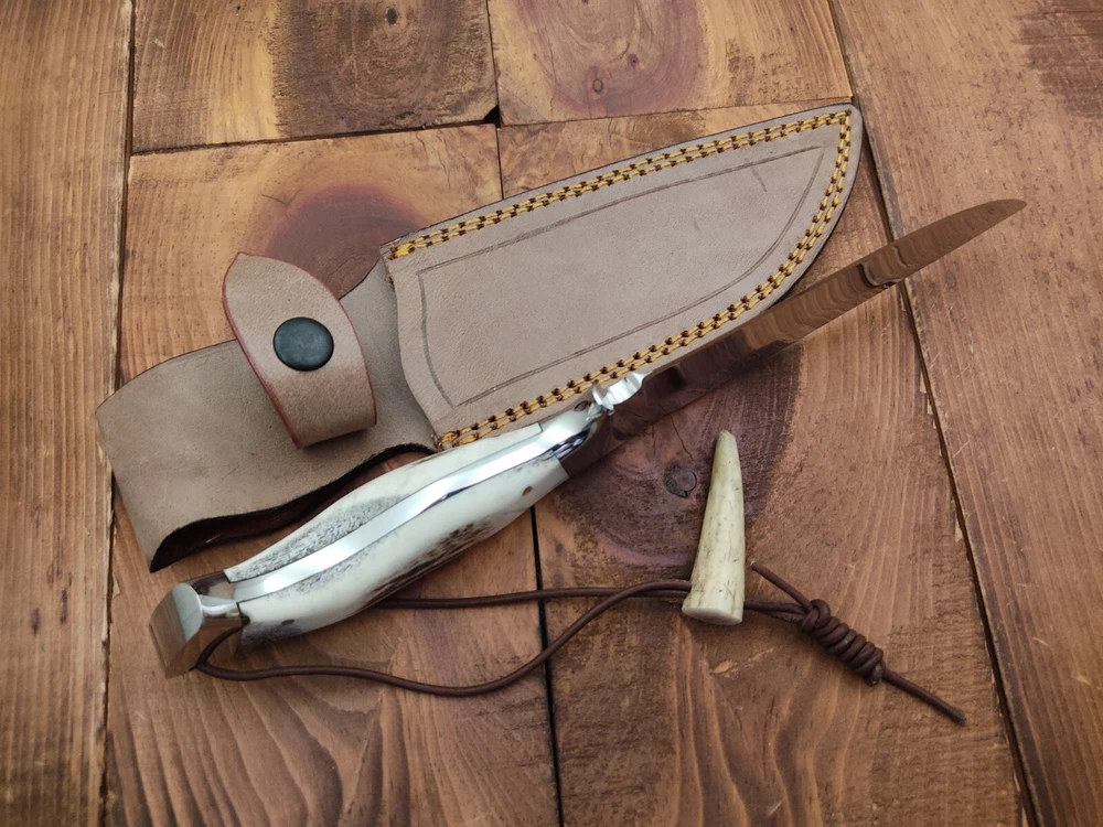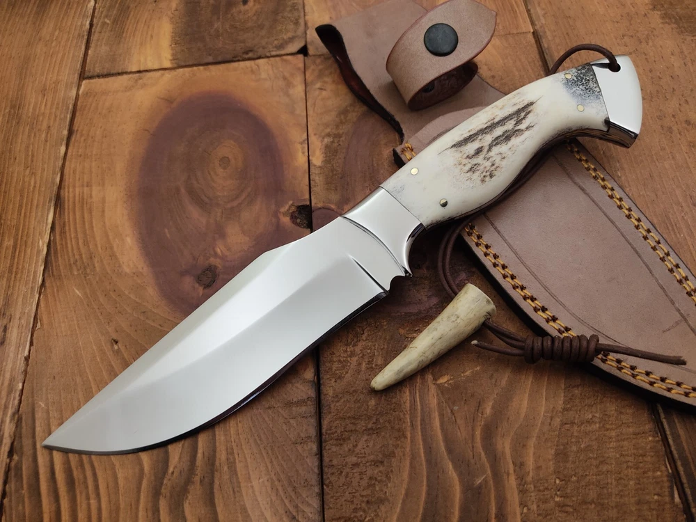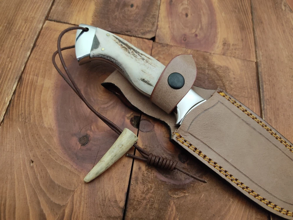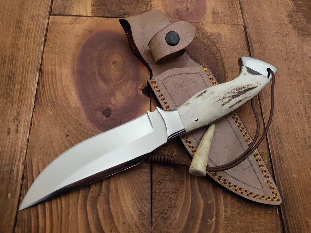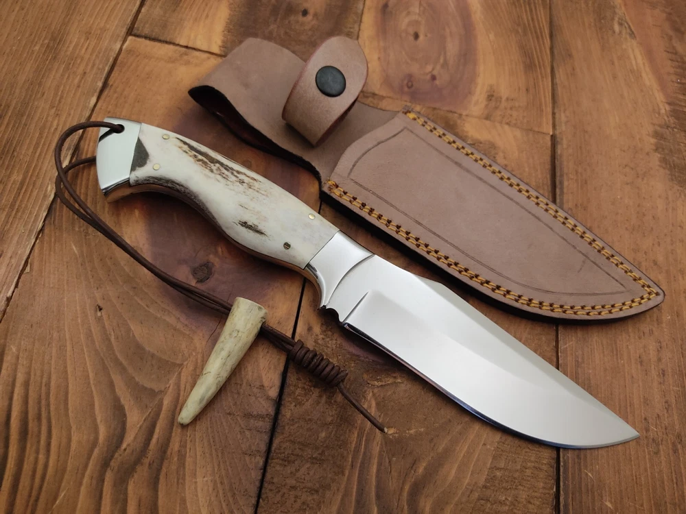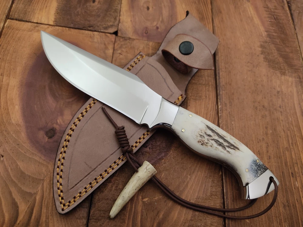 ITEM # HM-163 Fabulous Unique THUNDER STORKE Custom MADE KNIFE Custom Handmade Forged 12c27 Stainless Steel Camping Survival Outdoor Vintage Pocket Hunting Fixed Blade Bowie Knife Best Gift 12c27 High Carbon Stainless Steel holds an edge very well and is optimum for hunting and skinning use as well as tactical and military tasks. The steel is very corrosive and will tarnish and turn the blade black when blood and acidic liquids or chemicals get onto the blade. The blade will still work fine, but will lose the satin color when it was new. Stainless Steel Bolster & Pummel With Stag Antler Handle 12c27 High Carbon Stainless Steel Blade RAZOR SHARP Gorgeous Handle & Blade 11" Long | Blade is 5.5" Long | Handle is 5.3" 4 mm Thick Blade | Beautiful Worked Blade & Handle WORK OF ART This prestigious unique HUNTING knife was designed and custom made by THUNDERSTORKE . Blade was given excellent heat treatment and Rockwell hardness of the blade 58 to 60 . PAYMENT: As Per Ebay Requirement DISPATCH TIME: 2 to 3 DAYS AFTER RECEIVING YOUR PAYMENT COURIER / SHIPPING: When we print the postage label there is a number that is on the label. This number is called a "Delivery Confirmation Number". The post office is not like UPS or FEDX where they scan the mail at the receipt point and then track it to your door. What the post office does is scan the item when it is delivered (if they choose to) and then you will see that it was delivered. Sometimes they do scan it when you drop it off, but this is rare. If they did scan it at a sorting facility, you see it moving across the USA. But this is very rare. - eBay confuses the buyer with the "tracking number" next to the post offices "delivery confirmation number" when in reality there is not a tracking number. You can ask this at the post office and they will concur. We print labels off the internet using eBay's USPS shipping program and then we drop the packages off at the post office, similar if you were mailing a stamped letter. The post office is supposed to scan it "received" and they do this about 50% of the time. But sometimes they do not scan them. Do not worry, we did mail the item and it is on it's way to you. COMBINE SHIPPING OFFER: We Do Combine Shipping Discount On Multiple Purchase are as Follow. BUYER FEEDBACK AND Detailed Seller Ratings (DSR) SCORES : We spend a lot of time trying to describe our knives 100% perfect in detail, but sometimes we miss things. In the event that we missed something, upon inspection of the item when you receive it, let us know by contacting us via the "Contact Seller" link (next to our user ID profile) and allow us to solve your problem before leaving us low DSR scores (Detailed Seller Ratings) or neutral and negative feedback. - Help us, help ourselves to do better, with our future business on eBay by allowing us to correct our faults and fix the sale with you to a positive. We need to keep our scores high to continue to offer our great knives for sale on eBay. KNIFE CARE and SHEATHS : Leather sheaths pull moisture out of the air and tend to rust knife blades if not stored properly. When you are done using the knife, store it away from the leather sheath and put gun oil, Seal 1, or a similar protectant on the blade and store. Damascus, 1095HC, and D2 can rust and develop stains if not lubricated. AGE RESTRICTION: WE DON'T SELL KNIVES TO ANY ONE WHO IS UNDER AGE . GUARANTEE: If you are not happy with your purchase, we offer you a peace of mind guarantee if you return the product within 7 working days. We will refund your money back immediately ON RECEIVING THE KNIFE BACK IN ORIGINAL CONDITION. DELIBERATE TAMPERING WITH THE PRODUCT OR MISUSE WILL NOT QUALIFY FOR THE REFUND. SHIPPING CHARGES ARE NON-REFUNDABLE. DISCLAIMER: WHEN YOU ARE BIDDING ON THIS KNIFE YOU ARE CONFIRMING US THAT YOUR AGE QUALIFIES FOR THIS PURCHASE AND THIS IS A LEGAL PURCHASE. TAKES NO RESPONSIBILITY FOR ANY ILLEGAL PURCHASE Thank you, - Props in the Photos are NOT INCLUDED. Knife & Sheath ONLY .