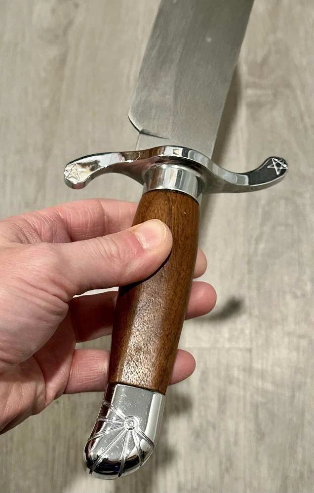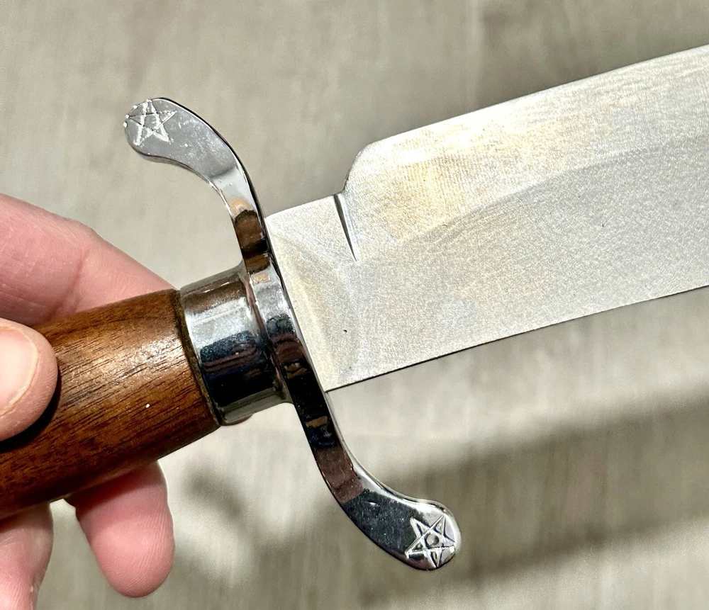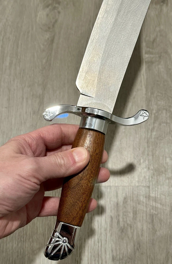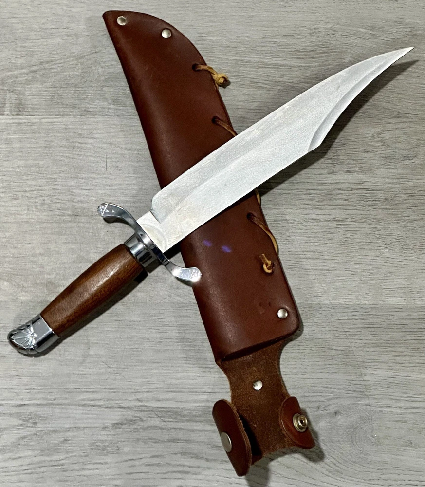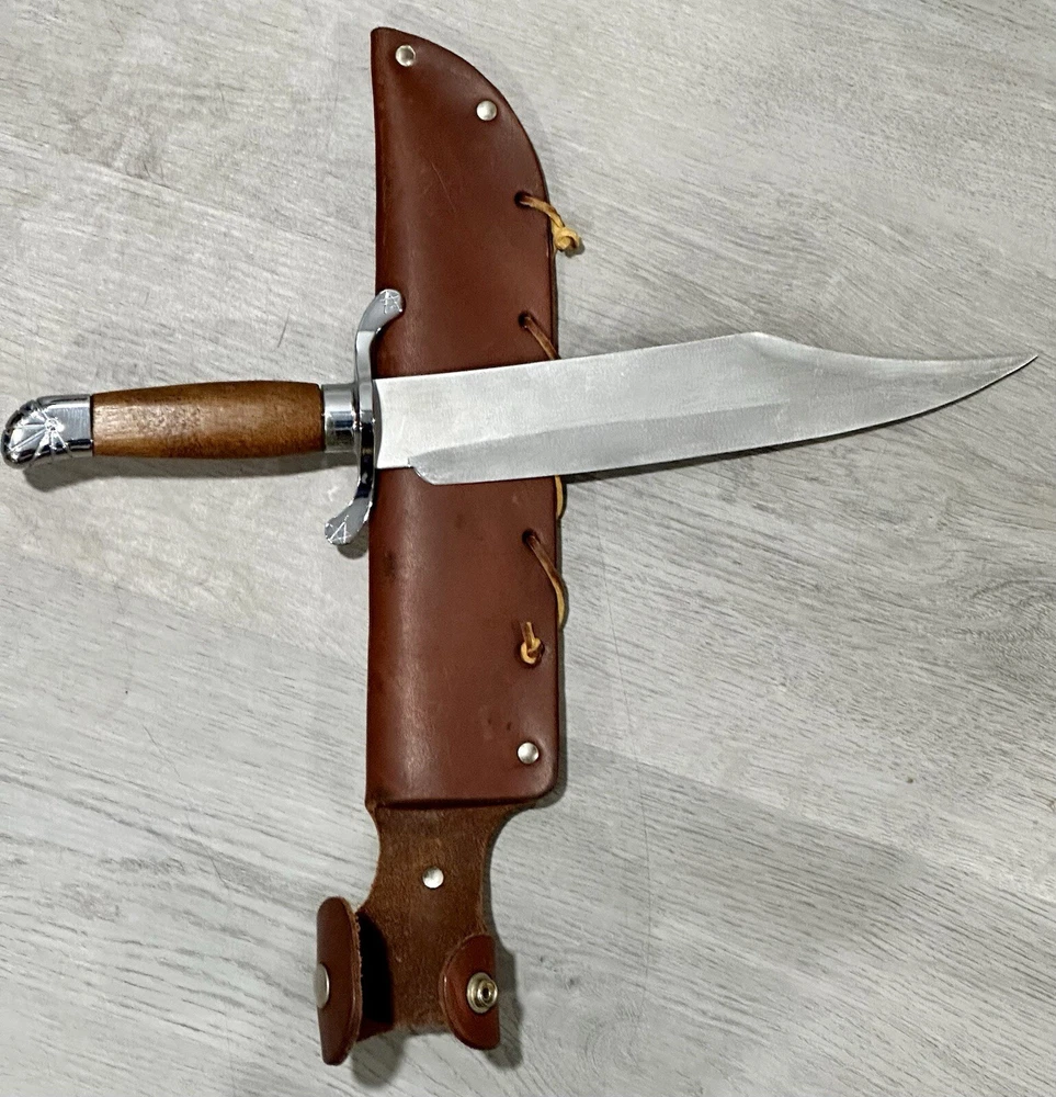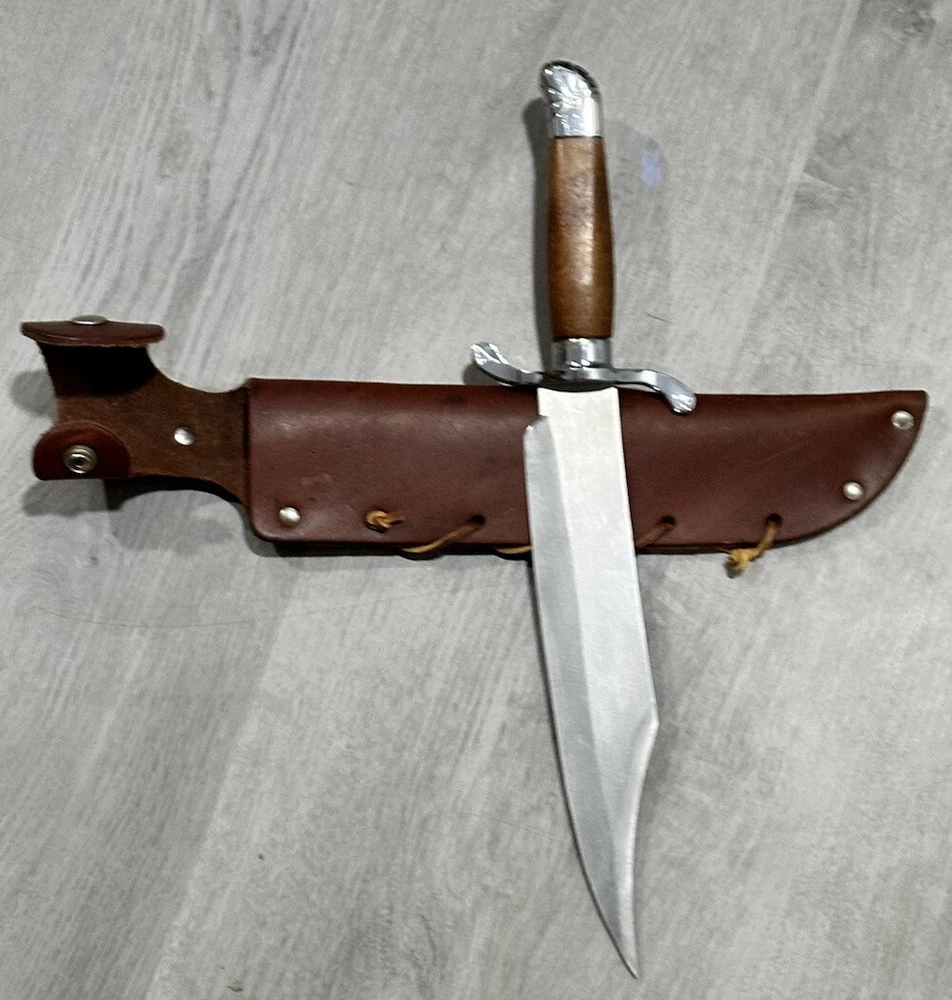A custom handmade bowie knife with custom handmade leather sheath. I have had this a while, but its been kept in new condition. Unsure of maker this was given to me as a gift about 15 years ago. It comes with a cowhide hand crafted sheath. The blade has not been sharpened. I ship quick! Thanks