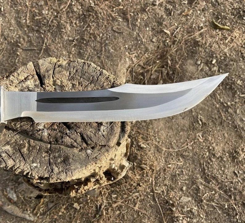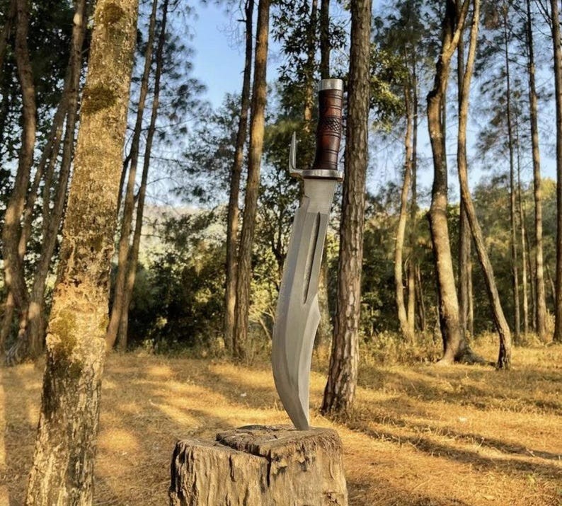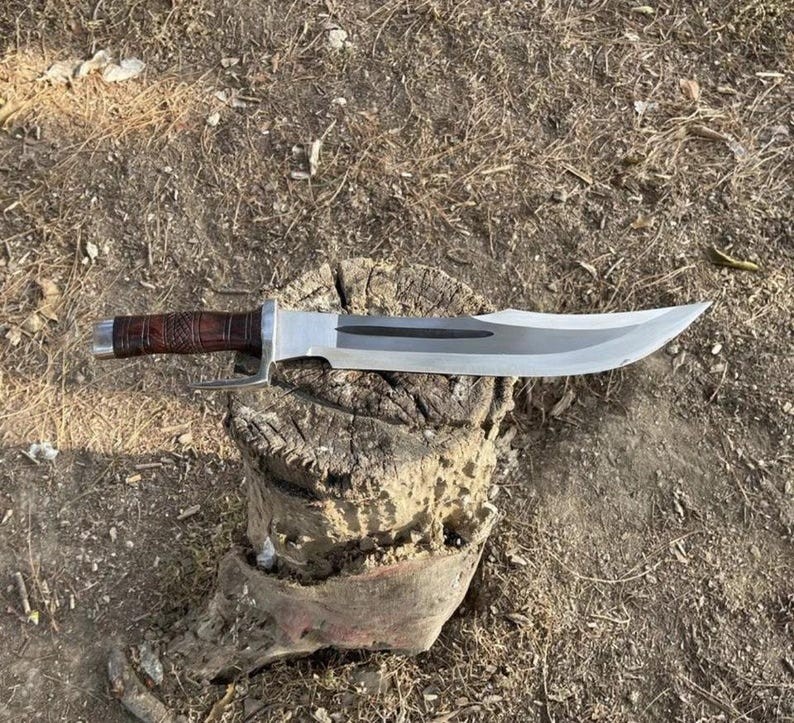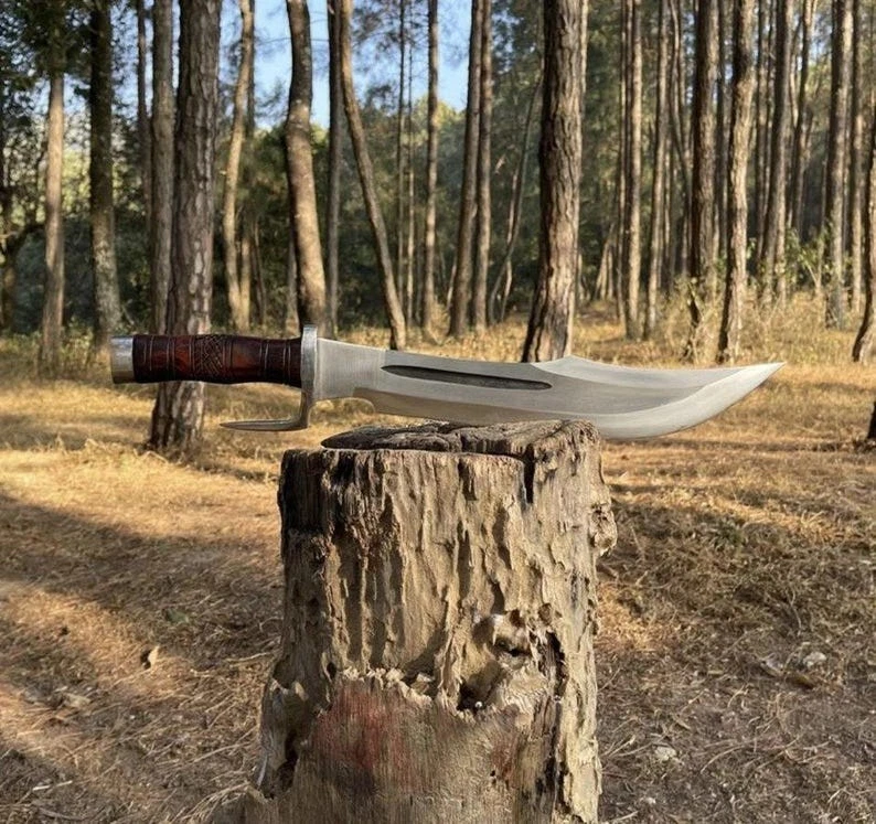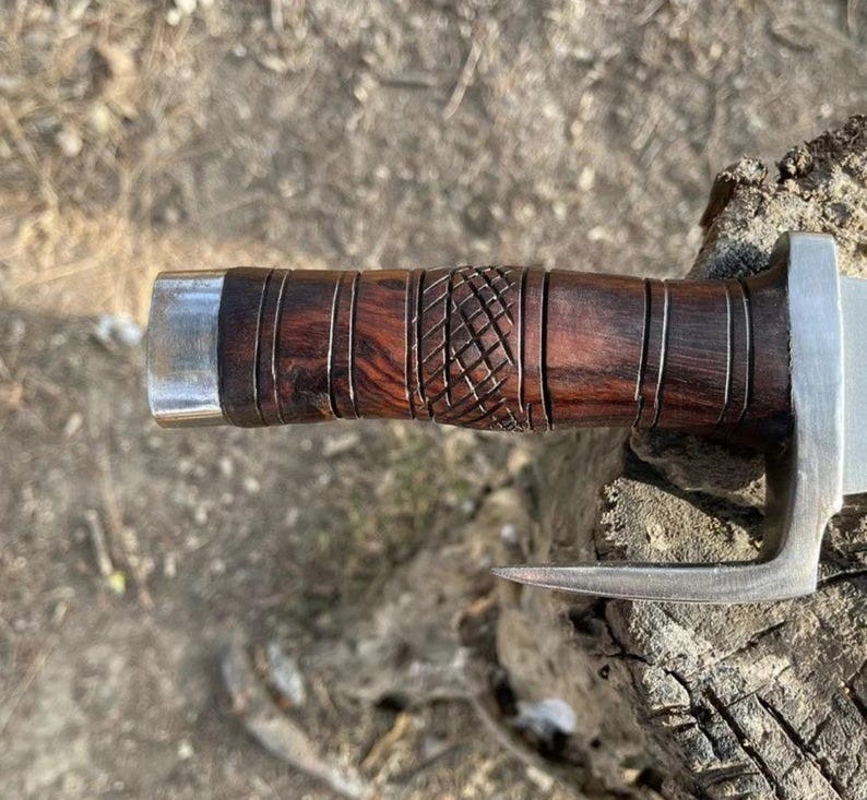 Item details Highlights Made by HAFIZ CRAFTS Delivery from a small business in Pakistan Read the full description Materials: carbon steel blade, silver clip, rose wood handle, leather sheath Gift wrapping available This handmade carbon steel knife is a powerful and reliable tool, designed for outdoor enthusiasts, campers, and those who need a sturdy cutting instrument for forestry and bushcraft activities. With a razor-sharp 14-inch blade and a comfortable 6-inch wooden handle, this knife provides exceptional balance, durability, and cutting efficiency. Premium Carbon Steel Blade ✔ Material: High-quality carbon steel ensures long-lasting sharpness, excellent edge retention, and superior cutting performance. ✔ Blade Length: 14 inches – Ideal for slicing, cutting, and processing wood or other outdoor materials. ✔ Versatile Use: Designed for forest work, wood processing, camping, and outdoor survival tasks. Ergonomic Wooden Handle ✔ Handle Length: 6 inches, providing a secure and comfortable grip. ✔ Material: Made from durable hardwood, offering a classic, natural look with enhanced strength. ✔ Well-Balanced Design: Crafted for easy handling and controlled cutting. Perfect for Outdoor & Camping Needs ✔ Camping & Hiking: A reliable tool for preparing firewood, crafting shelters, and general campsite use. ✔ Bushcraft & Survival: Excellent for wood processing and outdoor tasks. ✔ Forestry Work: Efficient in clearing small branches and processing wood for various outdoor needs. Key Features: ✅ Handcrafted Carbon Steel Blade – Built for strength and durability. ✅ Secure Wooden Handle – Offers a firm and comfortable grip. ✅ Multi-Purpose Outdoor Use – Great for camping, woodwork, and general cutting tasks. ✅ Long-Lasting Sharpness – High carbon steel retains its edge effectively. This handmade carbon steel knife is a dependable tool for nature lovers, outdoor explorers, and camping enthusiasts. Carefully crafted for balance, durability, and precision, it’s an essential addition to any outdoor gear collection.