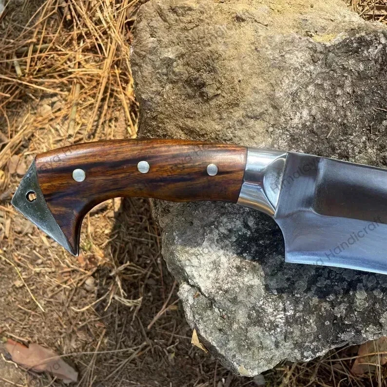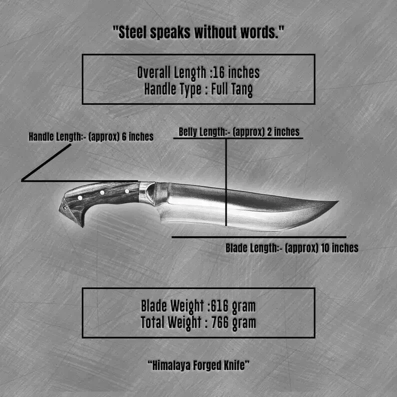 Item details Highlights Designed by Hafiz Crafts Supplies for making crafts Materials: Blade material: Carbon steel; Handle material: Wood ****Specifications: Blade Length: 10 inches Handle Length: 6 inches Whole Blade Length: 16 inches Blade Weight: 616 grams Whole Blade: 766 grams Belly Length: 2 inches This custom handmade Bowie knife is crafted by Hafiz Crafts in Pakistan, featuring a 10-inch carbon steel blade with a drop point design and a plain edge. The full tang construction ensures durability and strength for outdoor activities such as hunting, camping, and survival situations. The handle is made of wood and the knife includes a lanyard hole and sheath for convenient carrying. Ambidextrous in design, this silver-bladed Bowie knife is a high-quality and practical tool for collectors and outdoor enthusiasts alike.