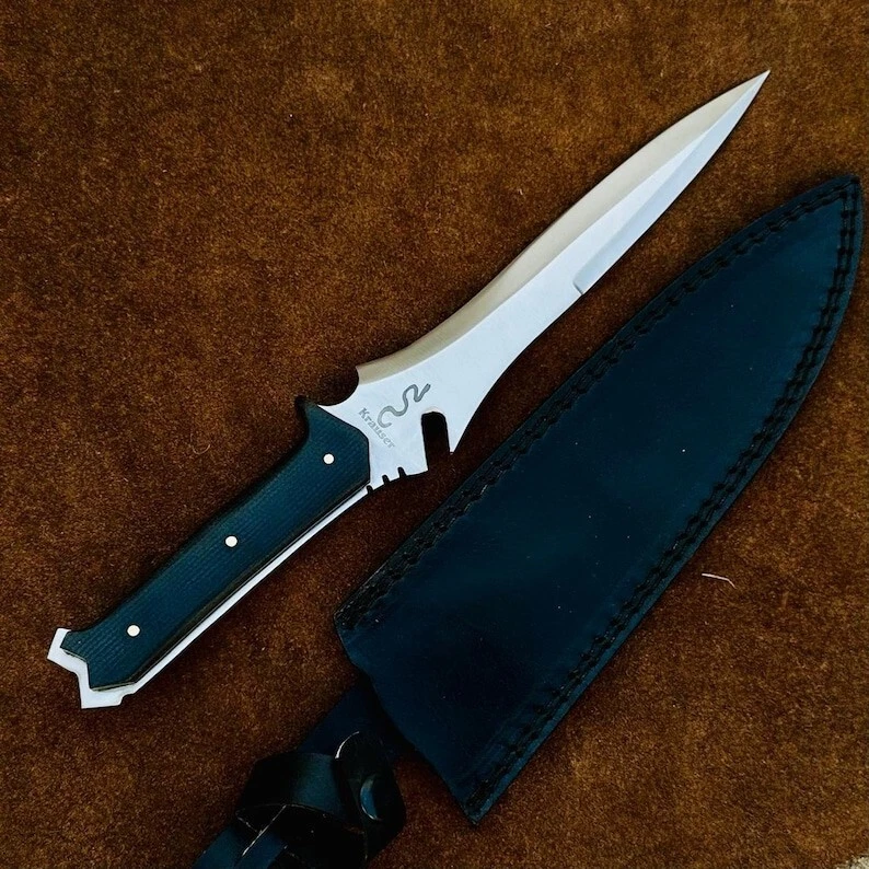 Item details Highlights Designed by Hafiz Crafts Supplies for making crafts Materials: Blade material: Carbon steel; Handle material: Micarta Jack Krauser Knife Reproduction Personalized Custom Handmade Spring Steel, Bowie Knife, Tactical Knife, Birthday Gift, Gift For Friend This is handmade Spring steel resident evil 4 jack krauser knife replica, entirely handmade, tempered , razor sharp and fully functional. Specially make for resident evil lover, buy your self a gift , send gift to your friend , take photos with it and send to your friends who wished for it. you can use it for chopping , bush craft and for daily small tasks. you can gift to your friend, To Grooms knife , To your fathers on someone's birthday. You can ask me to things engraved on it. -Blade Material: 5160 Spring Steel -Handle Material: Micarta This custom handmade Jack Krauser hunting knife features an 8-inch carbon steel blade with a drop point design and a plain edge, perfect for outdoor activities like hunting and camping. The full tang construction and ambidextrous design make it easy to handle, while the Micarta handle provides a sturdy and comfortable grip. It comes with a sheath for safe storage and transport, showcasing the craftsmanship of Hafiz Blades in Pakistan. This original piece is ideal for collectors and outdoor enthusiasts looking for a high-quality and functional tool. The Custom Handmade Carbon Steel Blade Jack Krauser Knife is a high-quality hunting and camping knife crafted by Hafiz Crafts in Pakistan. The blade is made of carbon steel with a full tang and a drop point design, measuring 8 inches in length with a plain edge. The handle is made of Micarta, providing durability and a comfortable grip. This knife is suitable for ambidextrous use and comes with a sheath for safe storage and carrying. Handmade with attention to detail, this knife is a collectible piece for outdoor enthusiasts and knife collectors.