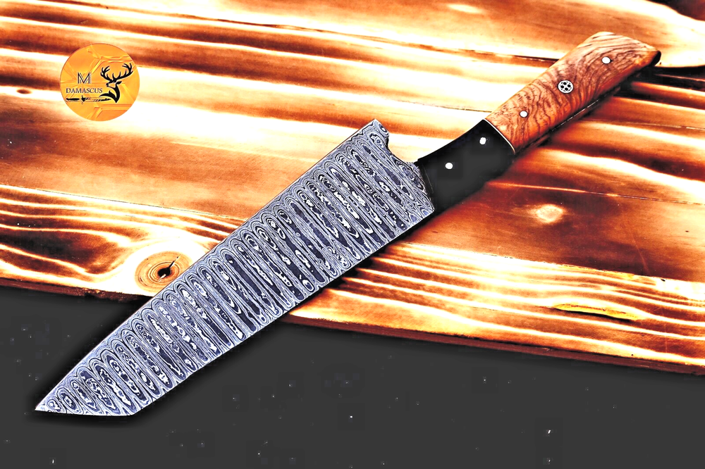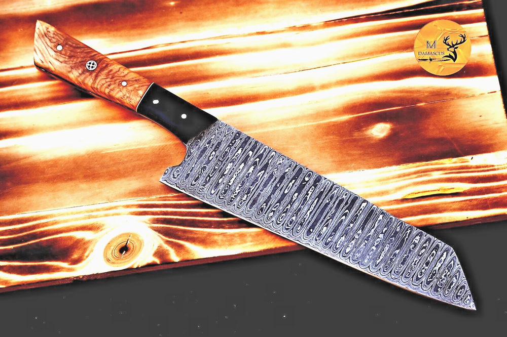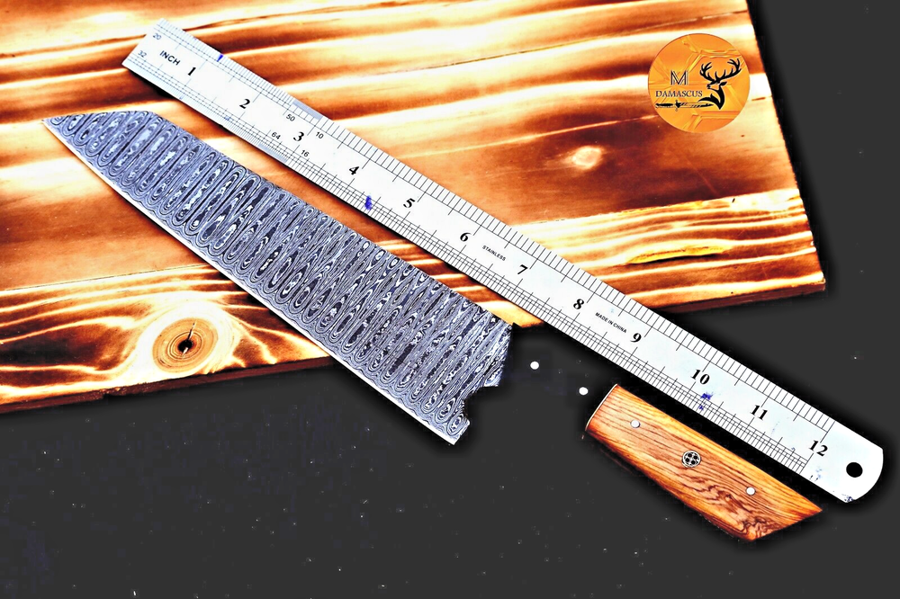 CUSTOM HAND MADE CHEF KNIFE KITCHEN KNIFE HAND FORGED DAMASCUS STEEL Wood Handle This superb design knife is hand forged. Blade of this knife has a nice file work and is made of 512 layers of 4340 stainless steel and 1075 high carbon steel and hardness 55-58 HRC . This robust knife is lab tested under intense conditions, the balance and shape of this knife ensures perfect grip. Overall Length: 13" Inches Blade Length: 8" Inches Handle Length: 5" Inches Damascus Design: Ladder Pattern Layers: 512 Care Instructions: Keep the knife dry after each cleaning. Warning: Keep fingers clear of blades. Store away from children.
