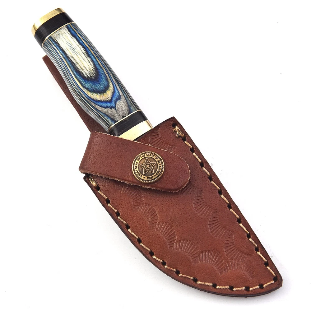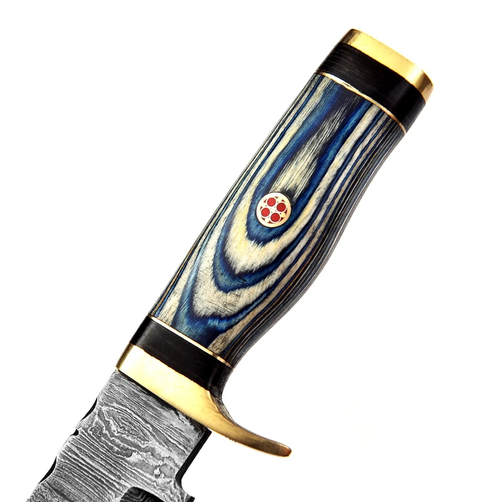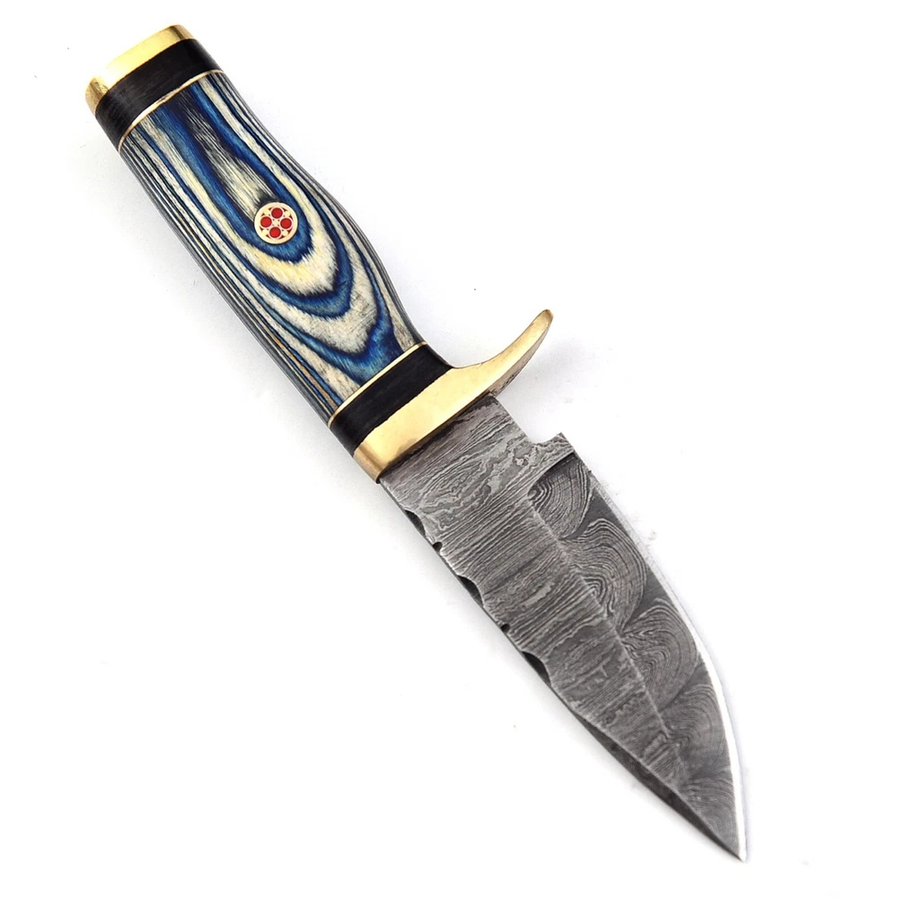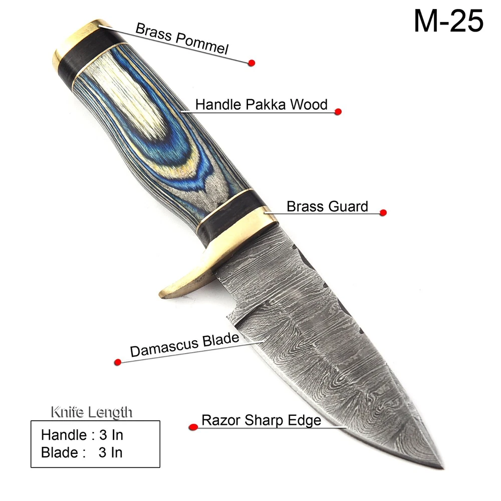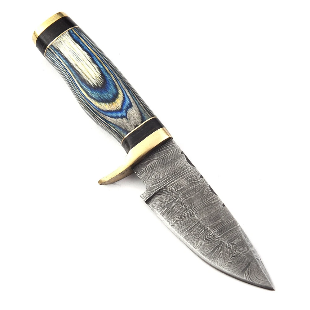Custom Handmade Damascus Steel Skinner Hunting Knife KNIFE MATERIAL: Blade: Damascus Handle: Pakka Wood & Brass Pommal & Brass Guard KNIFE MEASUREMENT: Overall Length= 6" Blade Length= 3" Handle Length=3" Trendcutd knives are handmade you will get the same knife as in the photo. A slight difference can be there in color and patterns because these are handmade items and we use natural material. These knife have perfect grip sharp cutting edge which makes our knives more durable. Tips To Care For Knife: 1. Clean your knife with gasoline or Ethanol after use. 2. Apply oil on the blade after cleaning & using the knife. 3. Never store the knife in sheath for long time as it may dull the sharpness of knife over time. DISCLAIMER: If you have any issue regarding our products and services you can always contact us any time we will try to resolve your issue as quickly as possible. Best Regards, Trendcutd