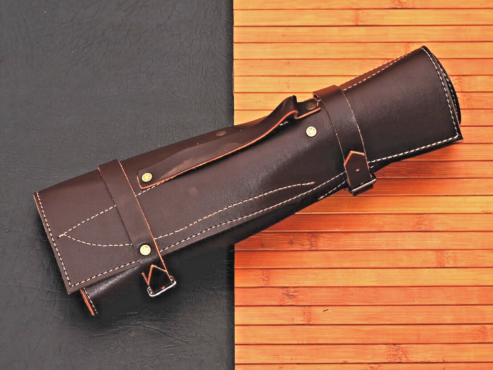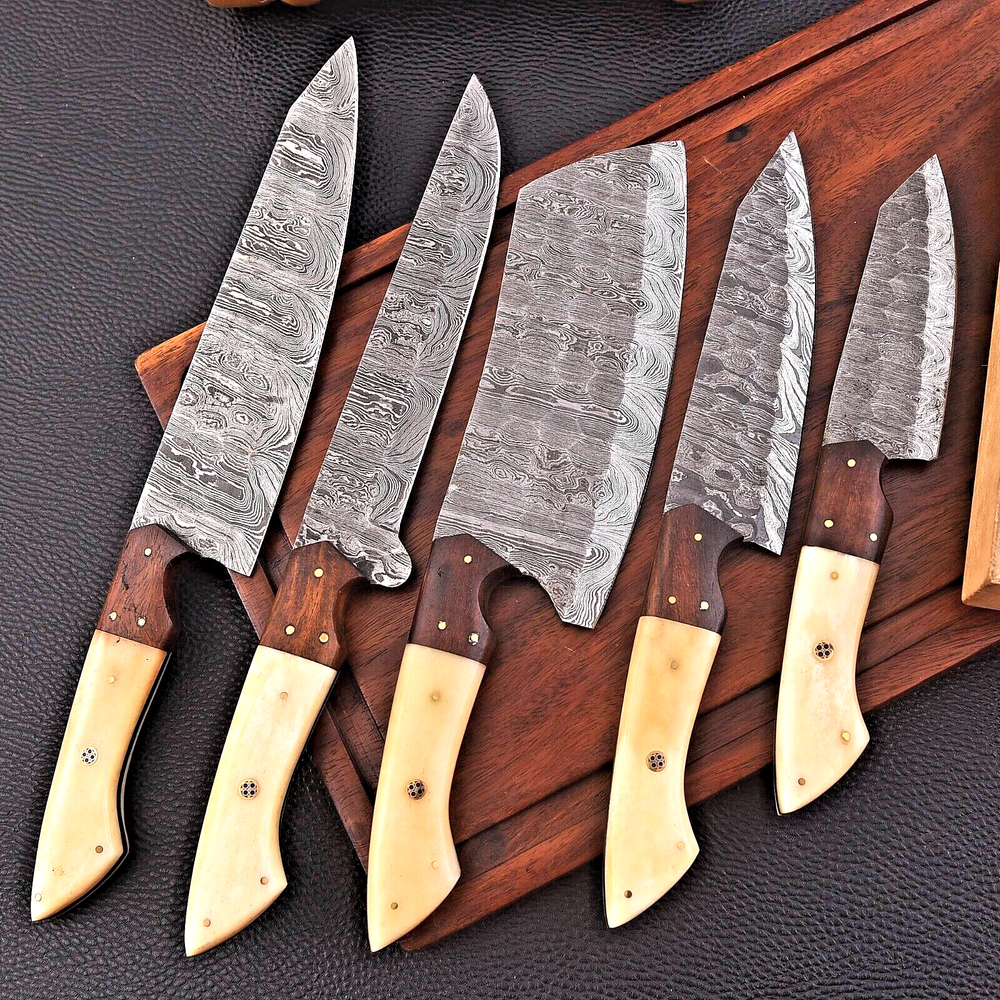 Custom Hand Forged Damascus Steel CHEF KNIVES SET Camel Bone & Wood Handle Damascus Steel: Modern pattern welded Damascus steel, 512 layers of hard higher carbon steels are welded to many layers of soft lower carbon steels. The pattern is designed, the blade is forged-welded, twisted, drilled, flattened, grounded, and forge-welded some more. The stack of steel is formed into a billet, and these billets or bars are then used to make a knife. The knife is profiled, ground, heat treated and finished with additional processes like etching and bluing to reveal the striking pattern. Blade is tempered & edge is fully sharpened. Overall Pieces : 5 Left to Right UTILITY Knife :OVERALL 13' Blade 8" Inches - Handle 5" Inches Cleaver Knife : OVERALL 10' Blade 5.5" Inches - Handle 4.5" Inches FILLET Knife : OVERALL 12' Blade 7.5" Inches - Handle 4.5" Inches CHEF Knife : OVERALL 10' Blade 5.5" Inches - Handle 4.5" Inches STEAK Knife : OVERALL 9' Blade 4.5" Inches - Handle 4.5" Inches Damascus Design: Twist Pattern Layers:512 Hardness:55-58 HRC Package Includes: with Leather Sheath Warning: Keep fingers clear of blades. Store away from children