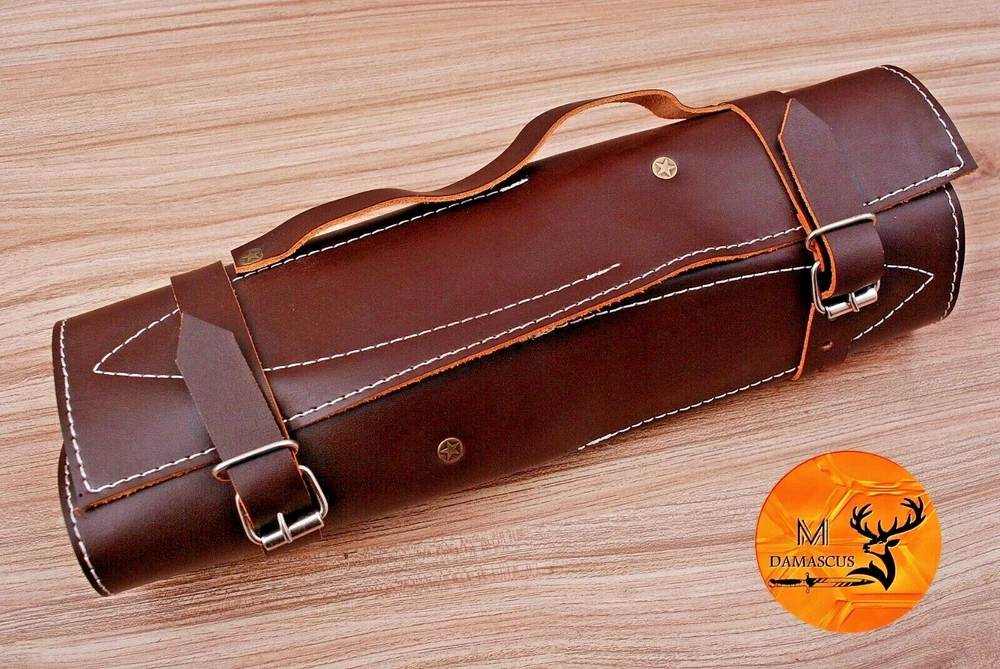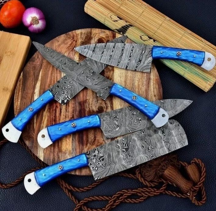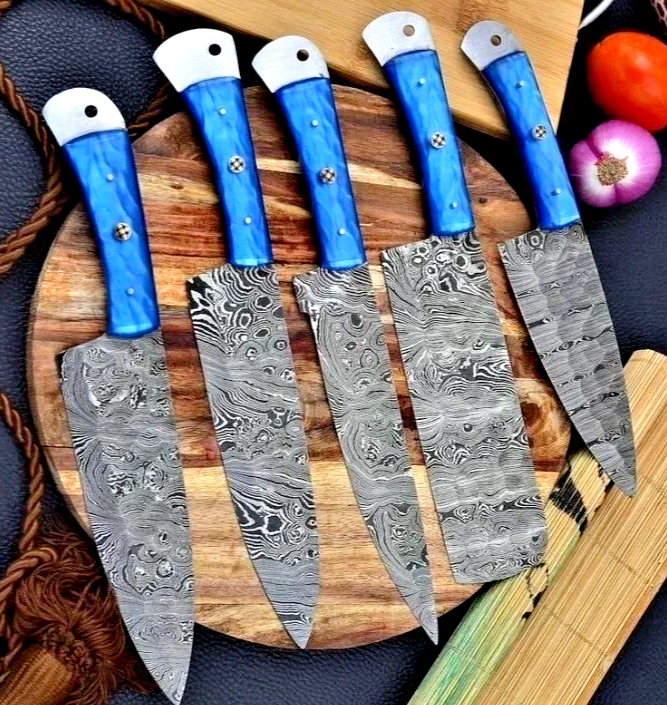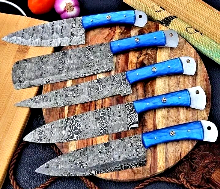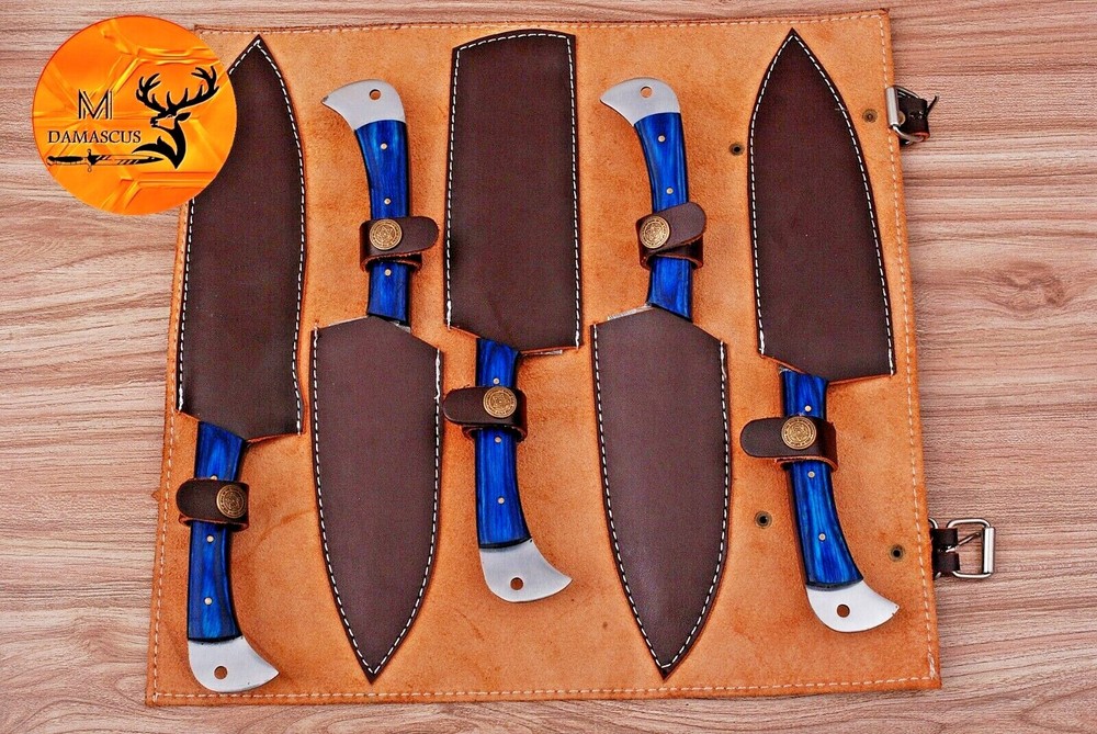 CUSTOM HAND MADE FORGED DAMASCUS STEEL ENGRAVED BLADE KITCHEN CHEF KNIFE SET Wood Handle This superb design knifes is hand forged. Blade of this knife has a nice file work and is made of 512 layers of 4340 stainless steel and 1075 high carbon steel and hardness 55-58 H R C . This robust knife is lab tested under intense conditions,the balance and shape of this knife ensures perfect grip. Overall Pieces : 5 Utility Knife : Blade 7" Inches - Handle 4.5" Inches Cleaver Knife : Blade 6" Inches - Handle 4.5" Inches Chef Knife : Blade 6" Inches - Handle 4.5" Inches Santoku knife : Blade 5" Inches - Handle 4" Inches Steak Knife : Blade 5" Inches - Handle 4" Inches Damascus Design: Twist Pattern Layers:512 Package Includes: with Leather Sheath Care Instructions: Keep the knife dry after each cleaning. Warning: Keep fingers clear of blades. Store away from children.