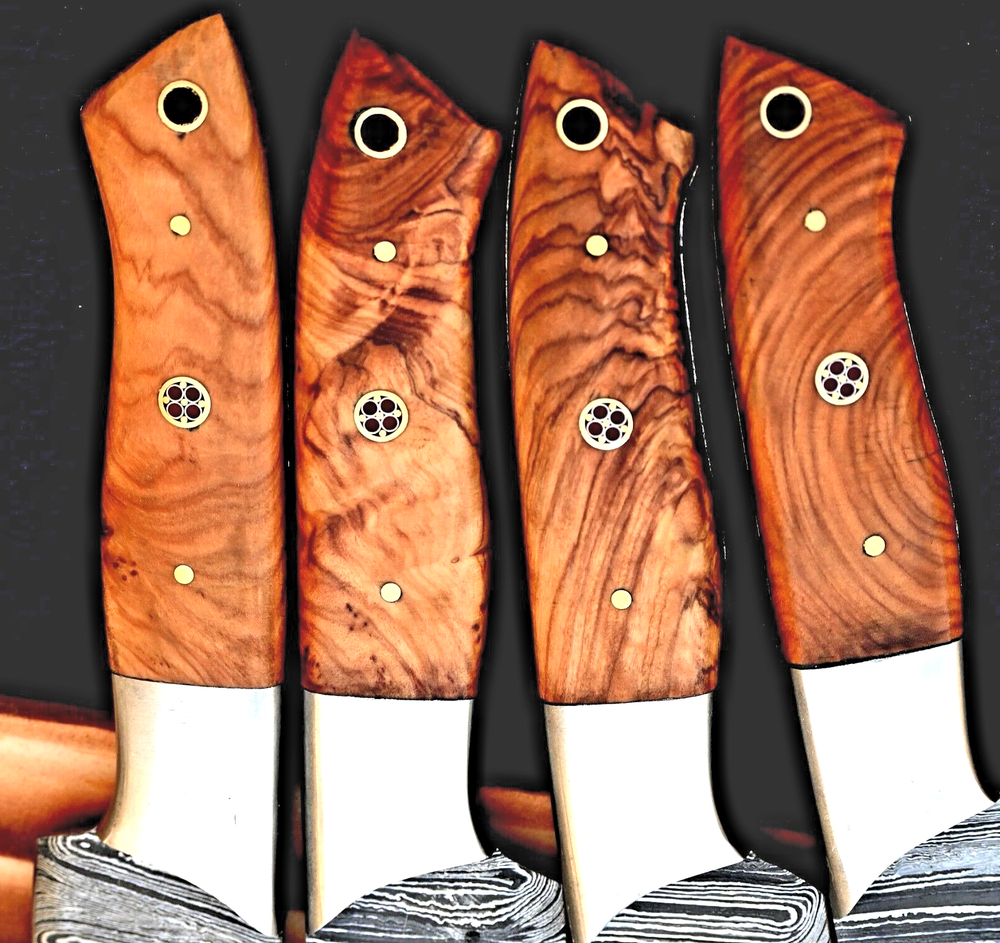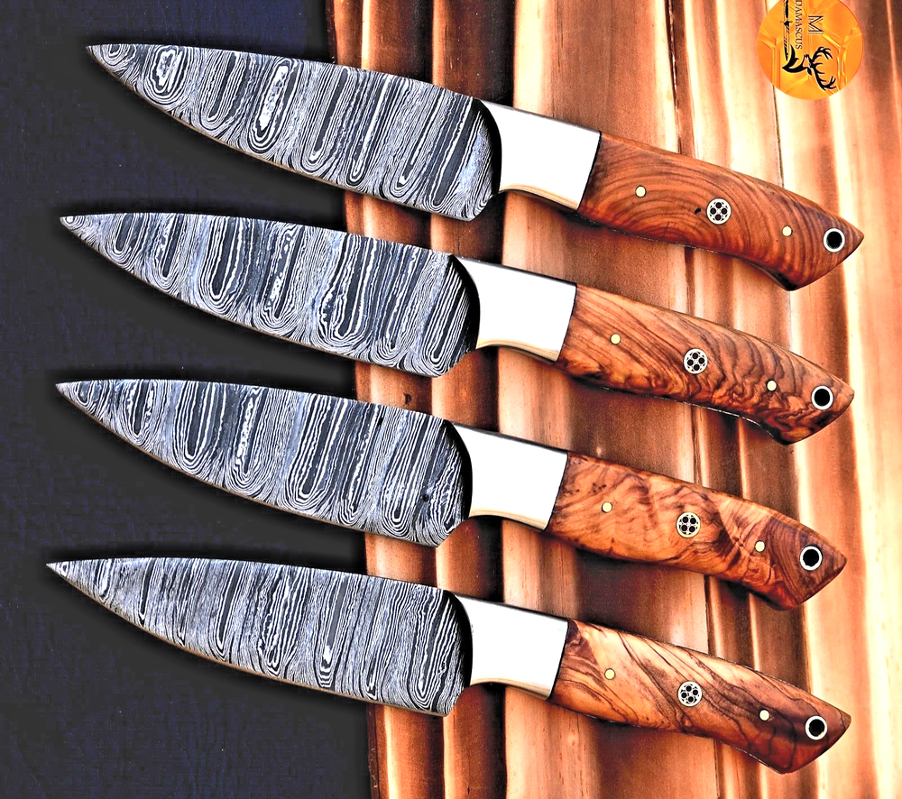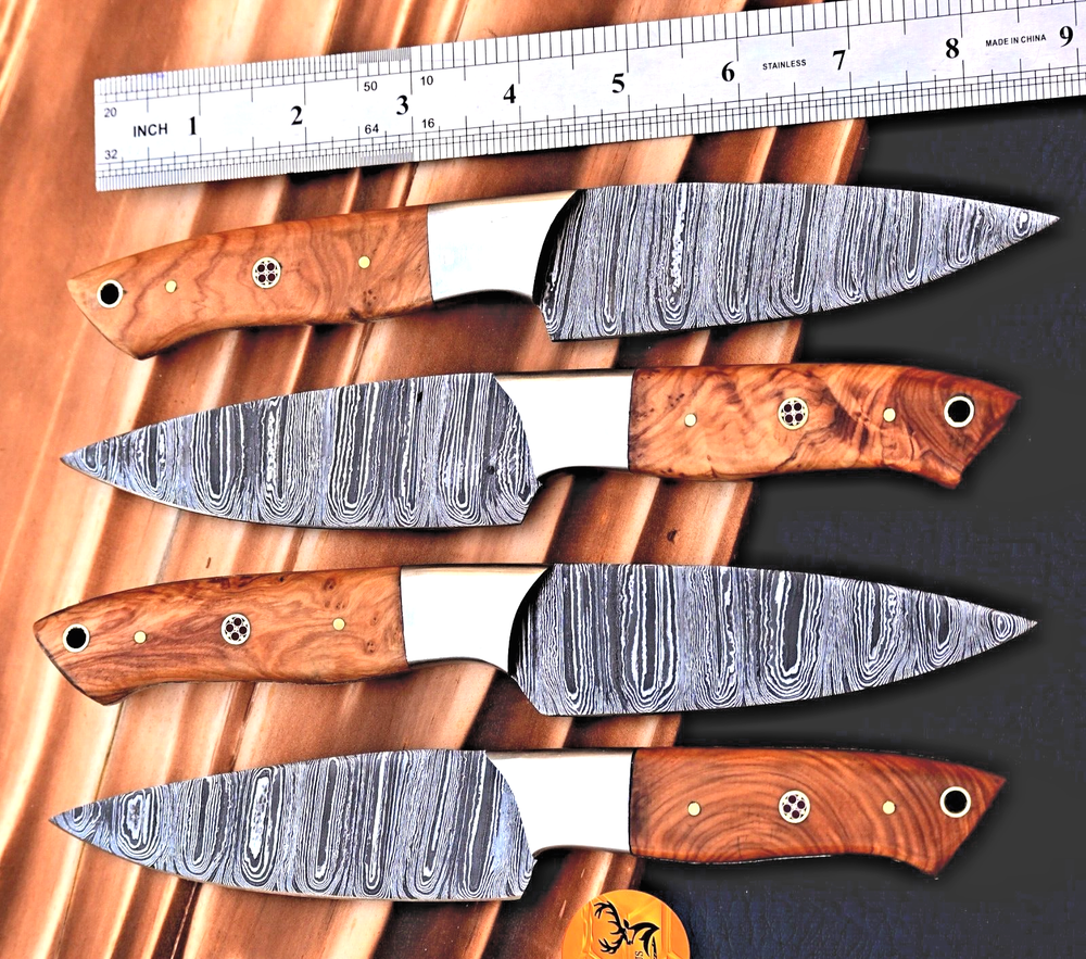 Handle Material: WOOD & STEEL BOLSTER HANDLE Blade Edge: Straight Number of Items in Set: 4 Material: Damascus Steel Features: With Handles Blade Length: 4.5" INCHES Color: Brown Food Compatibility: Fruit, Universal, Vegetables Set Includes: Chef's Knife, Knife Set, Steak Knife Type: Steak Knife Making Method: Compressor MPN: N/A Custom Bundle: Yes Brand: Damascus Personalize: No
