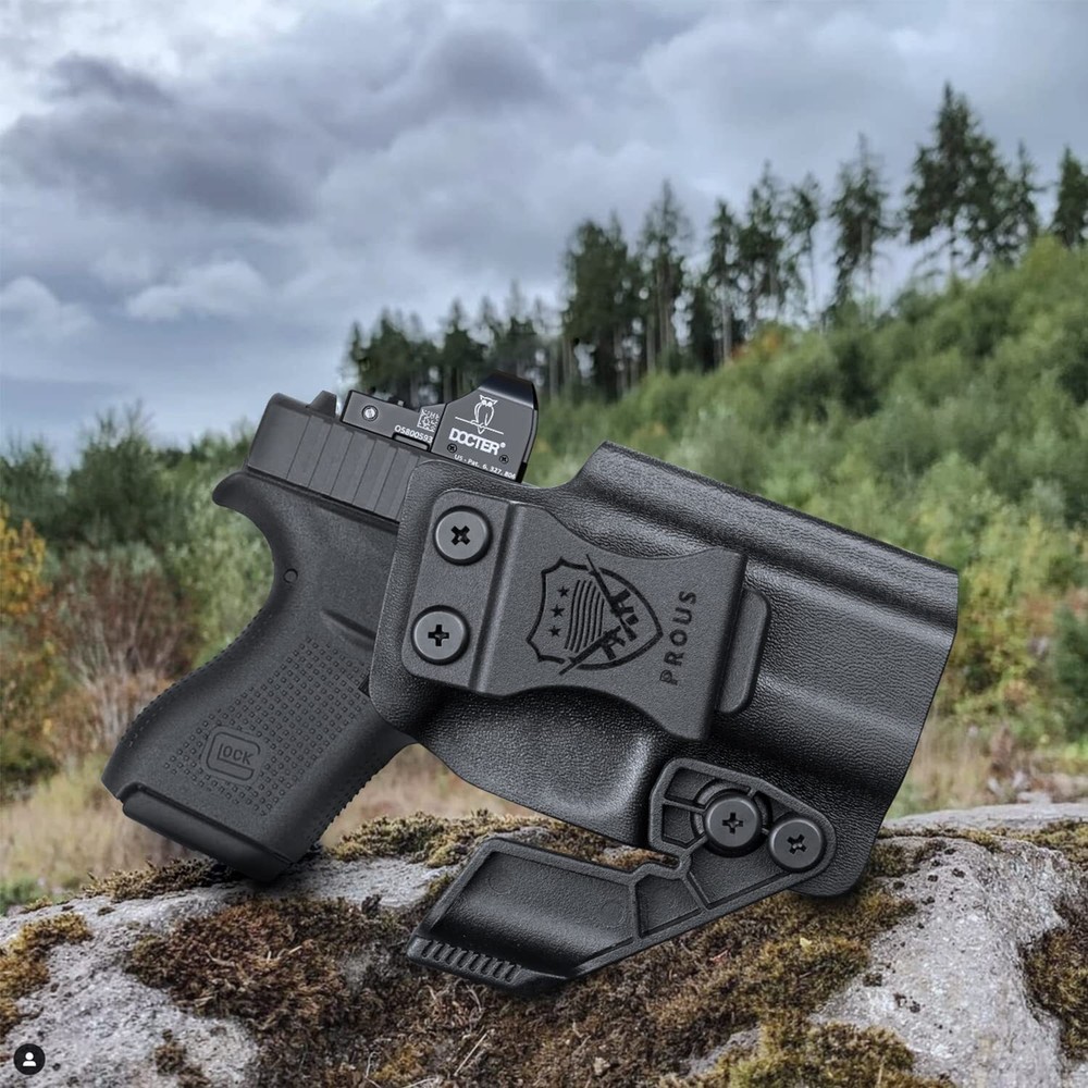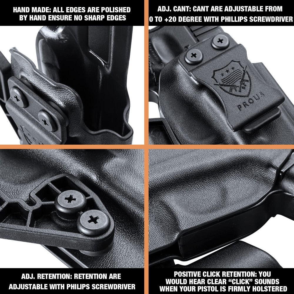 IWB Kydex Holster with Claw Attachment and Optic Cut: wih Glock 43 / Glock 43X - Not Fit G43X MOS, Concealed Carry Holster Glock 43, Adj. Cant & Retention, Right Hand HOLSTER FITS: G43 iwb holster is with Glock 43/ 43x. Holster is not with G43X MOS US .08 INCH KYDEX MATERIAL: G43 holster is made of top quality .08 inch kydex material, which is strong, durable, washable and molded specifically for G43 OPTICS READY: G43 holster with claw was designed to accommodate different optics, RMR/SRO MAX CONCEALMENT: Claw attachment let the butt of more close to your body to eliminate printing and achieve max conceal-ability. Equipped with 2 extra screws for customer remove claw carry POSITIVE AUDIBLE “CLICK” LOCK SYSTEM: When holster retention is well customized, you would hear clear “click” sounds when your handgun is firmly holstered FULL LENGTH SWEAT SHIELD AND OPEN BOTTOM: Sweat shield avoid sweats from body. The open end muzzle accommodate threaded barrel ADJUSTABLE CANT AND RETENTION: holsters cant are adjustable from 0 to +20 degree, loosen a little bit of screws on belt clip, then move the angle and tighten screws. The adjustable retention allows you customize idea tightness TIPS: To avoid screws get lost, we highly suggest utilizing thread locker on all threads to prevent loosening.