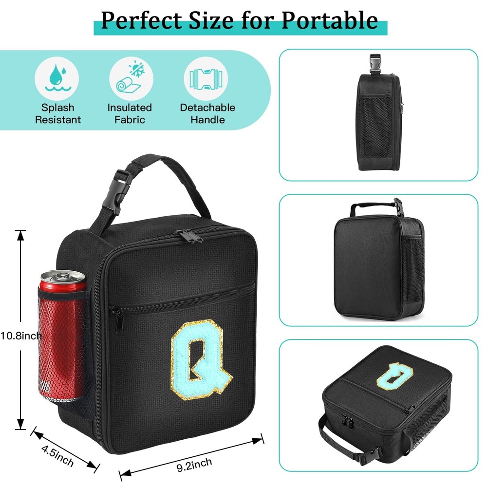 Initial InsulatePersonalized Letter Patch Design: The unique letter design makes the lunch bag stand out. The letters patch on the lunch bags are hand-stitched, which is not only not easy to come off, but also comfortable to touch.d Lunch Bag, Lunch Box with Initial Letter Patch for Teen Adult, Reusable Lunch Bag for Men Women, Ideal Birthday Gift Lightweight and portable: The lunch bag weighs 7 oz/0.43 lbs. Won't add much extra weight to your lunch. You can feel free to use it to carry your lunch, drinks and fruits etc to school, work or picnic. Plenty of storage space: This insulated lunch bag (10.2 x 9.2 x 4.5 inches) is designed to maximize storage efficiency, which not only provides you with plenty of space to hold the food and snacks you need throughout the day, but also your keys, cards, phone charger, water bottle, cutlery, lipsticks, or any other small things you need on a daily basis. Premium Material: This initial letter gift lunch box is made of 360d oxford fabric. Pearl cotton lining allows your food and drinks to stay cold or hot. The PEVA lining makes cleaning easy. Ideal Personalized Gift: This stylish letter patch personalized lunch bag is great as a birthday, Thanksgiving, Christmas, New Year, Back to school day and Mother's Day gift for teen, friends, daughters, mothers and sisters and so on.