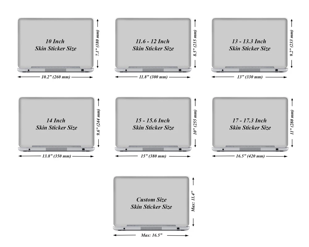 Our store Feedback Add To Favorite High Quality Vinyl Skin Decal with Customized Image(QTY 1) Specifications: Vinyl Skin Sticker w. Customized Image Anti-Scratch, Non-Fading, Removable Gooey Free Adhesive, Remove Without Leaving Sticky Residue Clear Coating Provide Additional Protection to the Skin Included 2 Free wrist pad (Wrist pad size will adjusted according by the size of skin sticker) Skin Size Reference: 10 inch : 260 mm x 180 mm (10" x 7") 12 inch : 300 mm x 215 mm (11.8" x 8.5") 13 inch : 330 mm x 233 mm (13" x 9.2") 14 inch : 350 mm x 244 mm (13.8" x 9.6") 15.6 inch : 380 mm x 255 mm (15" x 10") 17 inch : 420 mm x 280 mm (16.5" x 11") Custom Size: Max 16.5 x 11 Inch, included size in the note or email to us Note: Some trimming might be required due to different laptop size, corner and edge . How To Order Customized Skin : Choose Size ( see the size reference above ) Send image file as attachment to our email with email subject "Customized Laptop Skin" Customized Design Items will be Shipped Within 2 Business Days After Final Confirmation . Picture Requirement : JPG, PNG, BMP format; Aspect Ratio close to 3:2 and landscape orientation; The long side is more than 1500 pixel Note: If we do not receive you image in 2 days , your order will be cancelled . All orders are shipped within 2 business day of payment, excluding Weekends and Holidays. FREE tracking for US Domestic package. We accept payments via PayPal and Credit Cards. We are required to collect sale tax for all the shipment to New York. We are a trusted eBay seller and fully committed to ensuring that you have a positive experience when purchasing from us. If you have any questions regarding your order or if you experience any issues, please fell free to contact us.