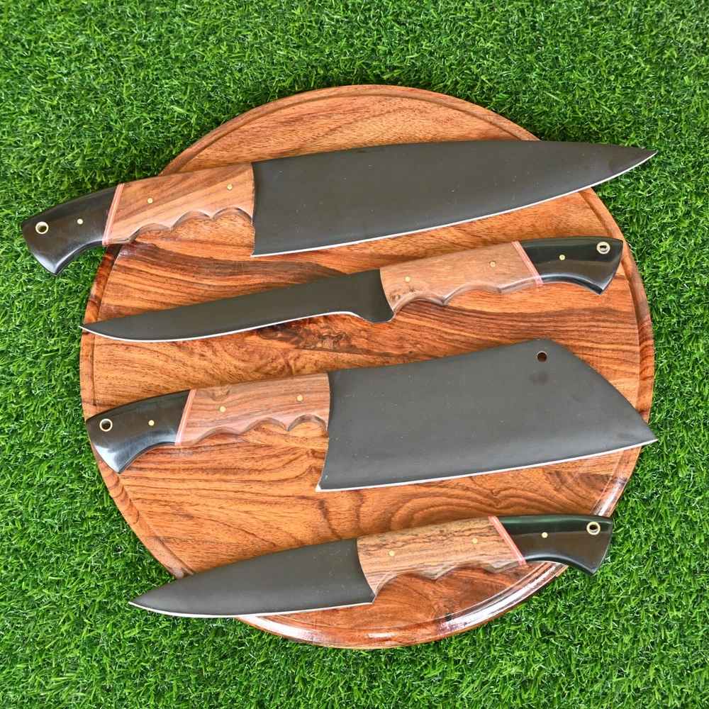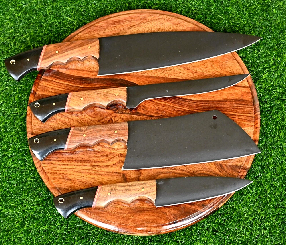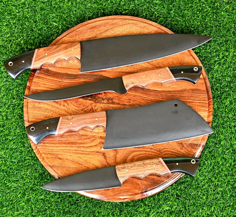 CUSTOM HAND MADE CHEF KNIFE KITCHEN KNIVES SET CARBON STEEL BLADE Wood Handle This superb design knifes is hand made. Blade of this knife has a nice file work and is made of high carbon steel and hardness 55-58 H R C . This robust knife is lab tested under intense conditions, the balance and shape of this knife ensures perfect grip. Overall Pieces : 4 Cleaver Knife : Blade 6.5" Inches - Handle 5" Inches Fillet Knife : Blade 5.5" Inches - Handle 5" Inches Chef Knife : Blade 7.75" Inches - Handle 5.25" Inches Steak Knife : Blade 4" Inches - Handle 4.75" Inches Warning: Keep fingers clear of blades. Store away from children.