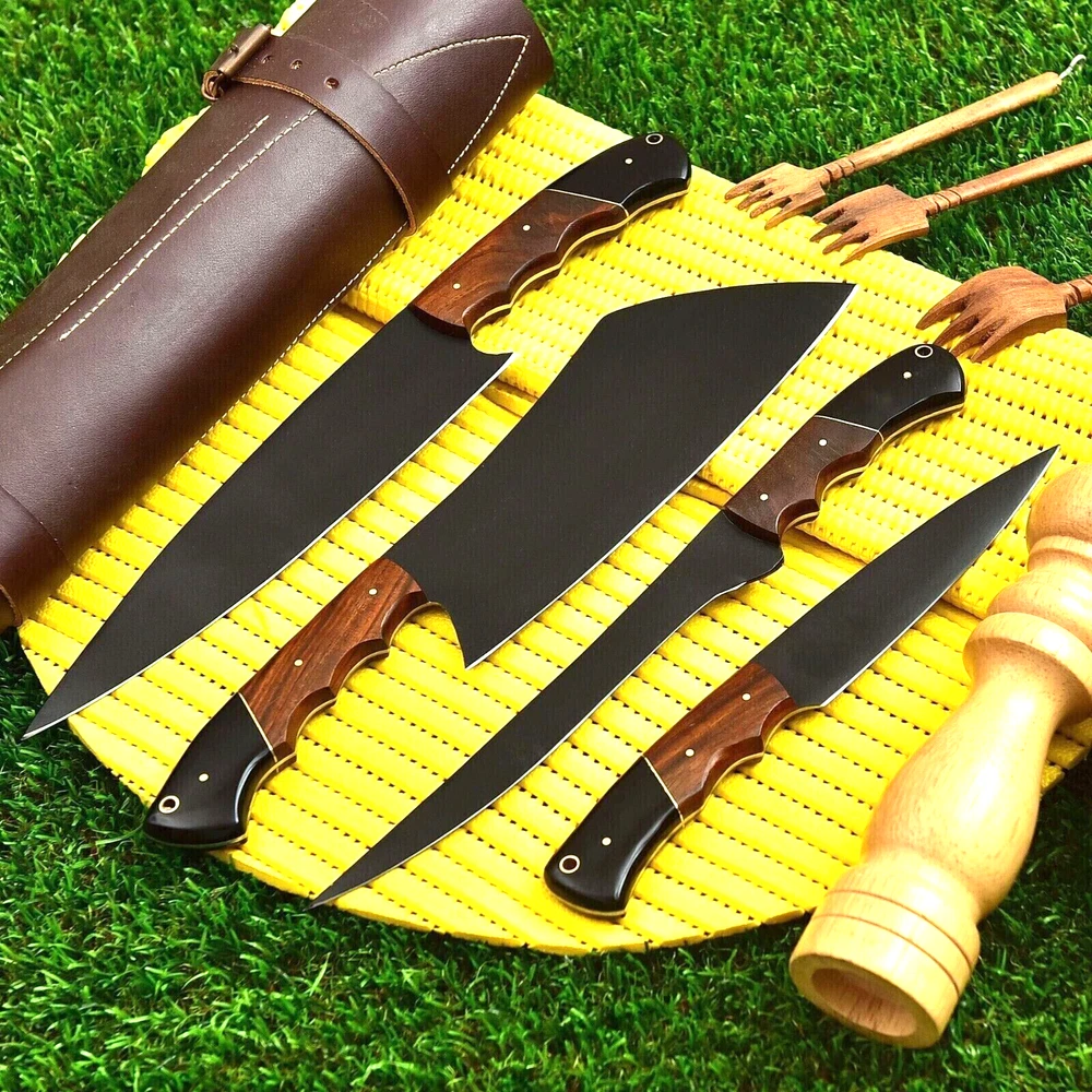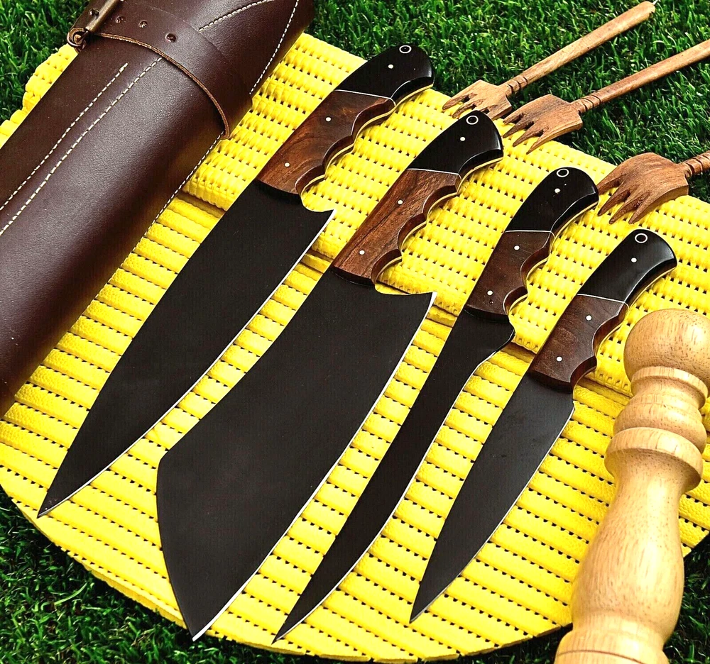 FULL TANG CUSTOM HAND MADE CARBON STEEL BLADE CHEF KNIFE KITCHEN KNIVES SET Wood Handle This superb design knifes is hand made. Blade of this knife has a nice file work and is made of high carbon steel and hardness 55-58 H R C . This robust knife is lab tested under intense conditions, the balance and shape of this knife ensures perfect grip. Overall Pieces : 4 Cleaver Knife : Blade 6.5" Inches - Handle 5" Inches Fillet Knife : Blade 5.5" Inches - Handle 5" Inches Chef Knife : Blade 7.75" Inches - Handle 5.25" Inches Steak Knife : Blade 4" Inches - Handle 4.75" Inches Warning: Keep fingers clear of blades. Store away from children.