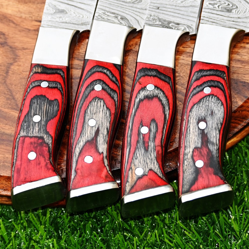 FOUR CUSTOM HAND MADE CHEF STEAK KNIFE SET HAND FORGED DAMASCUS STEEL BLADE WOOD Handle This superb design knife is hand forged. Blade of this knife has a nice file work and is made of 512 layers of 4340 stainless steel and 1075 high carbon steel and hardness 55-58 HRC . This robust knife is lab tested under intense conditions, the balance and shape of this knife ensures perfect grip. Overall Length: 9" Inches Blade Length: 5" Inches Handle Length: 4" Inches Damascus Design: Twist Pattern Layers: 512 Hardness: 55-58 HRC Warning: Keep fingers clear of blades. Store away from children.