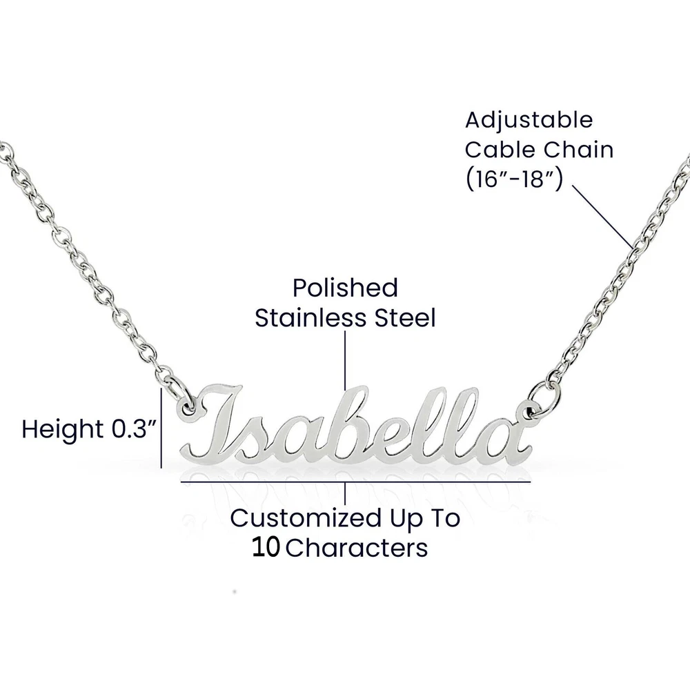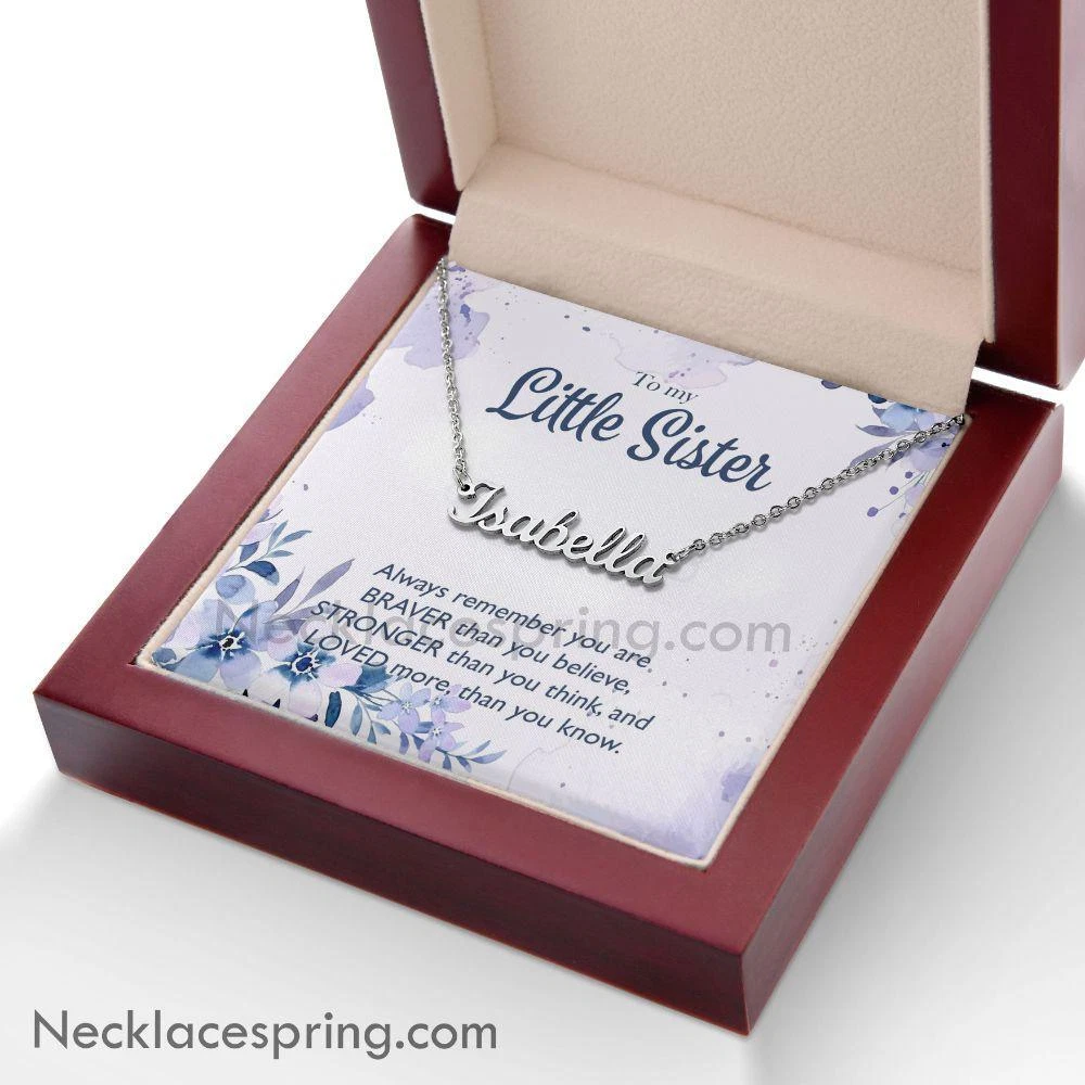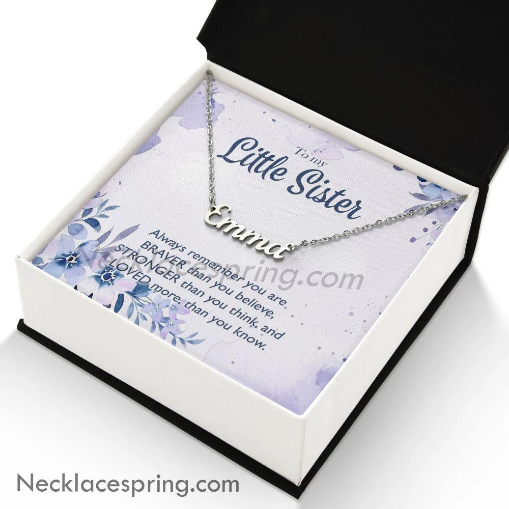 Custom Name Little Sister Necklace Gift From Big Brother, Always Remember You Are Loved, Little Sister Birthday, Christmas Gift Personalized Necklace Give your special someone a custom necklace made just for them! Our Personalized Name Necklace is the perfect gift for your loved ones and will become a versatile accessory for any occasion. From a heart-warming holiday present, anniversary or birthday gift. This stylish necklace features a cursive name design suspended on an 16″-18″ adjustable cable chain, making it both personal and beautiful! Your necklace will be custom made upon ordering in the name or word of your choice, with up to 10 characters. It’s a gift that they will surely want to keep close to their heart forever! Product specifications: Customized with up to 10 characters Polished stainless steel Adjustable cable chain (16″-18″) 9mm lobster clasp