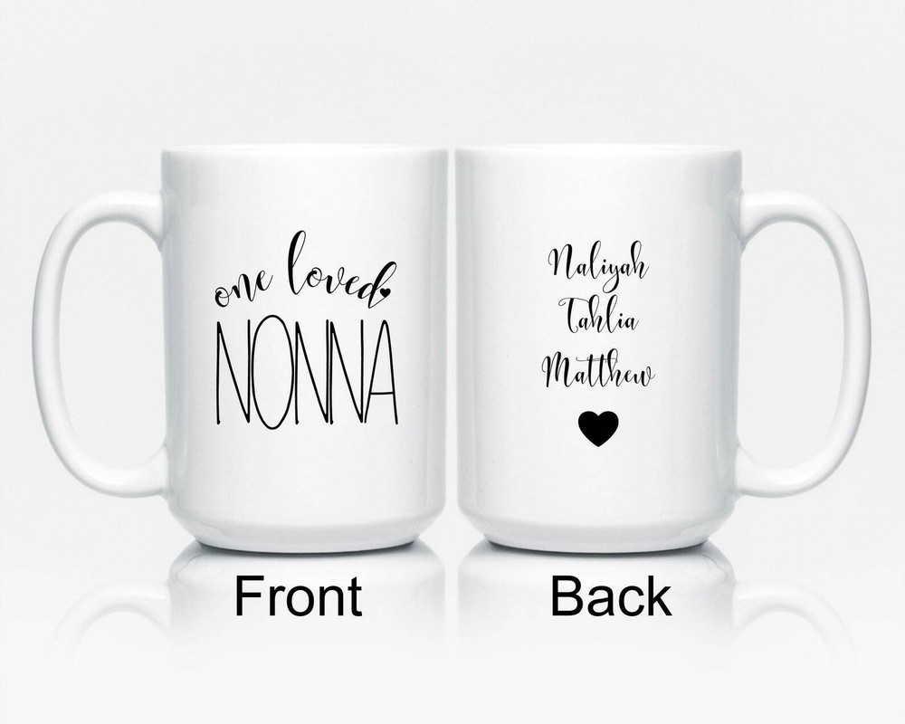 One Loved Nonna Mug Nonna Gift Nonna Coffee Mug Nonna Cup With Grandkids Names Product Details.. This high quality 11oz. ceramic white mug has a premium hard coat that provides crisp and vibrant color reproduction sure to last for years. Perfect for all hot & cold beverages. The highest quality printing possible is used. It will never fade no matter how many times you wash it. Material: 100% Ceramic. Print both sides. Dishwasher and Microwave Safe. High Gloss + Premium White Finish. Printed in the U.S.A. Personalized & Custom. We support personalized and custom mug to add custom, when placing an order, you can add notes to the "order note" in shipping address section. Also you can contact us directly via message. Shipping Info. Ready to ship in 1 to 2 business days, All products are made-to-order and proudly printed in the United States. Shipped by USPS and DHL, You will receive your order in 5-7 days. Replace & Refund. All products are defective during shipping broken, chipped will be replaced free of charge. You are not satisfied with the product, we will refund 100% money to you. If any other issues arise, please do not hesitate to message, we would be more than happy to assist you.