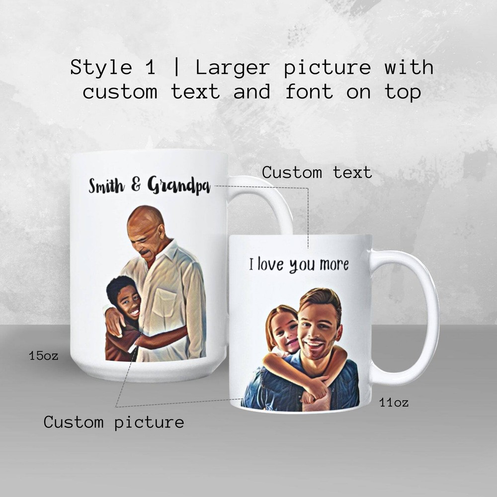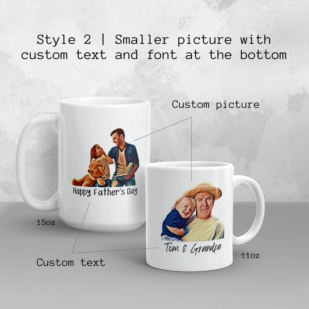 Personalized Fathers Day Painted Photo Mug Custom 2 Sided Photo Mug Mug With Product Details.. This high quality 11oz. ceramic white mug has a premium hard coat that provides crisp and vibrant color reproduction sure to last for years. Perfect for all hot & cold beverages. The highest quality printing possible is used. It will never fade no matter how many times you wash it. Material: 100% Ceramic. Print both sides. Dishwasher and Microwave Safe. High Gloss + Premium White Finish. Printed in the U.S.A. Personalized & Custom. We support personalized and custom mug to add custom, when placing an order, you can add notes to the "order note" in shipping address section. Also you can contact us directly via message. Shipping Info. Ready to ship in 1 to 2 business days, All products are made-to-order and proudly printed in the United States. Shipped by USPS and DHL, You will receive your order in 5-7 days. Replace & Refund. All products are defective during shipping broken, chipped will be replaced free of charge. You are not satisfied with the product, we will refund 100% money to you. If any other issues arise, please do not hesitate to message, we would be more than happy to assist you.