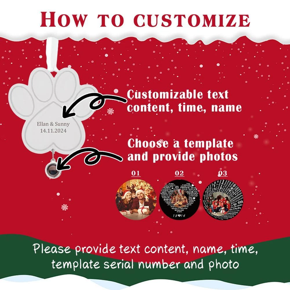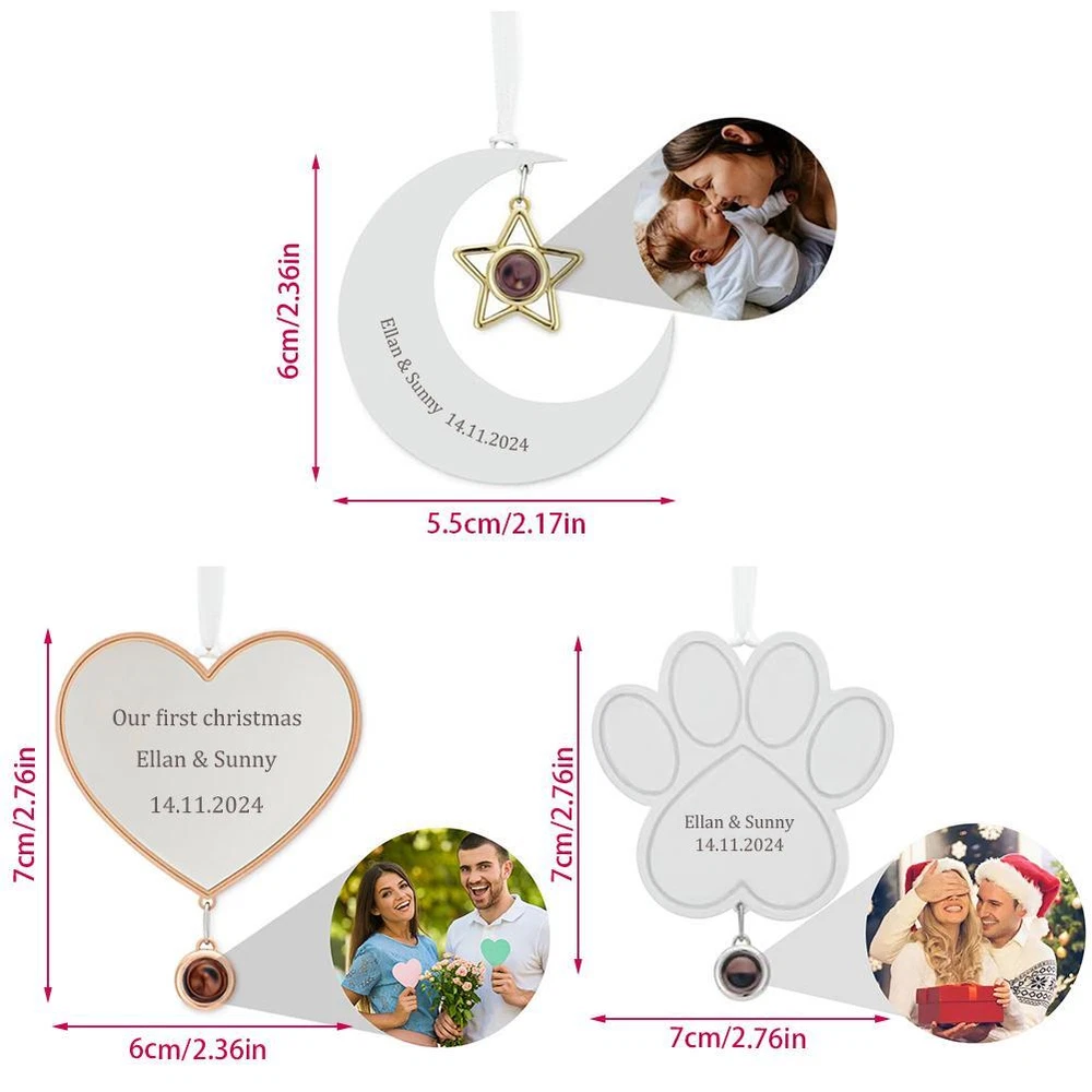 Description Description&Preview shipping&policy Description: Name: Customized Christmas tree pendant Material: alloy Moon: 5.5*6cm/2.17 inches × 2.36 inches Dog Paw: 7*6cm/2.76 inches × 2.36 inches Heart: 7*6cm/2.76 inches × 2.36 inches Customized content I: text + name Customized content two: time Customized content two: choose the template Customized content three: provide pictures Description. MEANINGFUL CHRISTMAS PHOTO DECORATION: No matter the distance, your loved ones can still be part of your holiday celebration. Capture precious moments of your family, friends or pets by printing their photos on a projection stone. You can also include heartfelt messages or icons that resonate with you. ELEGANT HOLIDAY DECORATION: Each personalized Christmas ornament comes with a beautiful ribbon, perfect for hanging on your tree, car or windowsill. The ribbon complements the beauty of the ornament, ensuring it blends seamlessly into your holiday decor. PREMIUM QUALITY MATERIALS: Made from quality metals including alloy, copper and stainless steel, each personalized ornament is crafted by skilled artisans. These keepsake pendants are designed to preserve your precious memories and important moments. PERFECT GIFT: This Christmas ornament is an ideal gift for girlfriends, boyfriends, friends and family. It is perfect for birthdays, Valentine's Day, anniversaries, Christmas, graduations and Mother's Day. SATISFACTION GUARANTEED: We offer a 100% quality guarantee and exceptional customer service. Our team is available 24/7 to answer your inquiries and provide assistance. If you have any questions about our Christmas decorations, please feel free to contact us - we are always here to help! Product List Customized Christmas Hanging Decoration*1 Preview: Thank you for your purchase Problems? You can follow below process to contact us. There is a time zone difference,but we will do our best to quickly response to your questions: Shipping ● We will arrange shipping for you within 24 Hours after payment cleared except the holidays. ● We always send the item to the address you give us on Payoneer to ensure the security of the item. If you have changed your address, or want us to ship to another address, please change to the new address when you pay us with Payoneer, otherwise we will not be responsible if the package is lost. Payments We accepts Payoneer only If you have any questions about the payment,please contact us through eBay message. Import Duties In case some duty is due Upon delivery, it is your responsibility to meet that expense and this may cause delays to delivery schedule and you may have to pickup goods at the customs office. Terms & Conditions By bidding on this item,the Buyer agrees to all of the terms and conditions as outlined in this listing .please ensure to read and agree to All eBay terms and Conditions before bidding. All pictures are for illustration purpose only and Colours may vary slightly. Our store obeys all eBay Rules and Policies. Returns Policy To Return an item you must contact us and take photos of your item to clearly show any damage or unusual aspects of it. Approved returns will be subject to inspection on arrival. Items must be returned in original condition with all original packaging. All shipping and handing charges are non-refundable Return delivery costs are the responsibility of the buyer. We will cover the cost if sending replacement/repaired items. Within 7 days after receiving your products, we offers a no-hassle 7 day exchange/replace only if your items are found to be defective by manufacturer.