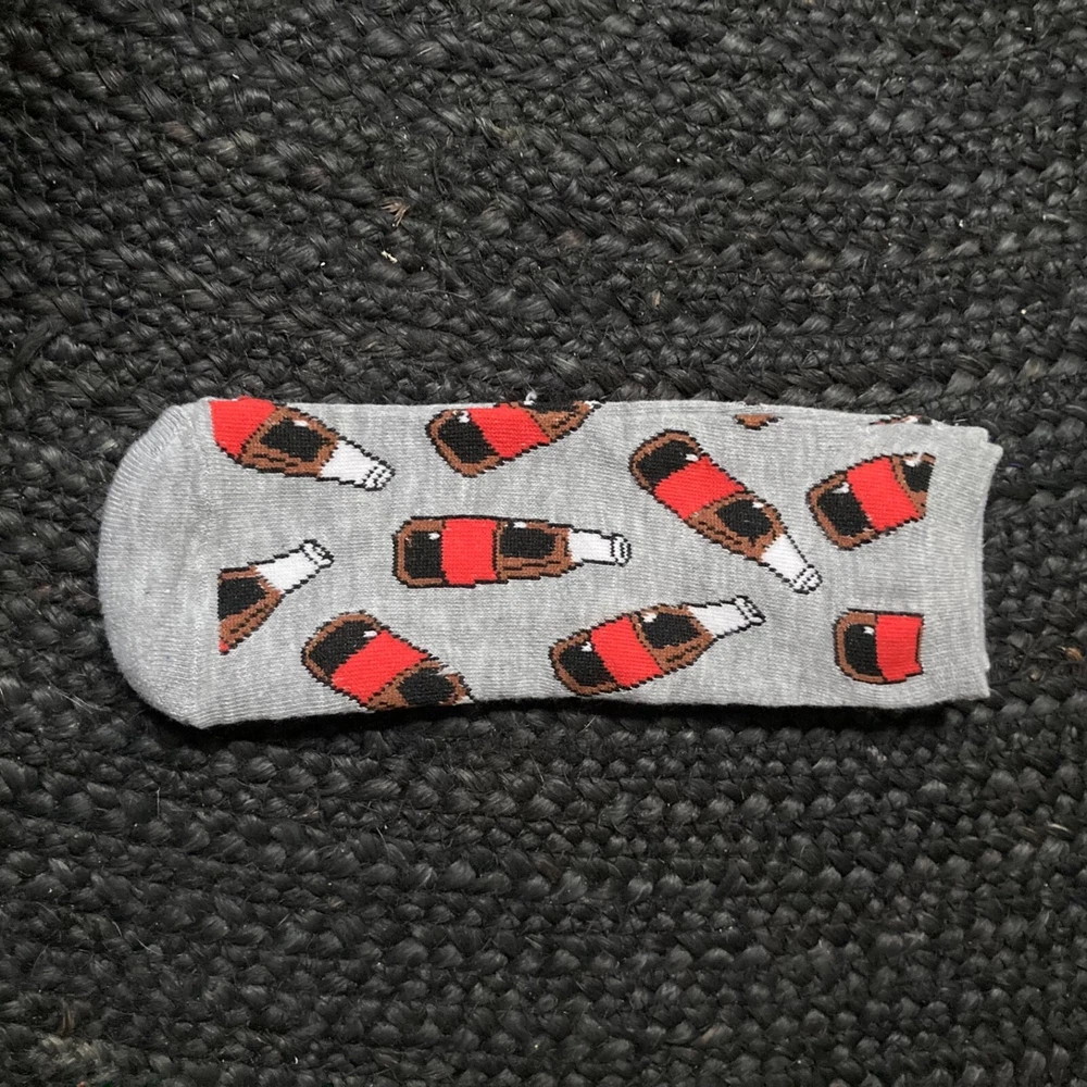 Custom socks designed for men in size 8-12. Ankle length, Low-cut, full-toe socks. Perfect for casual occasions and feature a coke bottle pattern in a multicolor design. Made from a blend of polyester, cotton, and cotton blend materials, they are lightweight, breathable, and moisture-wicking, making them suitable for all seasons. These athletic socks provide support and cushioning, making them ideal for various activities such as running, hiking, gym training, or kicking back with your ice cold soda. Whether you like hipster, quirky, fun, or just plain socks to wear, and these are great for anyone looking for a comfortable and stylish pair. Made in Vietnam. Men’s size 8-12 or Women’s size 10-13. You will have fun adding these to any sock collection. Check out other designs listed.