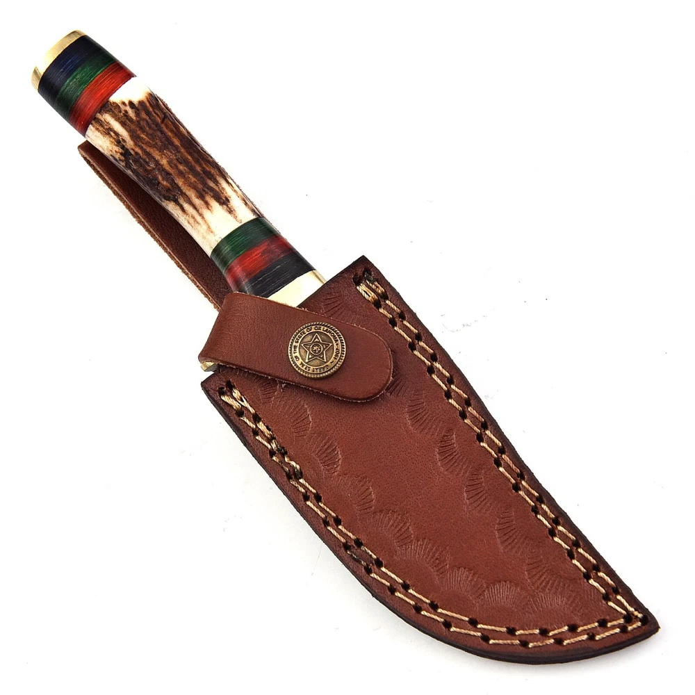 Description: CUSTOM HAND FORGED DAMASCUS STEEL Hunting KNIFE This superb design knife is hand forged. Blade of this knife has a nice file work and is made of 512 layers of stainless steel and high carbon steel with hardness 55-60 HRC. This process takes approximately 48 hours to complete. This robust knife is lab tested under intense conditions, the balance and shape of this knife ensures perfect grip. All our knives are handmade similar to the photo, differences as such as color and patterns of the natural materials used will differ somewhat because these are all natural materials. Every item will be considered as an original because no one item is ever identical to the other, they are handmade and natural materials are never identical. Because they are handmade they may have slight imperfections because they are NEVER MACHINE MADE and this makes it original in its own way. Specifications: Handle Material : Stag Horn + Brass Blade Material : Damascus steel Overall Length : 8 inches Handle Length : 4 inches Blade Length : 4 inches Layers: 512 Sheath: Leather Hardness: 55-58 HRC Package Includes: Knife with Original Leather Sheath AGE RESTRICTION: WE DON'T SELL KNIVES TO ANY ONE WHO IS UNDER AGE 18. WHEN YOU BUY A KNIFE FROM US YOU ARE CONFIRMING THAT YOUR AGE QUALIFIES FOR THIS PURCHASE AND THIS IS A LEGAL PURCHASE. Lift US TAKES NO RESPONSIBILITY FOR ANY ILLEGAL PURCHASE. Care Instructions: Keep the knife dry after each cleaning. Warning: Take care when removing product from packaging. Keep fingers clear of blades. Store away from children. We are not responsible for injuries caused by the use of this item. FEEDBACK POLICY: YOUR FEEDBACK IS VERY IMPORTANT FOR US, IF THEIR IS ANY KIND OF PROBLEM PLEASE GIVE US OPPORTUNITY TO SORT THE ISSUE We do sell wholesale, please contact us for special discounts on bulk orders.