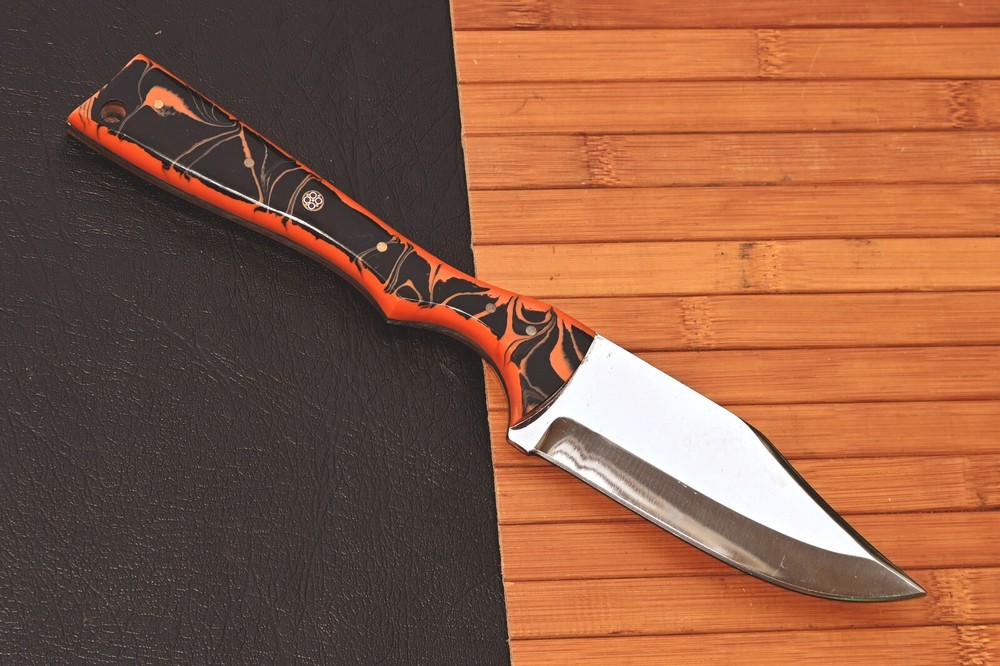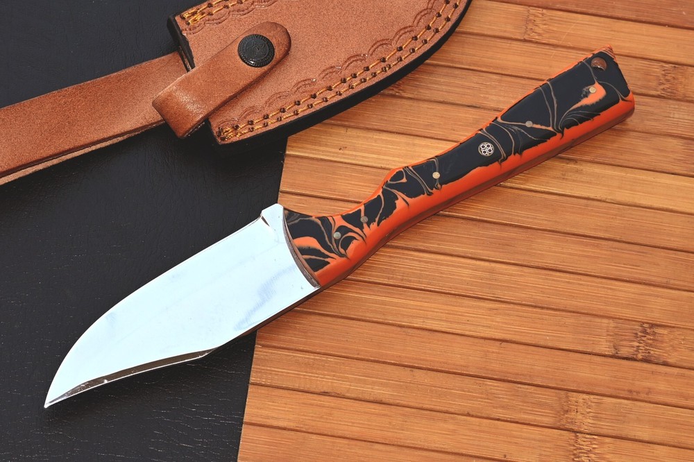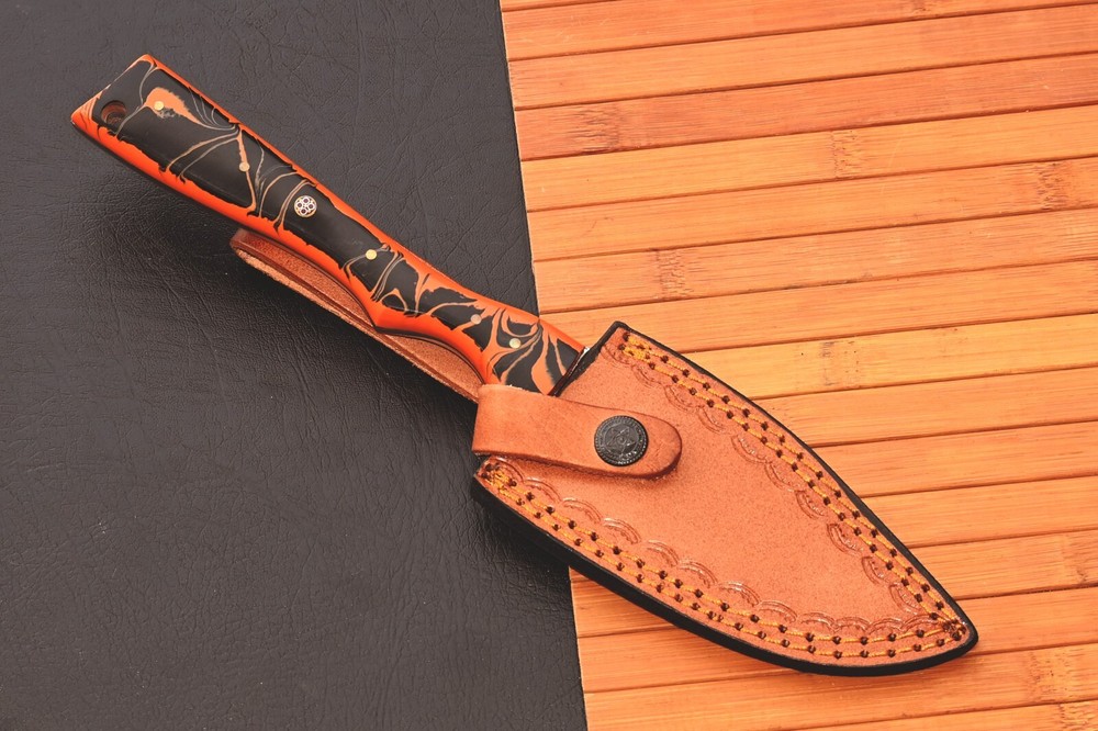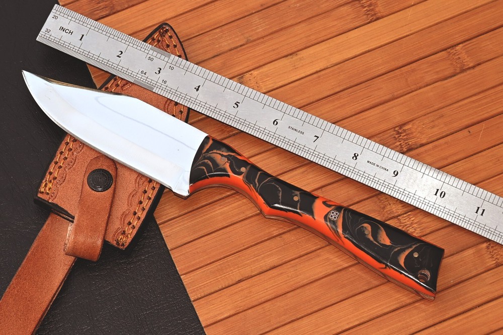 HAND FORGED HIGH POLISH CARBON STEEL BALDE HUNTING KNIFE Resin Handle This superb design knife is hand forged. Blade of this knife has a nice file work. The balance and shape of this knife ensures perfect grip. Overall Length: 11” Inches Blade Length: 5 ”Inches Handle Length: 6 ”Inches Package Includes: with Leather Sheath Warning: Keep fingers clear of blades. Store away from children.