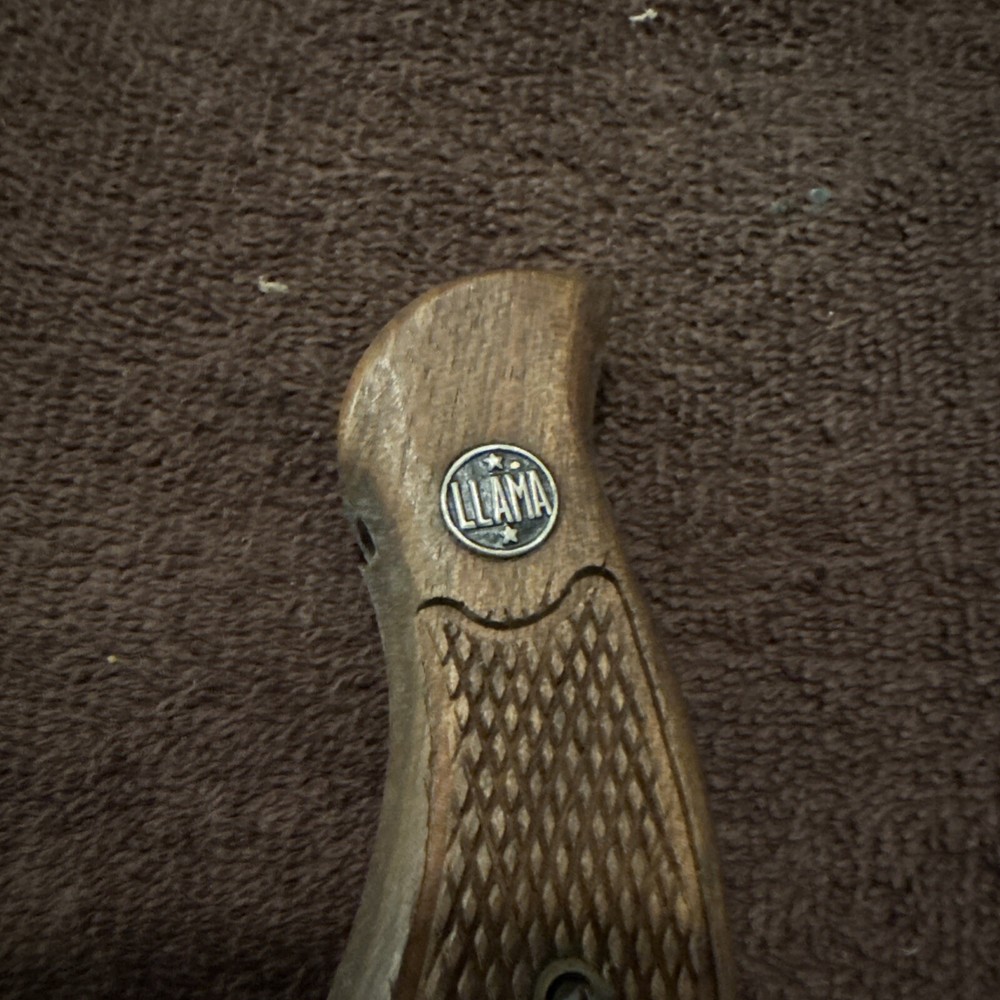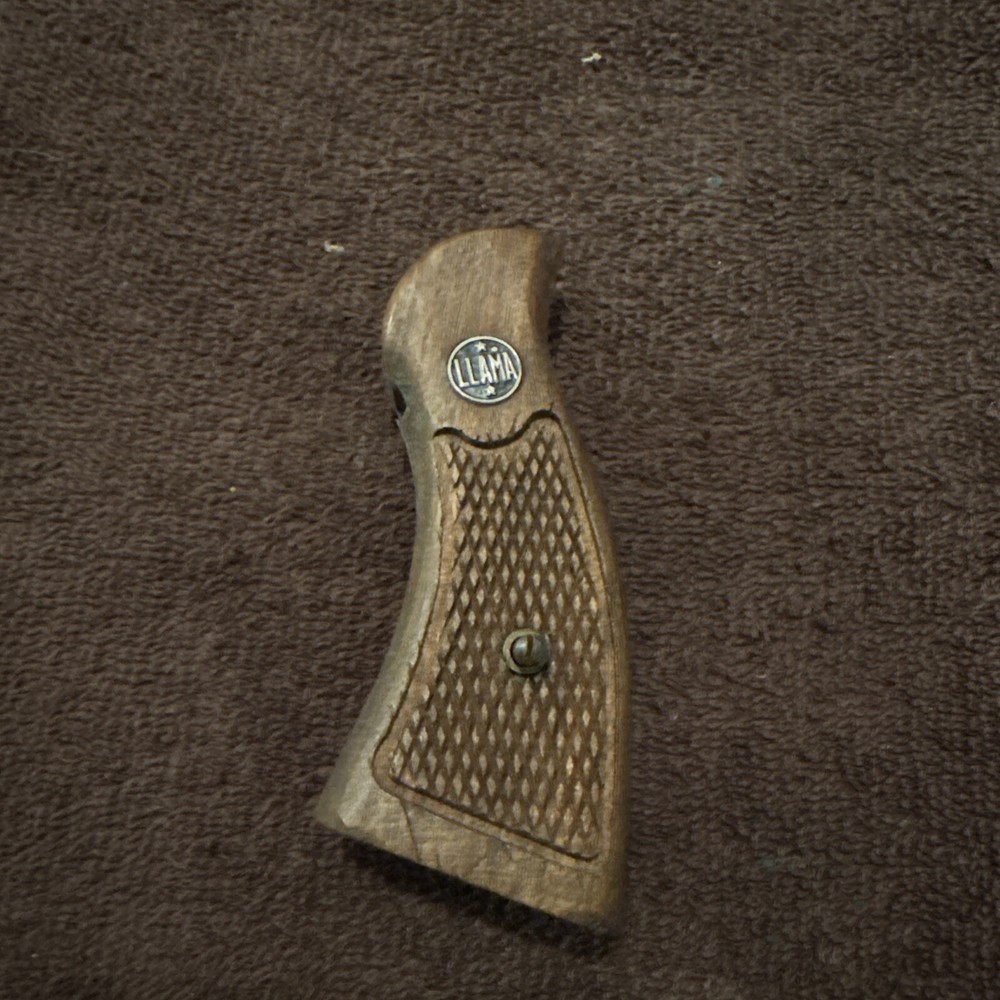 The product is a set of Llama brand wood grips designed for a Llama martial revolver. These OEM grips are made in the United States and feature a brown color. They are specifically designed for a handgun and provide a classic, wooden grip for the firearm.
