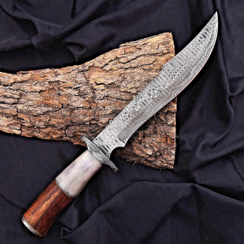 CUSTOM HAND MADE HAND FORGED DAMASCUS STEEL BOWIE HUNTING KNIFE SURVIVAL CAMPING HIKING BUSHCRAFT CAMEL BONE & WOOD WITH DAMASCUS STEEL GUARD HANDLE This superb design knife is hand forged. Blade of this knife has a nice file work and is made of 512 layers of 4340 stainless steel and 1075 high carbon steel and hardness 55-58 HRC . This robust knife is lab tested under intense conditions, the balance and shape of this knife ensures perfect grip. Overall Length: 15" Inches Blade Length: 10" Inches Handle Length: 5" Inches Damascus Design: Ladder Pattern Layers: 512 Sheath: Leather Hardness: 55-58 HRC Package Includes: with Leather Sheath Warning: Keep fingers clear of blades. Store away from children.
