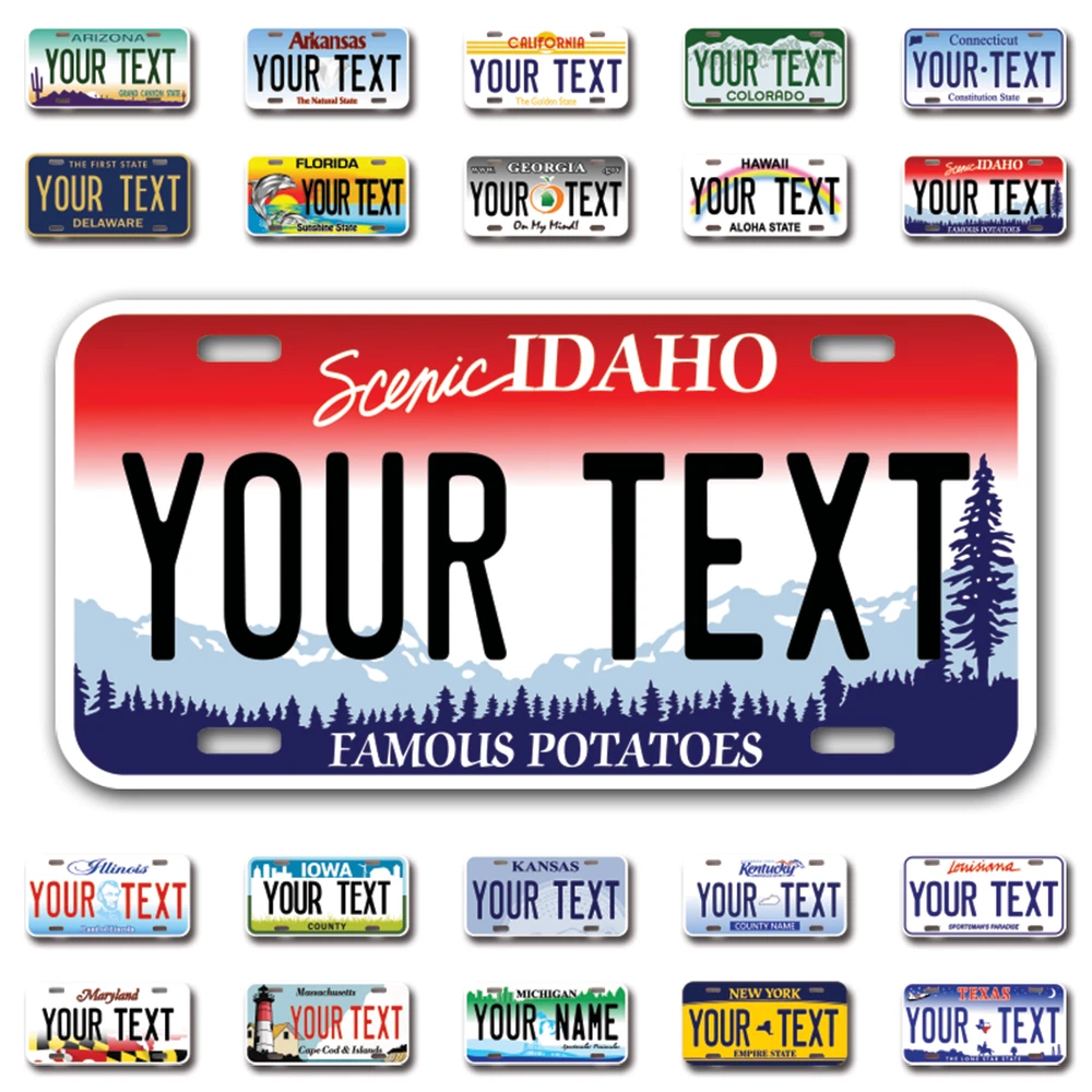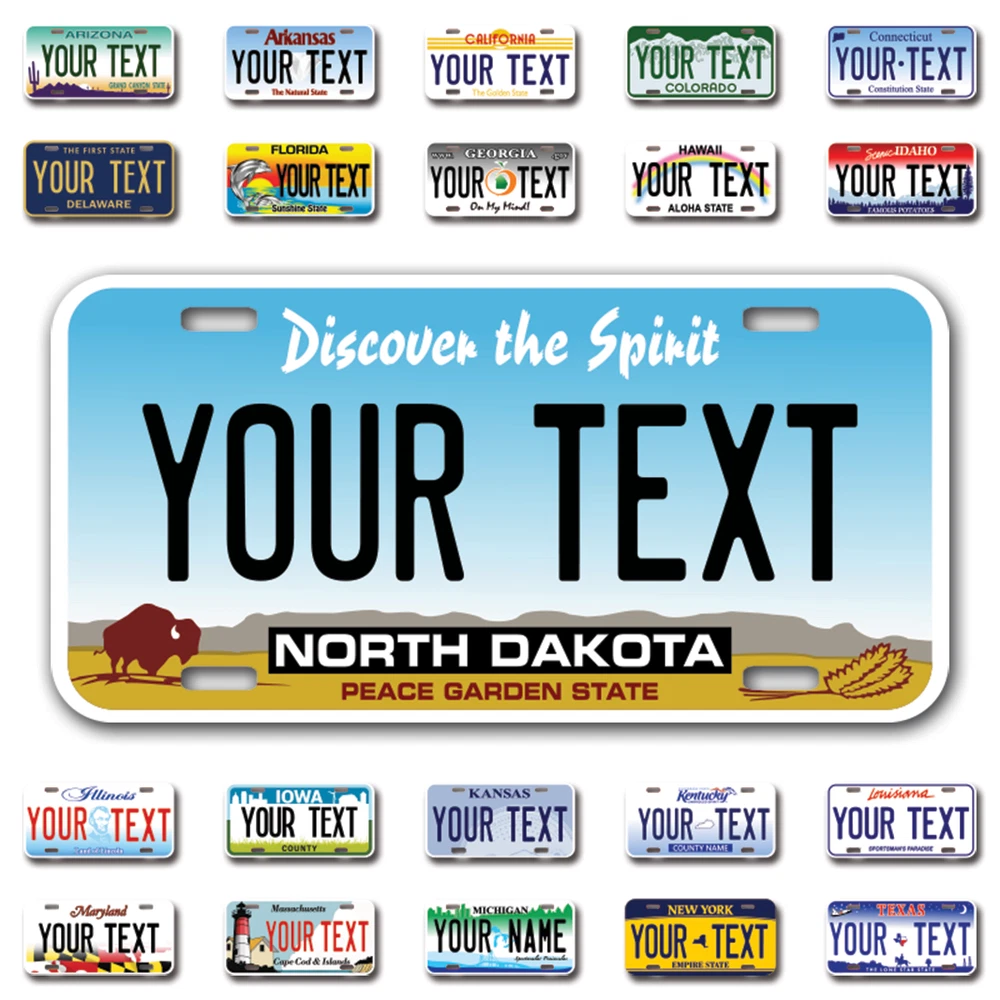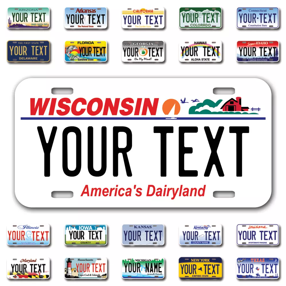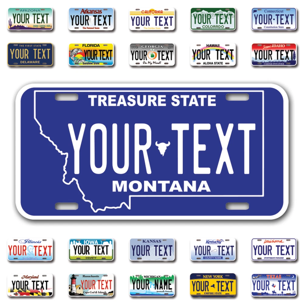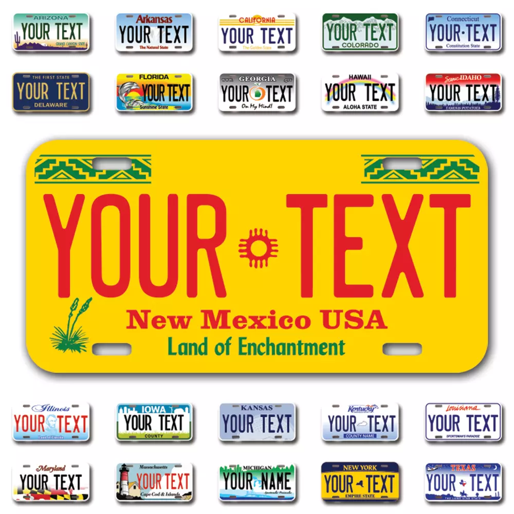 Our LICENSE plates are the most unique souvenirs from the United States, Choose between 50 states and 3 different sizes. Cannot be used in place of a state issued plate. IMPORTANT DESCRIPTION • Plates are made using High quality thick 040 rust free Aluminum. • Our plates are printed flat, not raised. The customizing is done using the latest UV Laser technique for weatherproof and high-quality finish. • 100% made in USA. • Standard car plate has four holes and can be used for trucks, motor homes, and more • M otorcycle plates have 2 holes on top for mounting and can be used on ATVS, Mopeds, Snowmobiles, wheelchairs and golf carts • B ike plates have two holes on top and can also be used for toy cars, wagons, electric toy cars, tricycles and more • Write your text in the personalization section. The text will be copied and pasted on the license plate as sent, so make sure of the spelling, punctuation, capitalization, etc. If you have any question regarding your text or you would like a preview, please let us know by adding a note or contacting Alabama | Alaska | Arizona | Arkansas | California | Colorado | Connecticut | Delaware | Florida | Georgia | Hawaii | Idaho | Illinois | Indiana | Iowa | Kansas | Kentucky | Louisiana | Maine | Maryland | Massachusetts | Michigan | Minnesota | Mississippi | Missouri | Montana | Nebraska | Nevada | New Hampshire | New Jersey | New Mexico | New York | North Carolina | North Dakota | Ohio | Oklahoma | Oregon | Pennsylvania | Puerto Rico | Rhode Island | South Carolina | South Dakota | Tennessee | Texas | Utah | Vermont | Virginia | Washington | West Virginia | Wisconsin | Wyoming