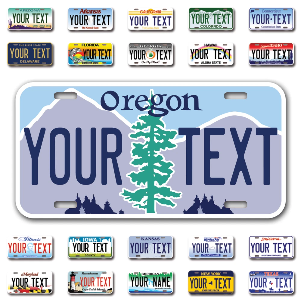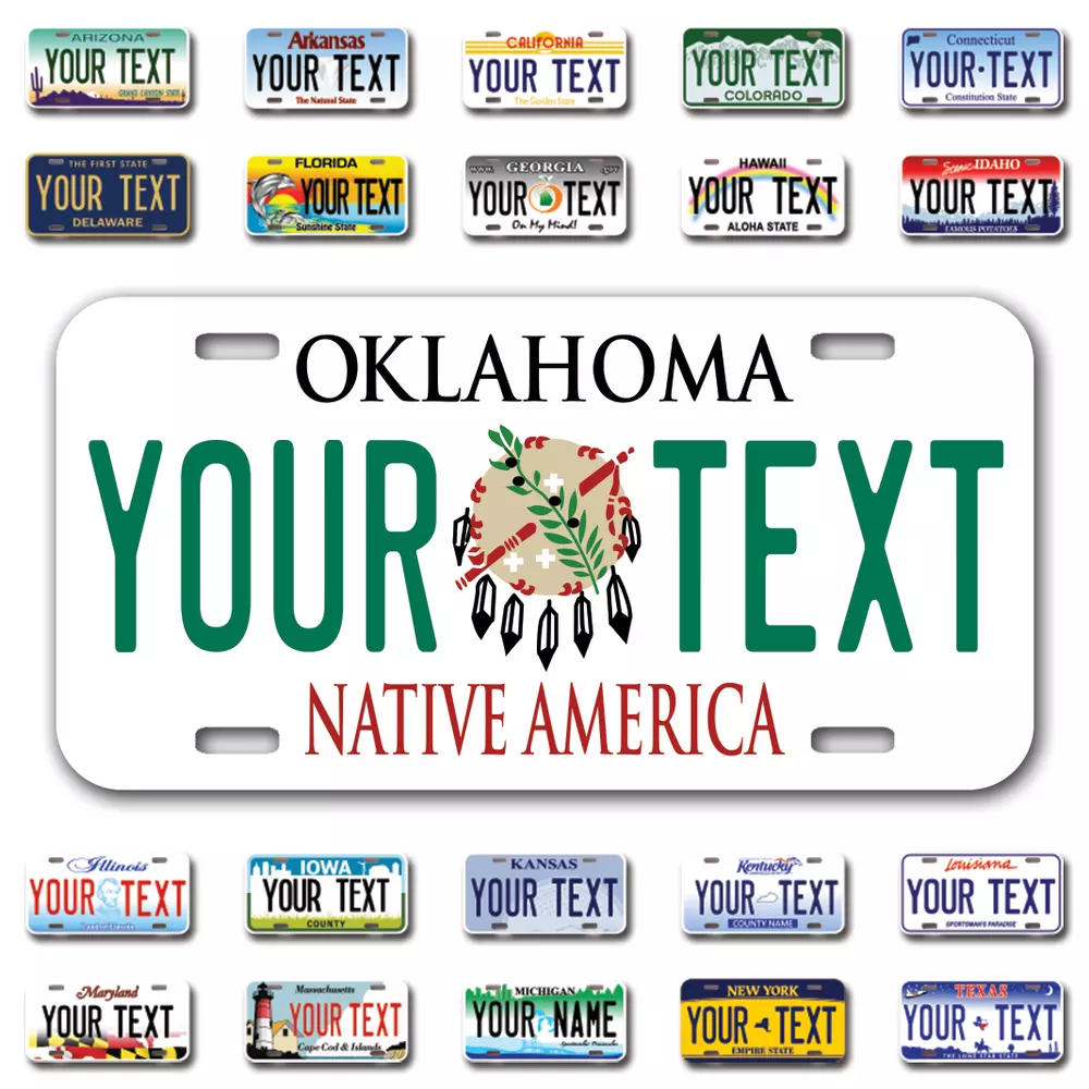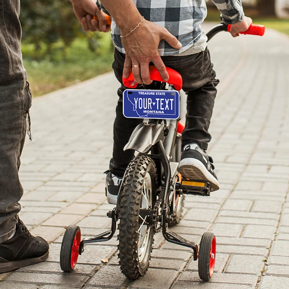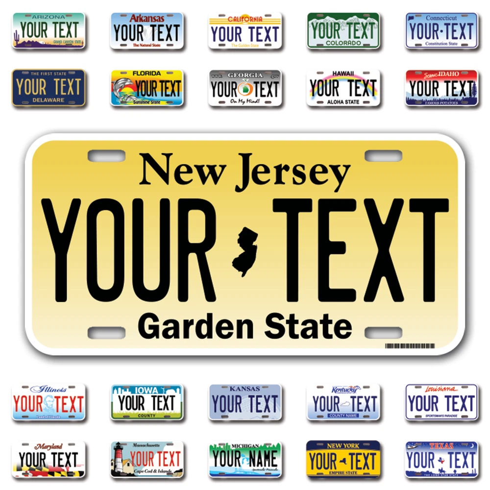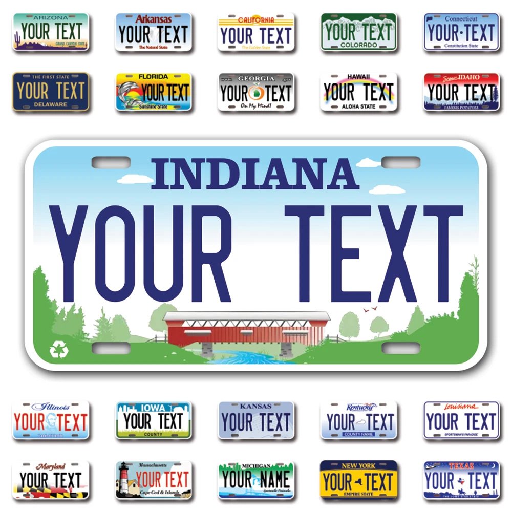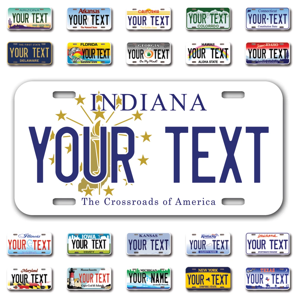 Our LICENSE plates are the most unique souvenirs from the United States, Choose between 50 states and 3 different sizes. Cannot be used in place of a state issued plate. IMPORTANT DESCRIPTION • Plates are made using High quality thick 040 rust free Aluminum. • Our plates are printed flat, not raised. The customizing is done using the latest UV Laser technique for weatherproof and high-quality finish. • 100% made in USA. • Standard car plate has four holes and can be used for trucks, motor homes, and more • M otorcycle plates have 2 holes on top for mounting and can be used on ATVS, Mopeds, Snowmobiles, wheelchairs and golf carts • B ike plates have two holes on top and can also be used for toy cars, wagons, electric toy cars, tricycles and more • Write your text in the personalization section. The text will be copied and pasted on the license plate as sent, so make sure of the spelling, punctuation, capitalization, etc. If you have any question regarding your text or you would like a preview, please let us know by adding a note or contacting Alabama | Alaska | Arizona | Arkansas | California | Colorado | Connecticut | Delaware | Florida | Georgia | Hawaii | Idaho | Illinois | Indiana | Iowa | Kansas | Kentucky | Louisiana | Maine | Maryland | Massachusetts | Michigan | Minnesota | Mississippi | Missouri | Montana | Nebraska | Nevada | New Hampshire | New Jersey | New Mexico | New York | North Carolina | North Dakota | Ohio | Oklahoma | Oregon | Pennsylvania | Puerto Rico | Rhode Island | South Carolina | South Dakota | Tennessee | Texas | Utah | Vermont | Virginia | Washington | West Virginia | Wisconsin | Wyoming