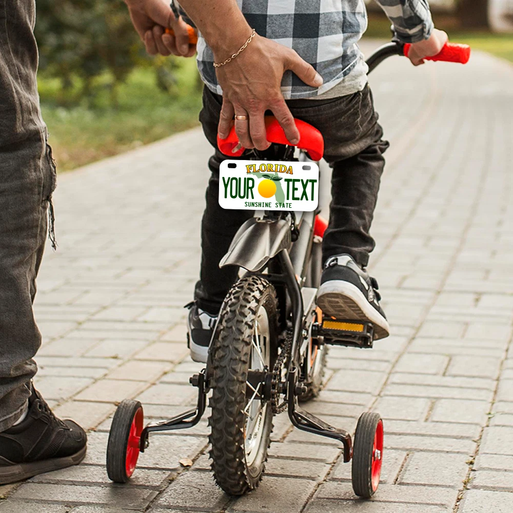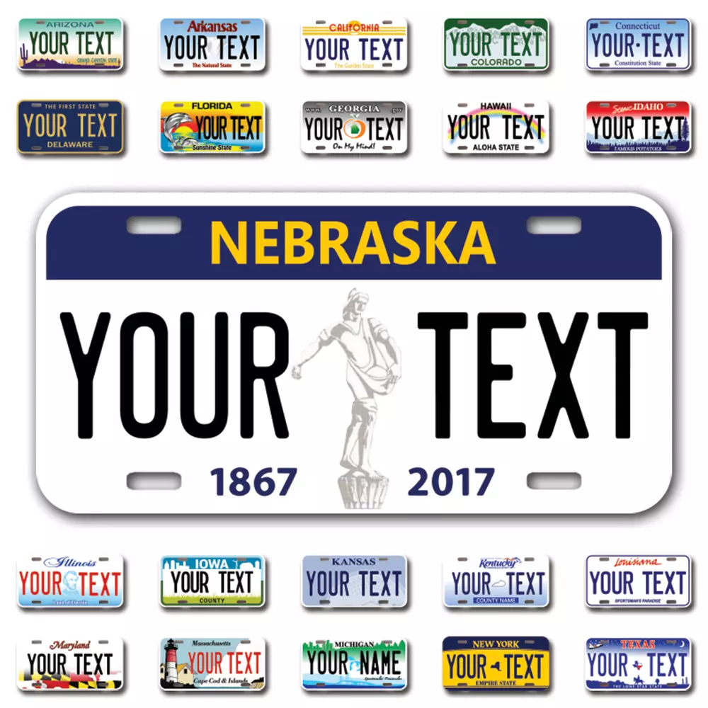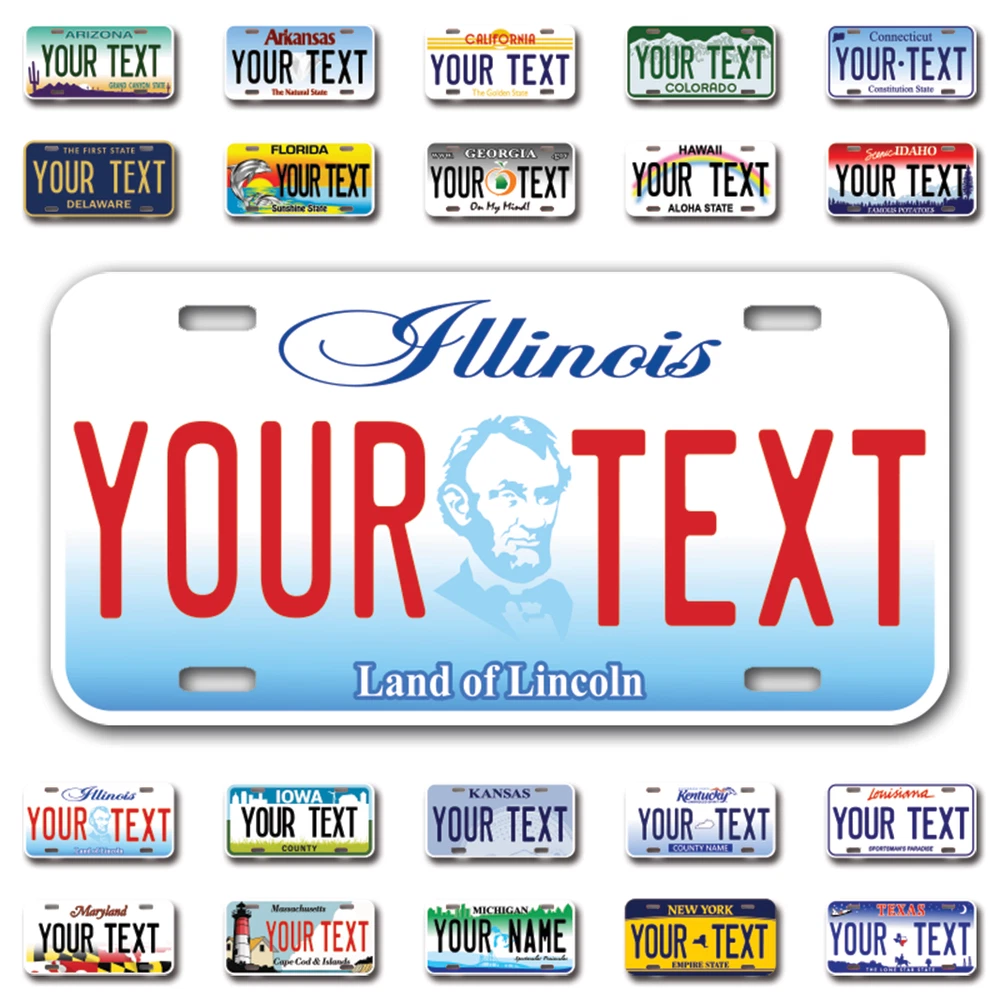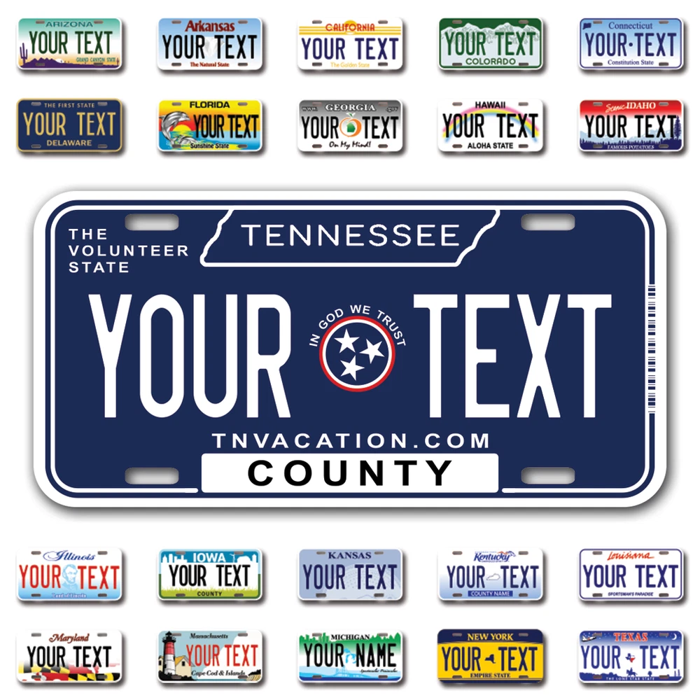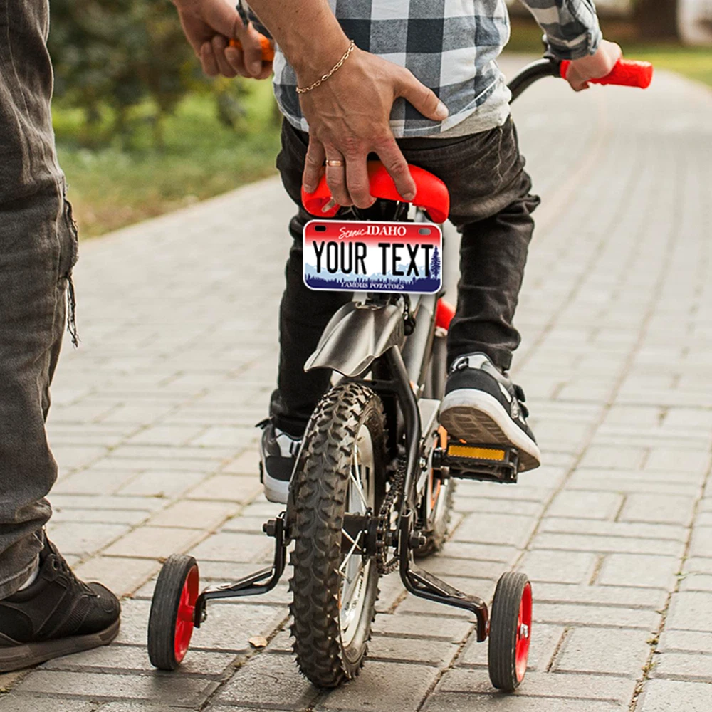 Our LICENSE plates are the most unique souvenirs from the United States, Choose between 50 states and 3 different sizes. Cannot be used in place of a state issued plate. IMPORTANT DESCRIPTION • Plates are made using High quality thick 040 rust free Aluminum. • Our plates are printed flat, not raised. The customizing is done using the latest UV Laser technique for weatherproof and high-quality finish. • 100% made in USA. • Standard car plate has four holes and can be used for trucks, motor homes, and more • M otorcycle plates have 2 holes on top for mounting and can be used on ATVS, Mopeds, Snowmobiles, wheelchairs and golf carts • B ike plates have two holes on top and can also be used for toy cars, wagons, electric toy cars, tricycles and more • Write your text in the personalization section. The text will be copied and pasted on the license plate as sent, so make sure of the spelling, punctuation, capitalization, etc. If you have any question regarding your text or you would like a preview, please let us know by adding a note or contacting Alabama | Alaska | Arizona | Arkansas | California | Colorado | Connecticut | Delaware | Florida | Georgia | Hawaii | Idaho | Illinois | Indiana | Iowa | Kansas | Kentucky | Louisiana | Maine | Maryland | Massachusetts | Michigan | Minnesota | Mississippi | Missouri | Montana | Nebraska | Nevada | New Hampshire | New Jersey | New Mexico | New York | North Carolina | North Dakota | Ohio | Oklahoma | Oregon | Pennsylvania | Puerto Rico | Rhode Island | South Carolina | South Dakota | Tennessee | Texas | Utah | Vermont | Virginia | Washington | West Virginia | Wisconsin | Wyoming