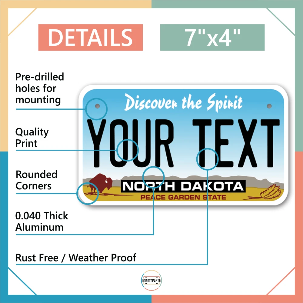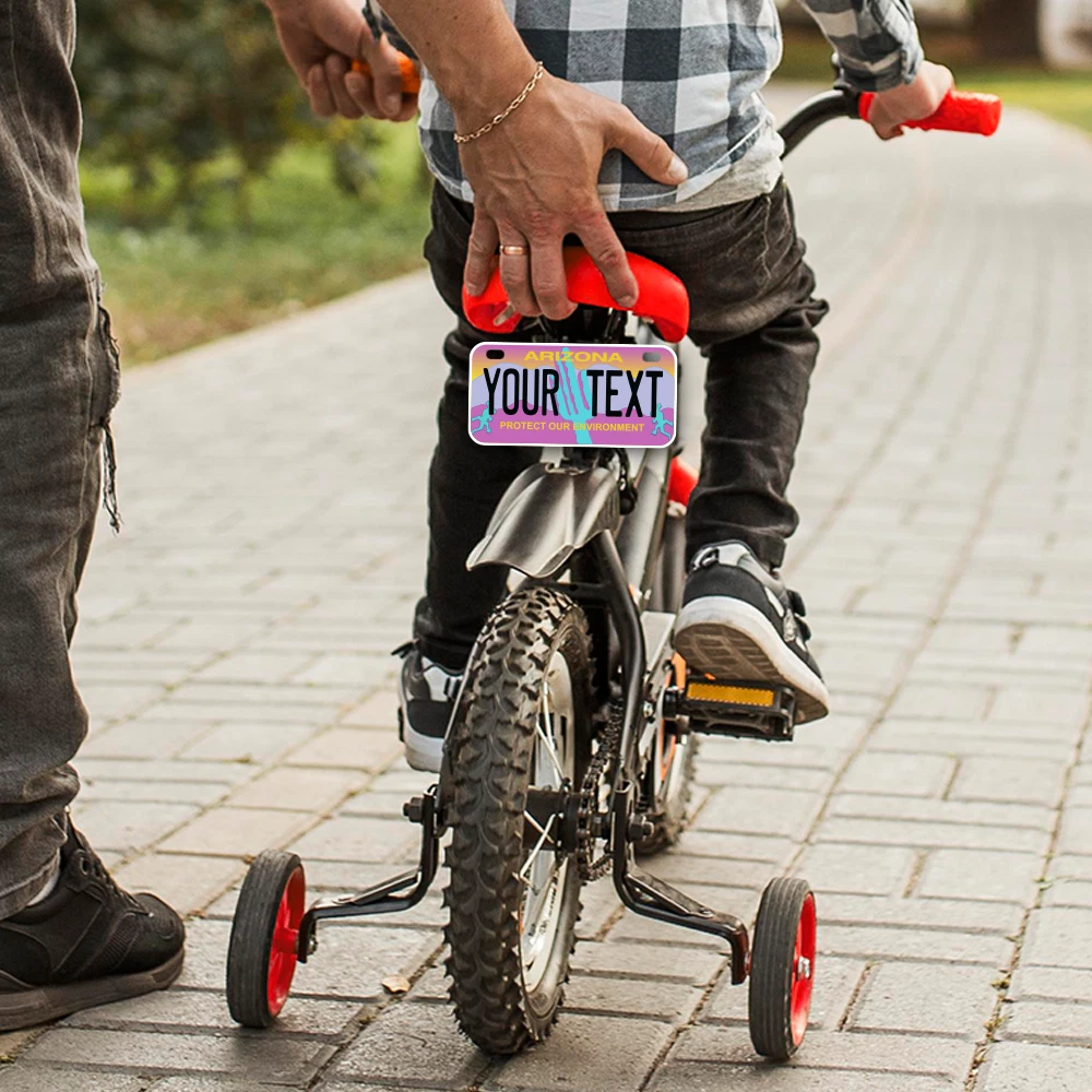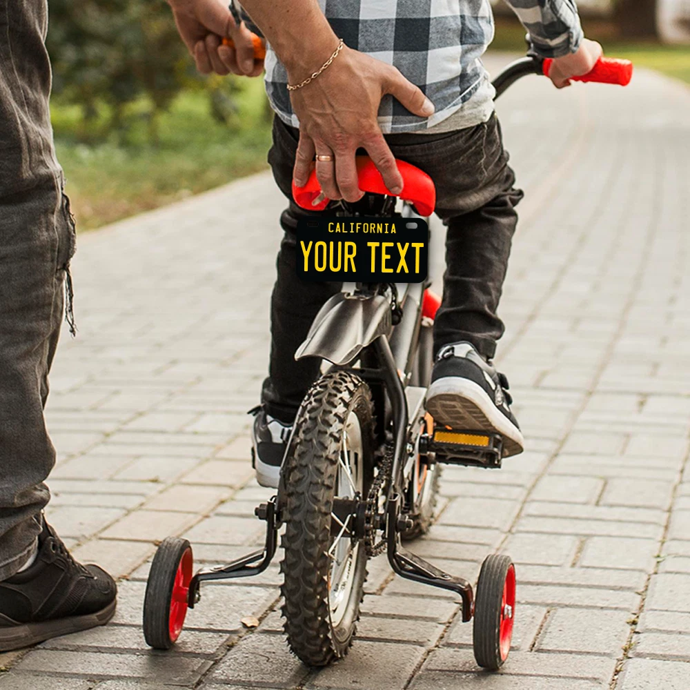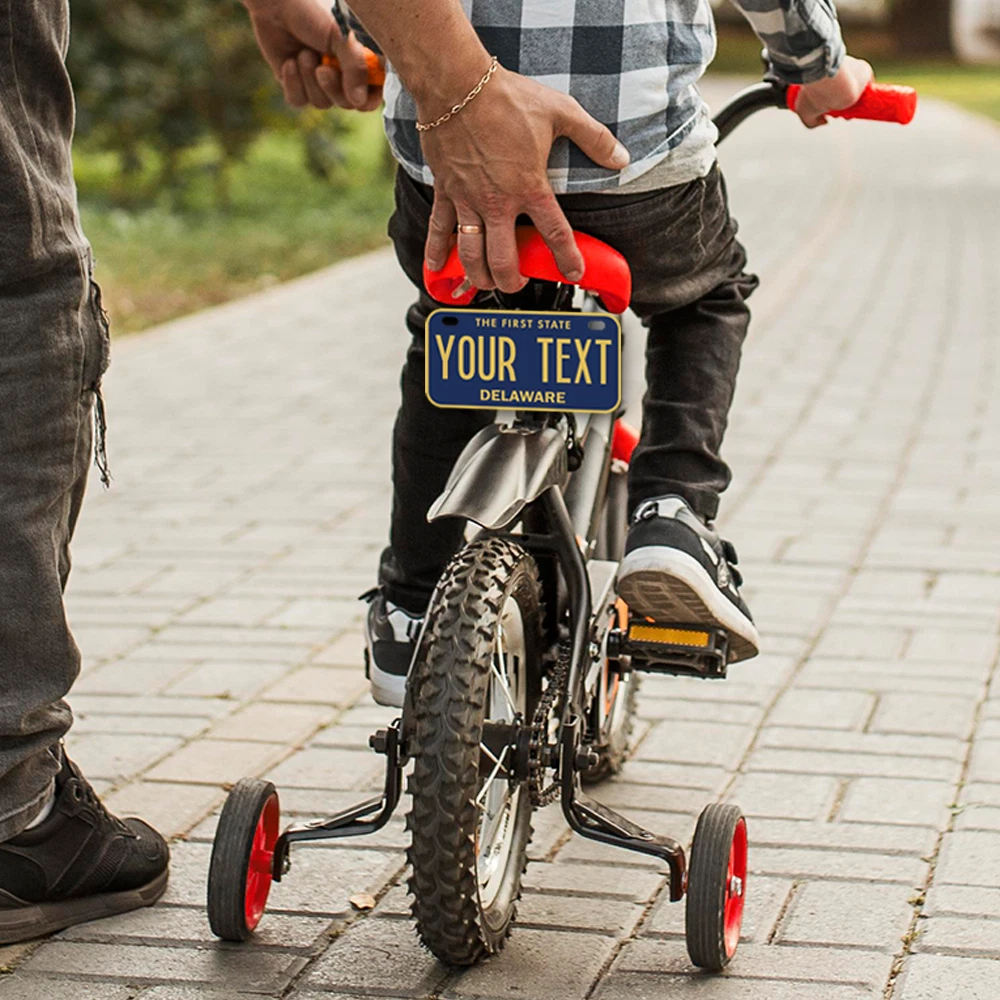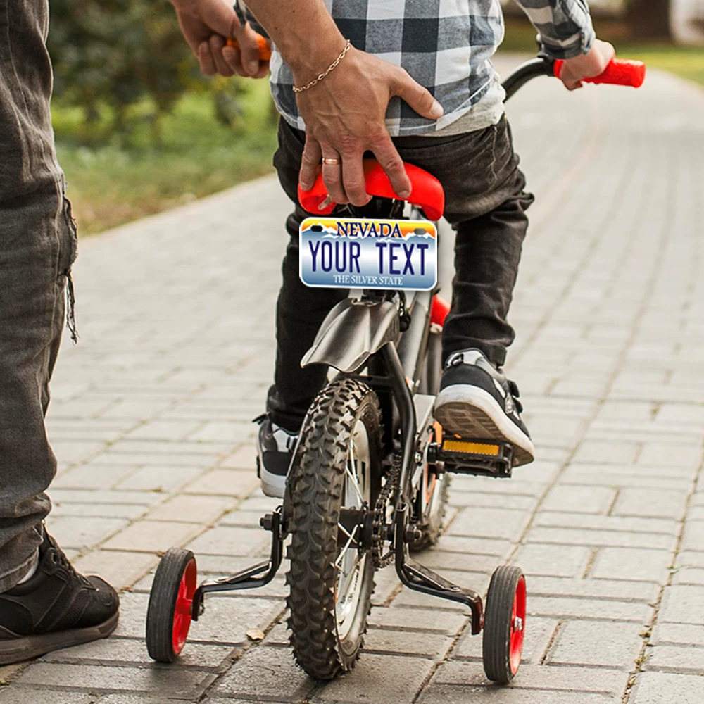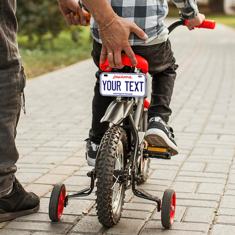 Our LICENSE plates are the most unique souvenirs from the United States, Choose between 50 states and 3 different sizes. Cannot be used in place of a state issued plate. IMPORTANT DESCRIPTION • Plates are made using High quality thick 040 rust free Aluminum. • Our plates are printed flat, not raised. The customizing is done using the latest UV Laser technique for weatherproof and high-quality finish. • 100% made in USA. • Standard car plate has four holes and can be used for trucks, motor homes, and more • M otorcycle plates have 2 holes on top for mounting and can be used on ATVS, Mopeds, Snowmobiles, wheelchairs and golf carts • B ike plates have two holes on top and can also be used for toy cars, wagons, electric toy cars, tricycles and more • Write your text in the personalization section. The text will be copied and pasted on the license plate as sent, so make sure of the spelling, punctuation, capitalization, etc. If you have any question regarding your text or you would like a preview, please let us know by adding a note or contacting Alabama | Alaska | Arizona | Arkansas | California | Colorado | Connecticut | Delaware | Florida | Georgia | Hawaii | Idaho | Illinois | Indiana | Iowa | Kansas | Kentucky | Louisiana | Maine | Maryland | Massachusetts | Michigan | Minnesota | Mississippi | Missouri | Montana | Nebraska | Nevada | New Hampshire | New Jersey | New Mexico | New York | North Carolina | North Dakota | Ohio | Oklahoma | Oregon | Pennsylvania | Puerto Rico | Rhode Island | South Carolina | South Dakota | Tennessee | Texas | Utah | Vermont | Virginia | Washington | West Virginia | Wisconsin | Wyoming