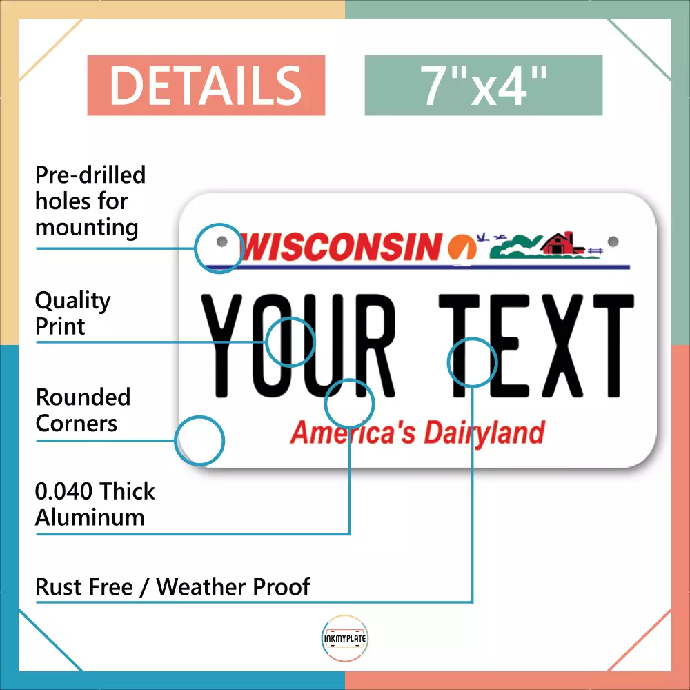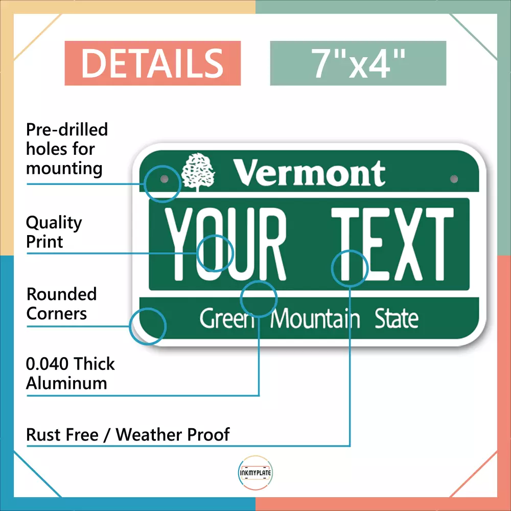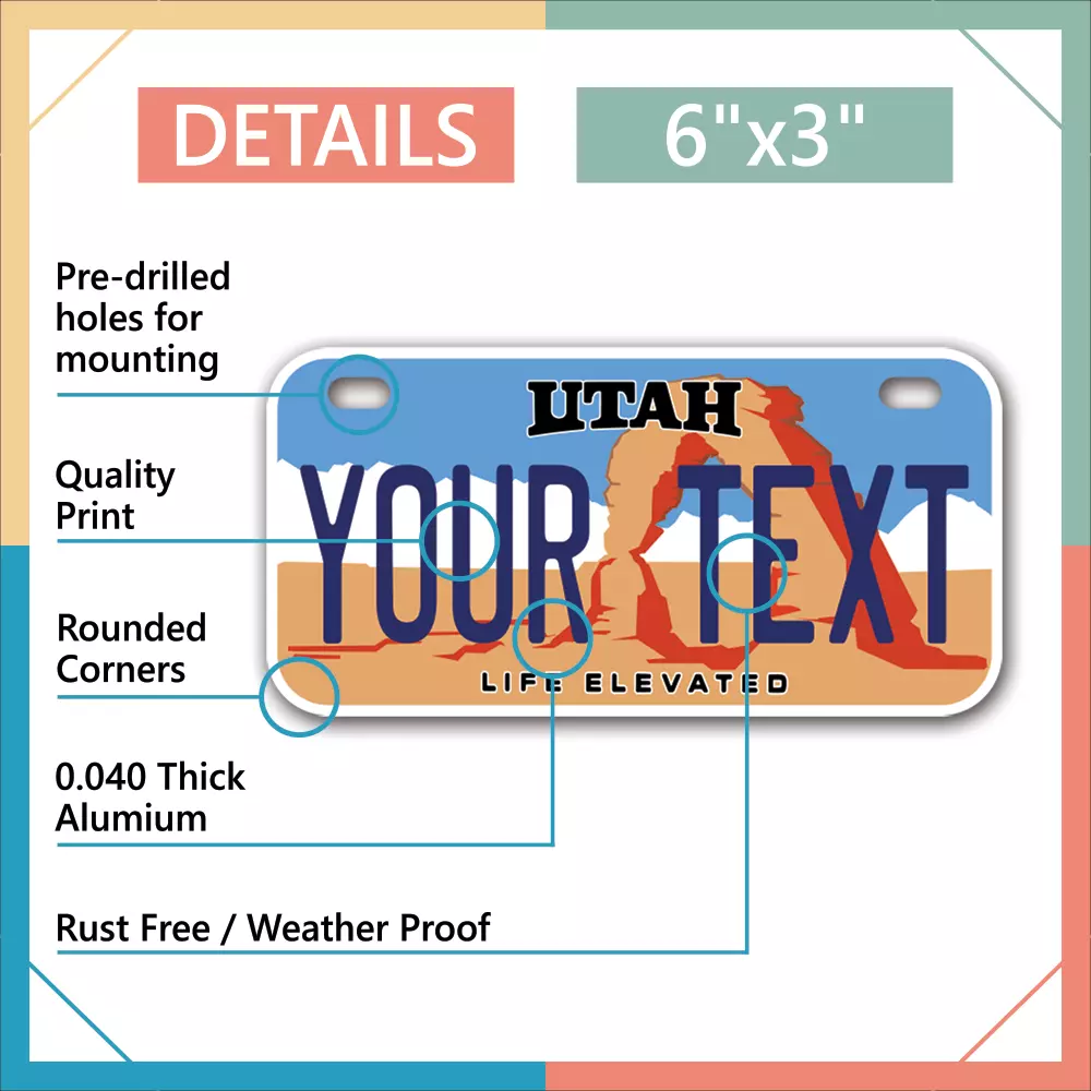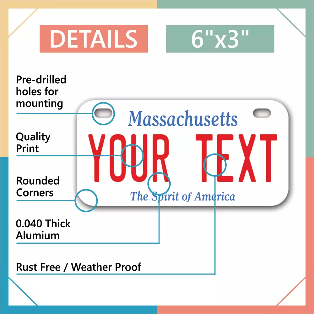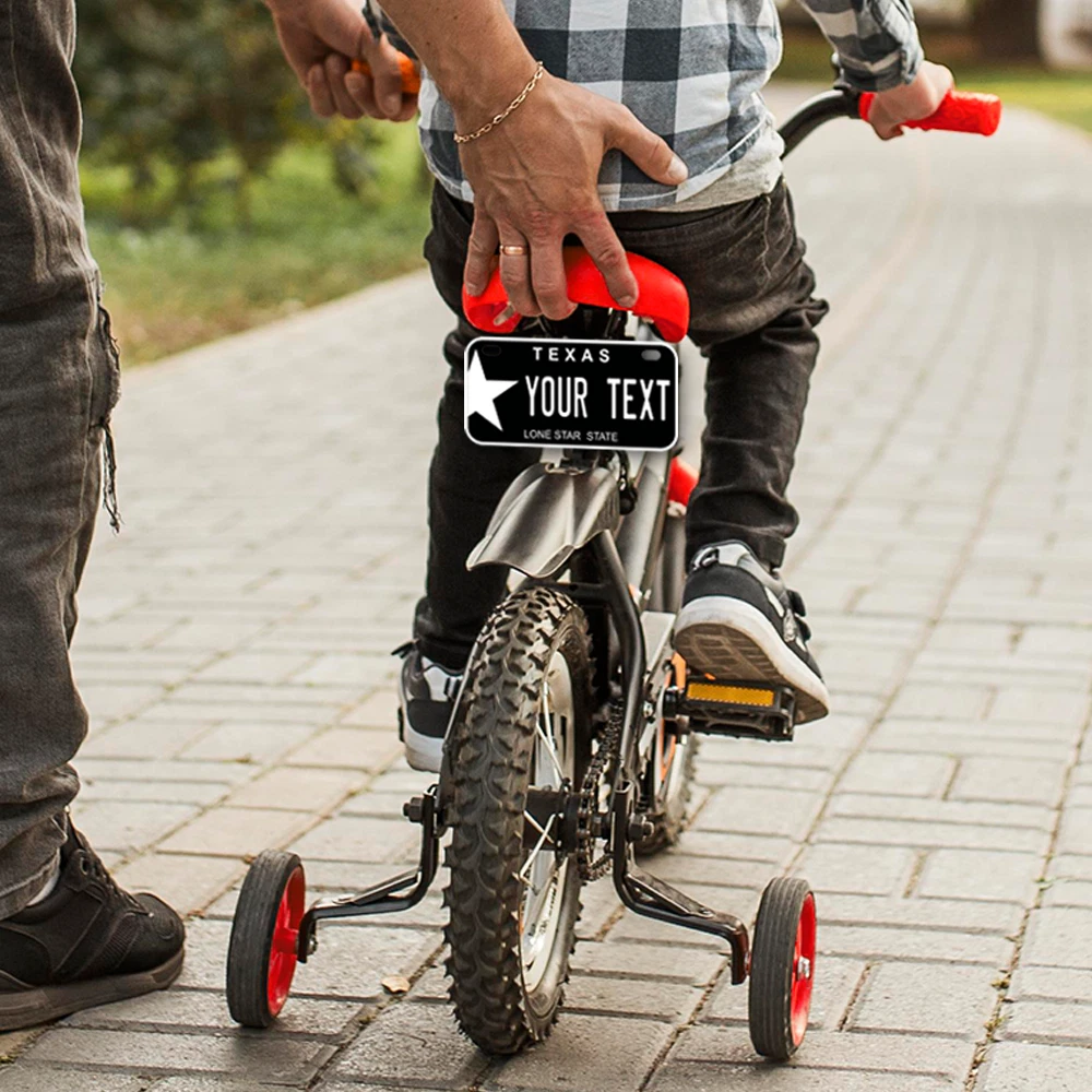 Our LICENSE plates are the most unique souvenirs from the United States, Choose between 50 states and 3 different sizes. Cannot be used in place of a state issued plate. IMPORTANT DESCRIPTION • Plates are made using High quality thick 040 rust free Aluminum. • Our plates are printed flat, not raised. The customizing is done using the latest UV Laser technique for weatherproof and high-quality finish. • 100% made in USA. • Standard car plate has four holes and can be used for trucks, motor homes, and more • M otorcycle plates have 2 holes on top for mounting and can be used on ATVS, Mopeds, Snowmobiles, wheelchairs and golf carts • B ike plates have two holes on top and can also be used for toy cars, wagons, electric toy cars, tricycles and more • Write your text in the personalization section. The text will be copied and pasted on the license plate as sent, so make sure of the spelling, punctuation, capitalization, etc. If you have any question regarding your text or you would like a preview, please let us know by adding a note or contacting Alabama | Alaska | Arizona | Arkansas | California | Colorado | Connecticut | Delaware | Florida | Georgia | Hawaii | Idaho | Illinois | Indiana | Iowa | Kansas | Kentucky | Louisiana | Maine | Maryland | Massachusetts | Michigan | Minnesota | Mississippi | Missouri | Montana | Nebraska | Nevada | New Hampshire | New Jersey | New Mexico | New York | North Carolina | North Dakota | Ohio | Oklahoma | Oregon | Pennsylvania | Puerto Rico | Rhode Island | South Carolina | South Dakota | Tennessee | Texas | Utah | Vermont | Virginia | Washington | West Virginia | Wisconsin | Wyoming