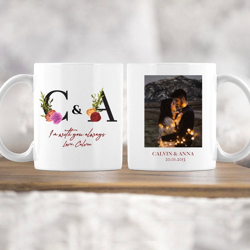 Personalized Couple Mug Monogram Floral Alphabet Custom Photo & Text Anniversary Gift Valentines Gift For Him Product Details.. This high quality 11oz. ceramic white mug has a premium hard coat that provides crisp and vibrant color reproduction sure to last for years. Perfect for all hot & cold beverages. The highest quality printing possible is used. It will never fade no matter how many times you wash it. Material: 100% Ceramic. Print both sides. Dishwasher and Microwave Safe. High Gloss + Premium White Finish. Printed in the U.S.A. Personalized & Custom. We support personalized and custom mug to add custom, when placing an order, you can add notes to the "order note" in shipping address section. Also you can contact us directly via message. Shipping Info. Ready to ship in 1 to 2 business days, All products are made-to-order and proudly printed in the United States. Shipped by USPS and DHL, You will receive your order in 5-7 days. Replace & Refund. All products are defective during shipping broken, chipped will be replaced free of charge. You are not satisfied with the product, we will refund 100% money to you. If any other issues arise, please do not hesitate to message, we would be more than happy to assist you.