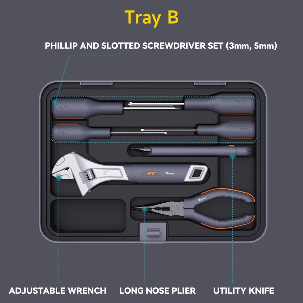 【FULL FUNCTIONAL MULTI-TOOL KIT】 This 3.6V electric screwdriver tool kit comes with 36 S2 screwdriver bits, 2 magnetic nut screwdriver bits, 2 long screwdriver bits, 6 different sizes of hexagonal drills (Φ2.5mm and Φ3.5mm), as well as 10 commonly used sockets (10mm, 9mm, 13mm, etc.) and more, which can satisfy different home repairs, automotive maintenance and DIY project needs. 【 Free combination】The Modular Toolbox System features 8 customizable compartments—including dedicated layers for screwdrivers, electrical work, woodworking, kitchen maintenance, network repairs, and an expandable storage module—allowing you to purchase and assemble only the components you need to build your personalized toolkit. 【PROFESSIONAL DRILLING & FASTENING TOOLS】 Several types of drill and screwdriver bits are included in the kit to ensure that it can be adapted to different materials and fastening needs. Including hexagonal drill bits for wood, metal, PVC and other materials, as well as precise magnetic screwdriver bits. In addition, the equipped metal pry bar can help users easily pry open various fasteners. 【 Humanized Design and Convenient Storage】All tools are designed with ergonomic handles, which provide a comfortable grip no matter for long time use or delicate operation. The tool kit is equipped with a delicate storage box, and each tool can be neatly placed in the designated location, the storage box is equipped with adjustable dividers, users can according to the size of different tools for reasonable separation, easy to find and organize. 【 Exquisite Gift Options and High Color Value】 It is not only highly practical, but also has a modern, simple and generous appearance design, which is perfectly suited as a gift for holidays, birthdays or Father's Day. The kit can meet your daily maintenance needs and also serve as an ideal gift for your friends, family, or loved ones. -About US Founded in 2012, VIPJQ have professional development and sales, and are involved in various products, providing customers with various high-quality products. Since its establishment, VIPJQ has always adhered to the service concept of "customer first" and the management concept of "pursuit of quality", and is committed to providing customers with high-quality original designs. We commit to provide you the best innovative, quality products & professional services with competitive prices. We value every customer, and we look forward to providing solutions for your business needs to help your business achieve its goals, please contact us immediately! We are all about you! We are a Japanese seller,but with large warehouse in USA. We are profesional on Auto Parts,Car Parts,Motorcycle Parts,3C,other hot sale items and so on. We aim to provide to customers high quality product and best service. -About Shipment&Returns The item usually will be dispatched within 3 days after you ordered.All are free shipping. And it usually takes 3-5 working days to delivery depends on buyers' address or other majeure on the way. If you are not satisfied with the items and want to return the item,we hope you could message us first,we will give you the return details, we think we could give you the best service to save your time and money.Thank you. -About Feedback&Customer Service If you are enjoy your shopping here,not only enjoy the items but also the service,we are appreciate you could give us a 5-star feedback. If you are not satisfied with the item,before you give us the negative feedback,we hope we could give you the best solution through our commutication. We think we could do it if you give us the chance.Thank you.