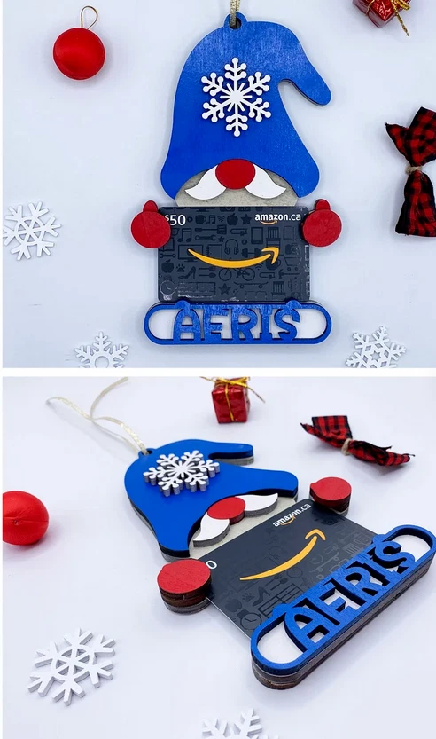 - Customized Gift Holder Ornament - Made of Maple Wood and Hand Painted - Personalized with Person's/Child's name - Comes with red ribbon for hanging ****DOES NOT INCLUDE GIFT CARD.**** - PLEASE DOUBLE CHECK your ship to address & customization! We try to ship out as quickly as possible and once it's created, it can't be changed. If you don't want a name to be included, simply write in 'Plain' or 'Generic' and you will receive a basic gift holder ornament Please Double check the spelling!