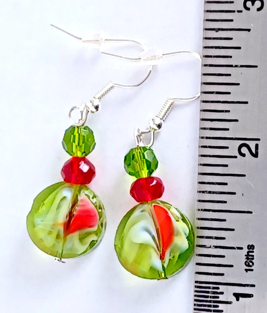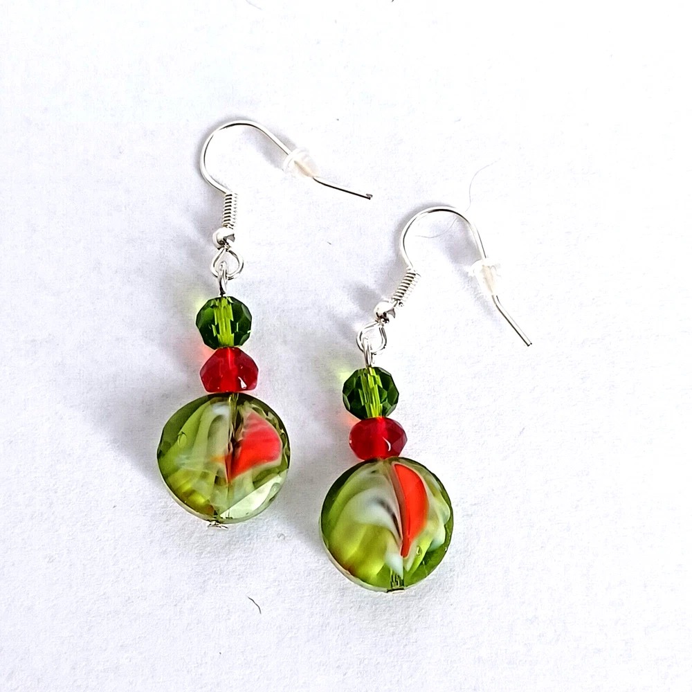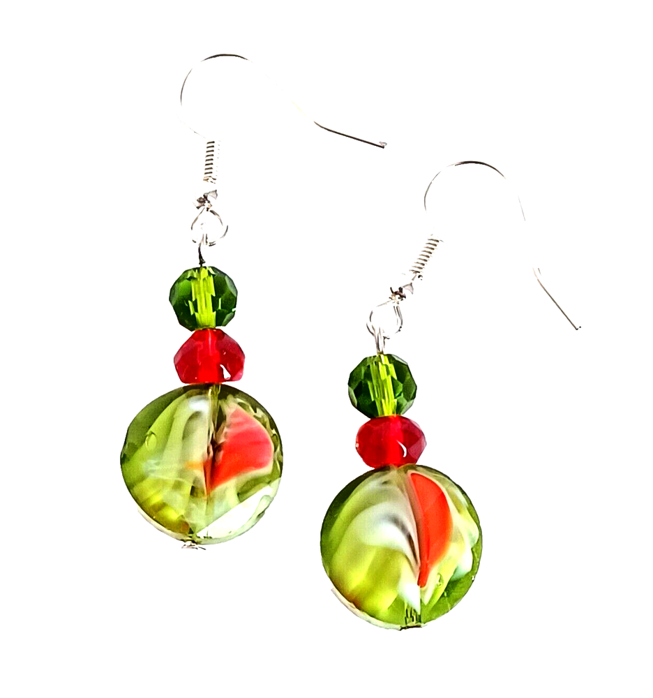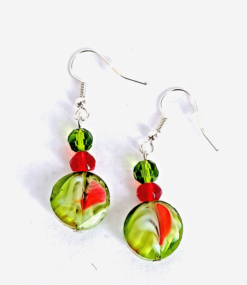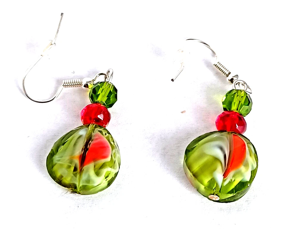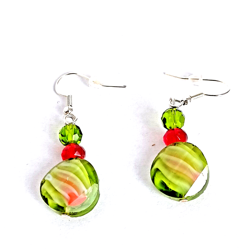 Add a pop of color to your jewelry collection with these stunning multicolor glass earrings. The round, cut faceted beads feature a beautiful green, red, and white swirl center, adding a touch of beauty. The dangle/drop style with hook closure makes them easy to wear for any occasion. Made of high-quality glass material, these earrings are sure to last for years to come.