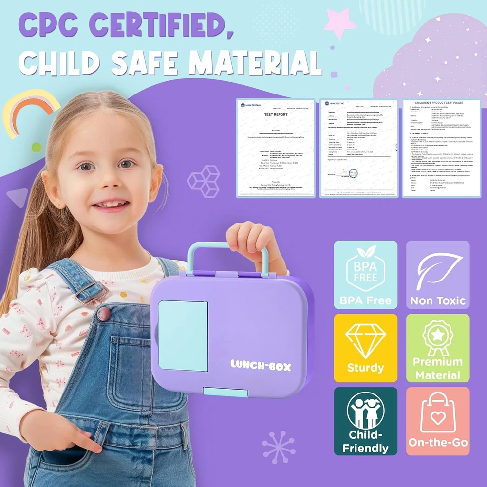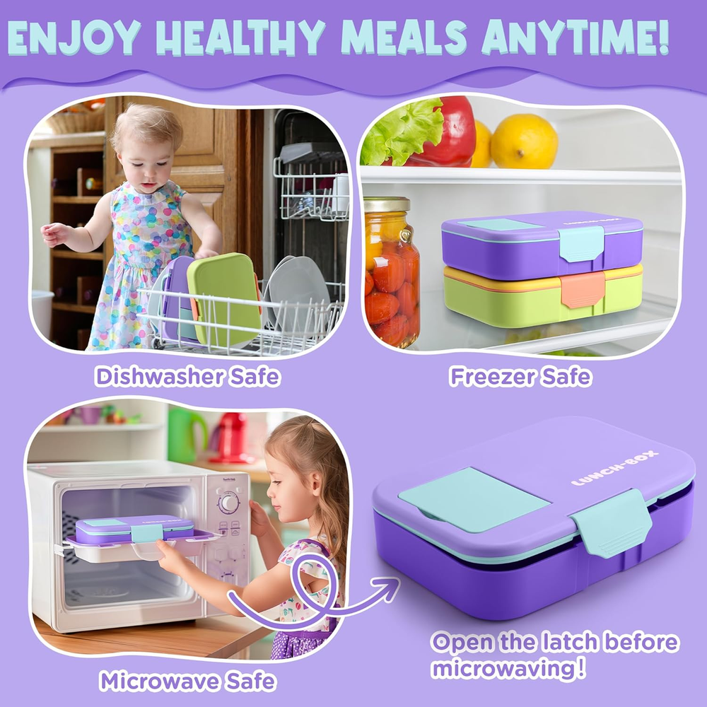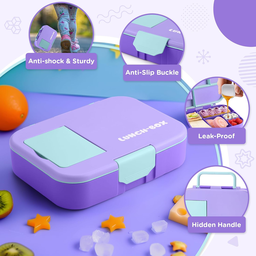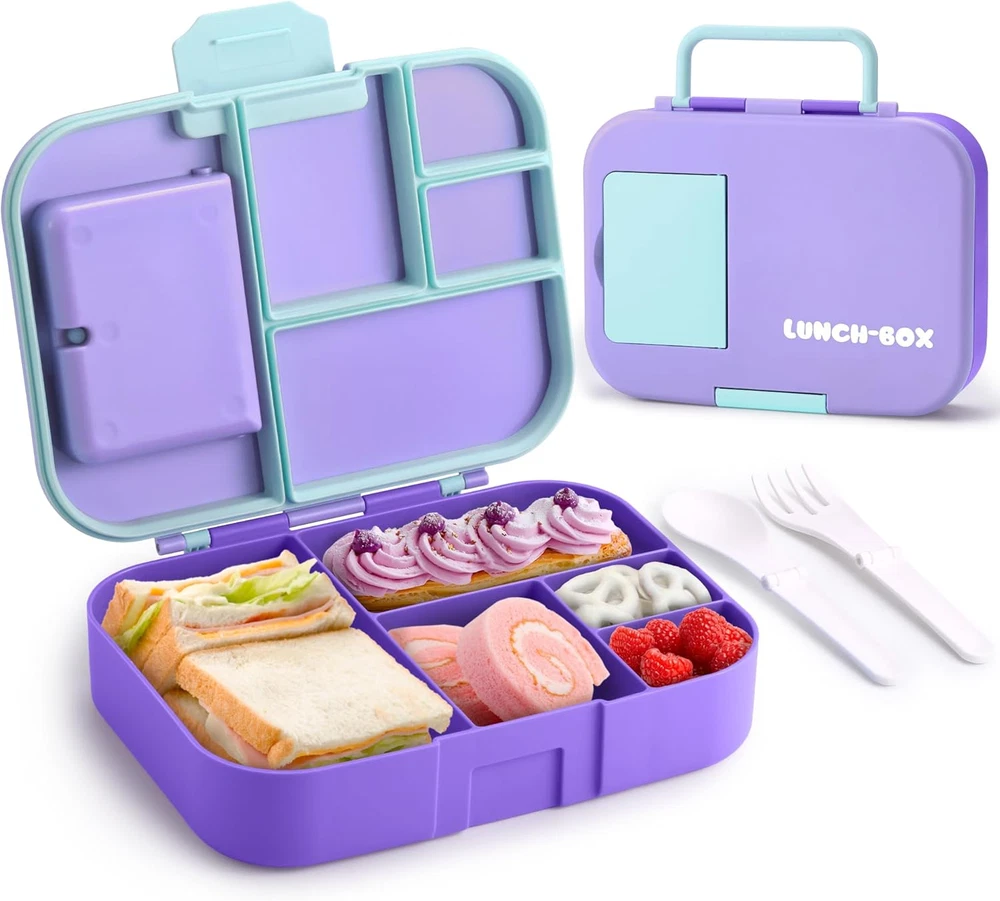 Kawaii Lunch Box Set for Kids: This bento box set includes a 1300ml (44oz/5.5-cup) lunch box, a sauce cup, a foldable fork and spoon, and a beautifully designed gift box—everything your child needs for school or outings! Vibrant Design for Fun Mealtimes: With bold purple and blue colors, this lunch box makes mealtime exciting! The five compartments are perfect for colorful, balanced meals, encouraging your child to try new foods and share with friends—making every meal an adventure! Microwave & Dishwasher Safe with Removable Silicone Seal: Reminder: When microwaving, keep the lid loose to allow steam to escape. The removable silicone seal is designed for easy cleaning but may require a bit of patience or help from parents when reinstalling to ensure it fits snugly for leak-proof protection. Certified Child-Safe & Kid-Friendly: Safety is our top priority! This Lunchable Container is CPC-certified, ensuring it is non toxic. The secure clasp and easy-to-carry handle makes it simple for kids to open, close, and take on the go. Plus, it fits easily into most standard lunch bags. We’re Here to Help: If you notice any damage or missing parts, please don't hesitate to let us know. We're committed to resolving any issues quickly and ensuring your experience with our product is a positive one. Bento Box for Kids, Cute Lunch Box Containers for Girls, Toddler School Lunch Box for Daycare with 5 Compartments, Kids Lunchbox Container with Utensils and Sauce Cup, Purple