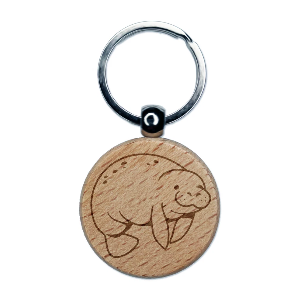 Cute Chubby Manatee Engraved Wood Round Keychain Tag Charm