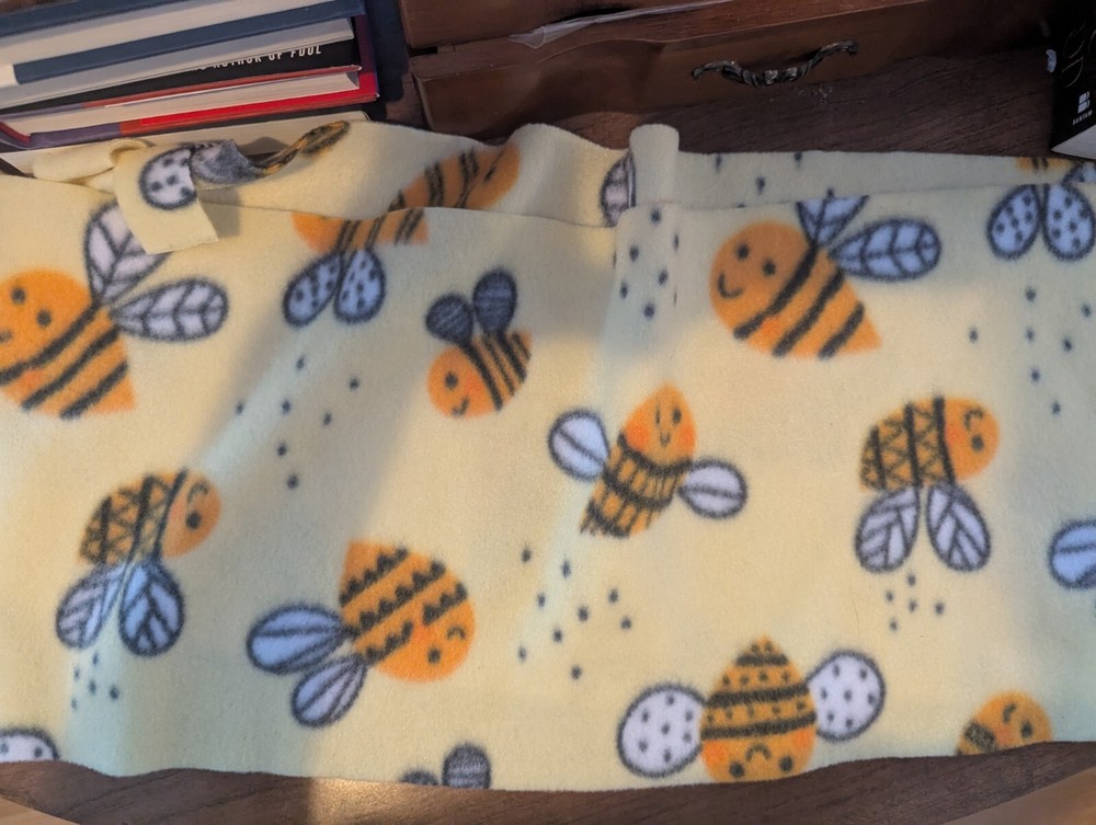A thick winter scarf, fleece material made from a cotton and polyester blend. Features cute bee pattern on the scarf. This scarf is handmade and has never been worn, it's new. Has cute fringe at ends of the scarf. I tried to show it all in pictures, it's a bit longer so can be wrapped twice.